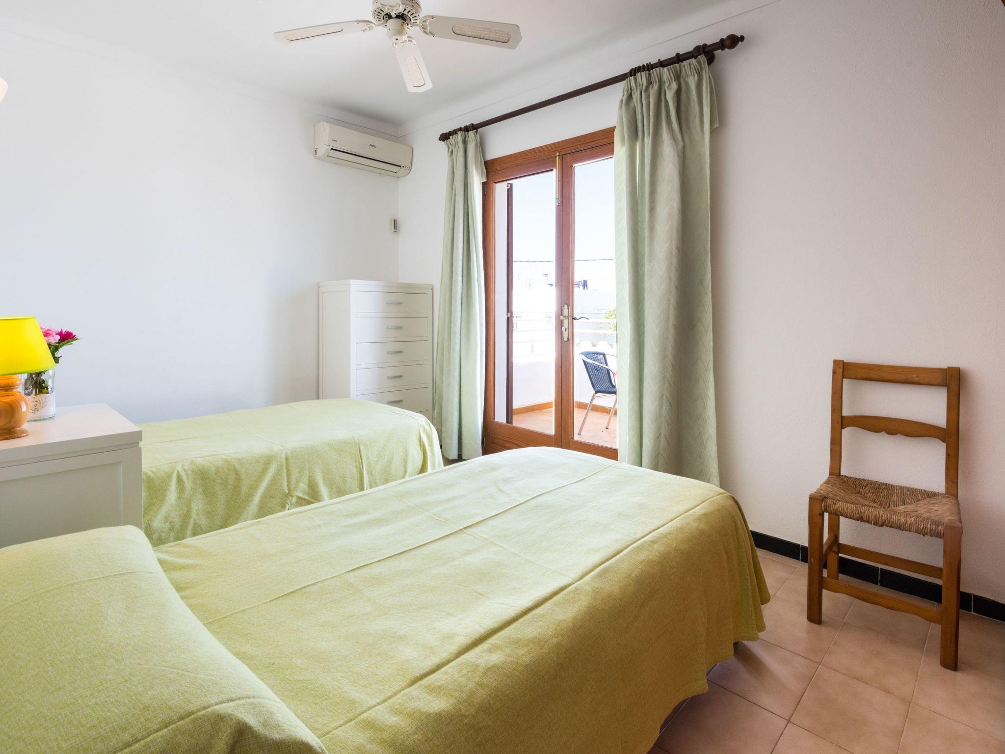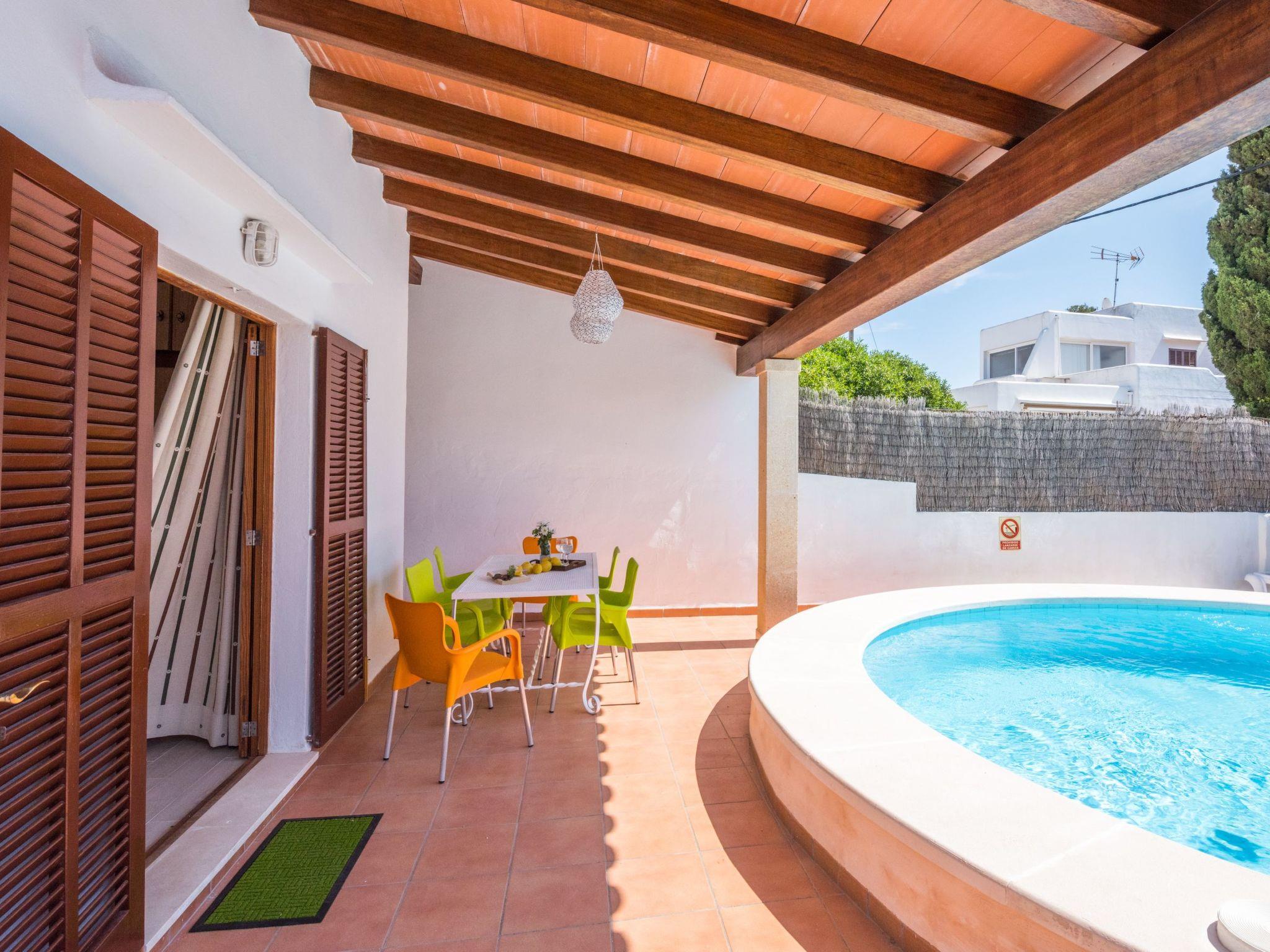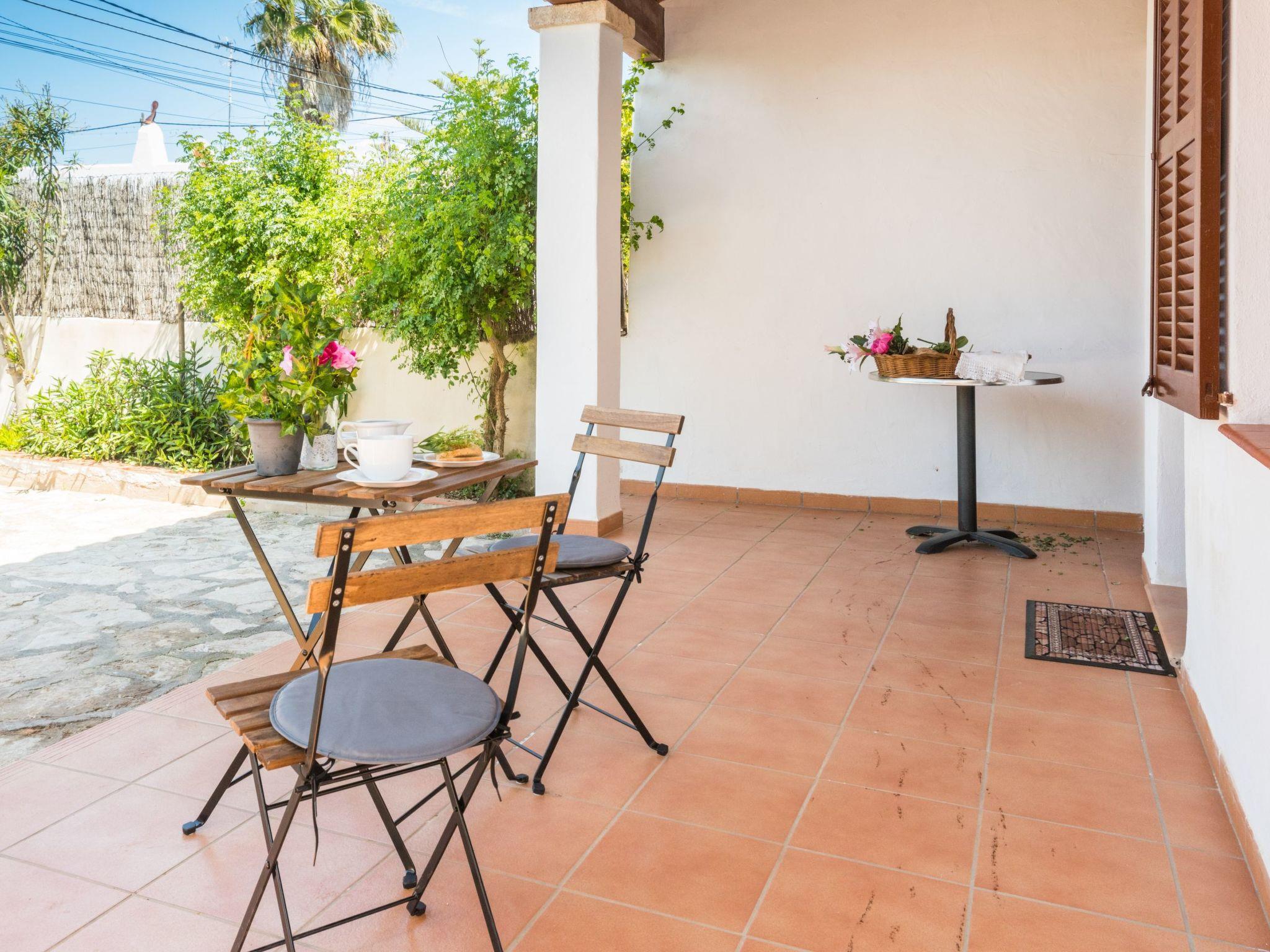 With its white exterior walls, the Cubells holiday home is in the traditional Ibiza style. It has a large entrance terrace as well as a further covered terrace at the rear and a small, well-kept garden with a round pool. On the ground floor is the living and dining area with a modern and well-equipped American kitchen. There is also one of the bedrooms with direct access to the garden and a bathroom. There are two bedrooms on the upper floor, one of which has a balcony. The bedrooms on the upper floor share a modern shower room. All bedrooms are equipped with ceiling fans. In addition, all bedrooms are equipped with air conditioning with fixed operating hours from 14:00 to 16:00 and 21:30 to 9:00.