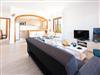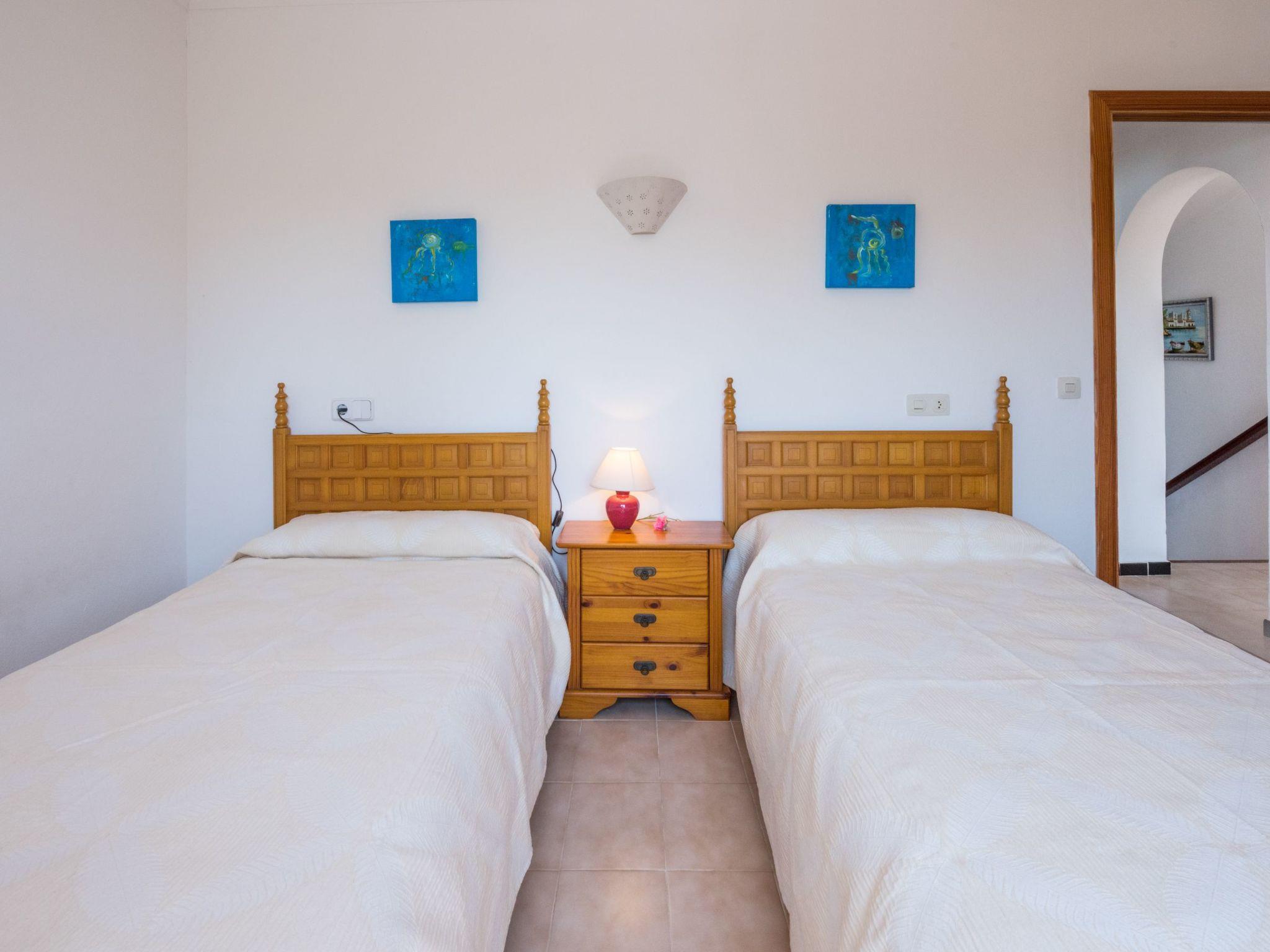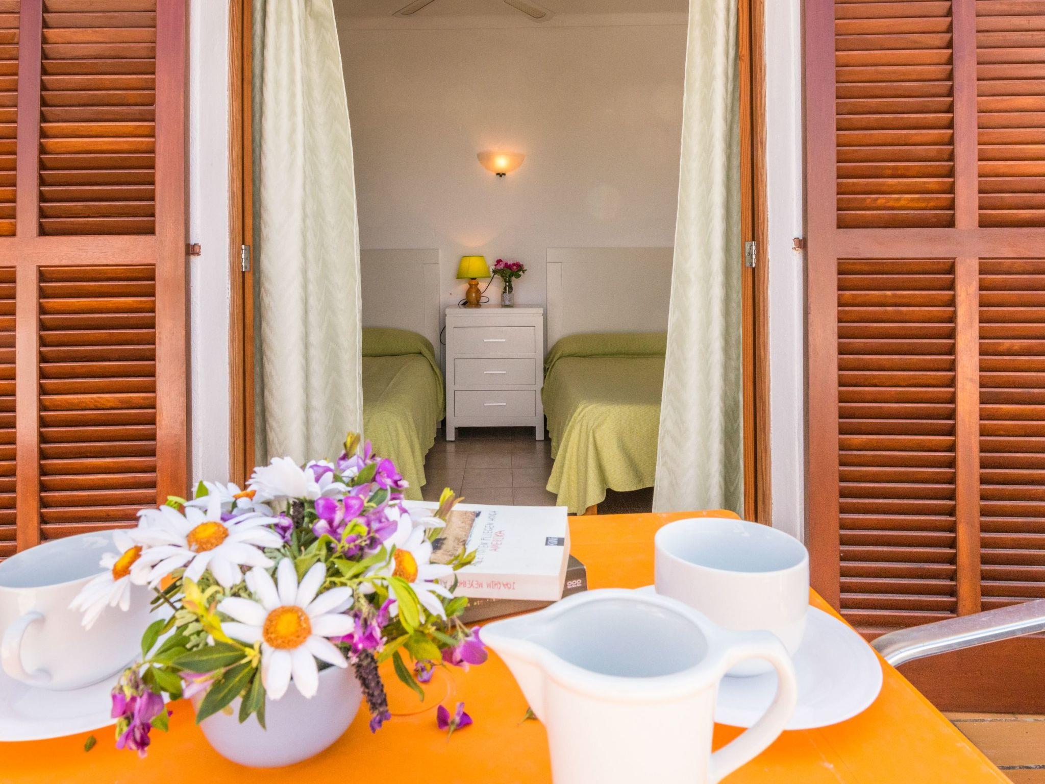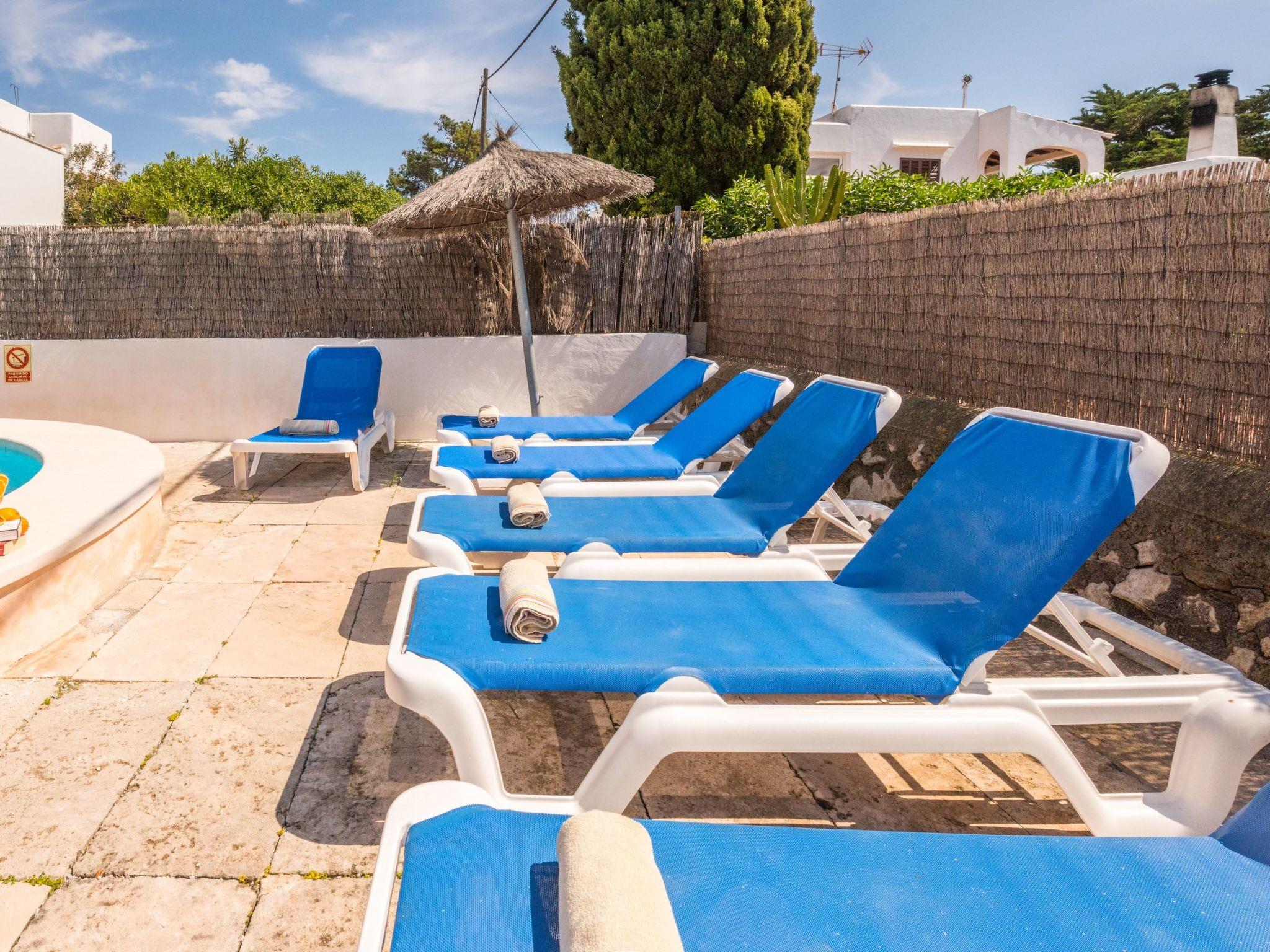 With its white exterior walls, the Cubells holiday home is in the traditional Ibiza style. It has a large entrance terrace as well as a further covered terrace at the rear and a small, well-kept garden with a round pool. On the ground floor is the living and dining area with a modern and well-equipped American kitchen. There is also one of the bedrooms with direct access to the garden and a bathroom. There are two bedrooms on the upper floor, one of which has a balcony. The bedrooms on the upper floor share a modern shower room. All bedrooms are equipped with ceiling fans. In addition, all bedrooms are equipped with air conditioning with fixed operating hours from 14:00 to 16:00 and 21:30 to 9:00.