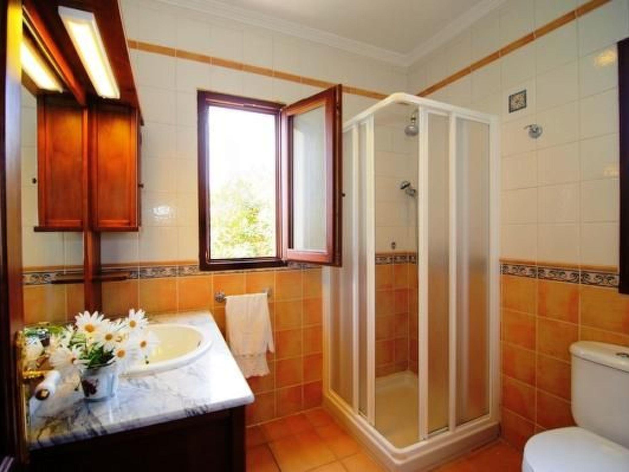 Finca From the entrance area, you enter the bright dining area with sliding glass doors to the pool terrace. An open archway leads to the living area with cosy sofas, satellite TV, DVD and fireplace. The modern kitchen is superbly equipped. Next door is a bedroom with two single beds, bathroom and private access to the pool terrace. Upstairs is the master bedroom with two single beds, dressing area, en suite shower room and private sun terrace. The third bedroom, also with two single beds and dressing area, has an en-suite shower room. There is also a service room with washing machine in the basement. The house is very tastefully furnished to a high standard and equipped with ceiling fans and underfloor heating.