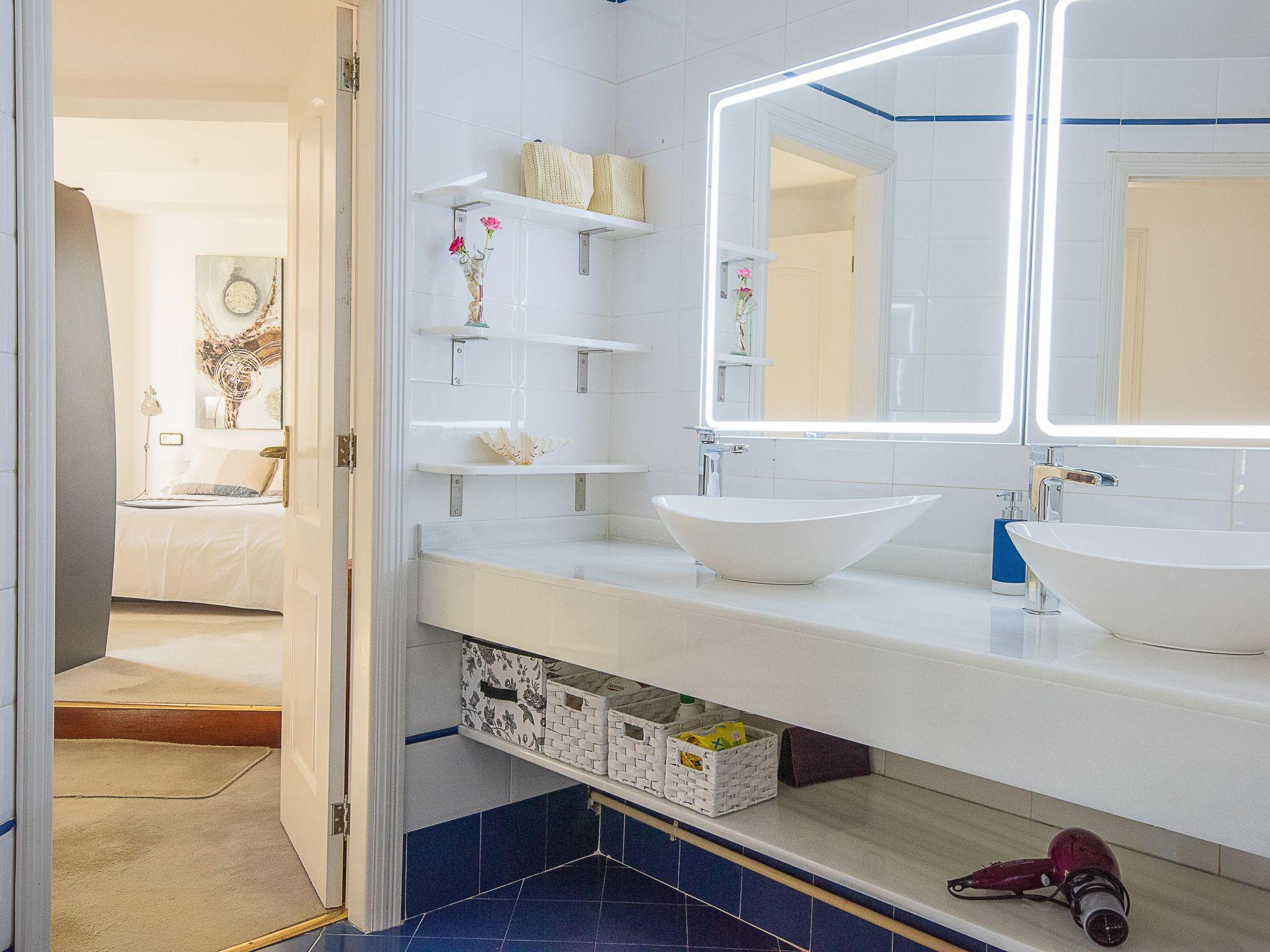 Villa distributed on two levels. On the ground floor are the living room and the dining room, which has access to the back porch, the kitchen is next to the dining room. There are also two bedrooms on this floor. One with two single beds and en suite shower room, the second bedroom is also equipped with two single beds, next to the bedroom there is a separate bathroom with bathtub. On the first floor there is a second living room with access to a small terrace and the master bedroom. This bedroom has a double bed, an open dressing room and an en suite bathroom with a bathtub and separate shower.