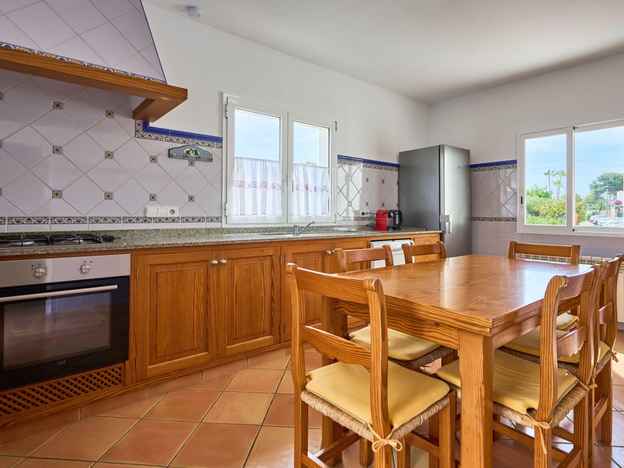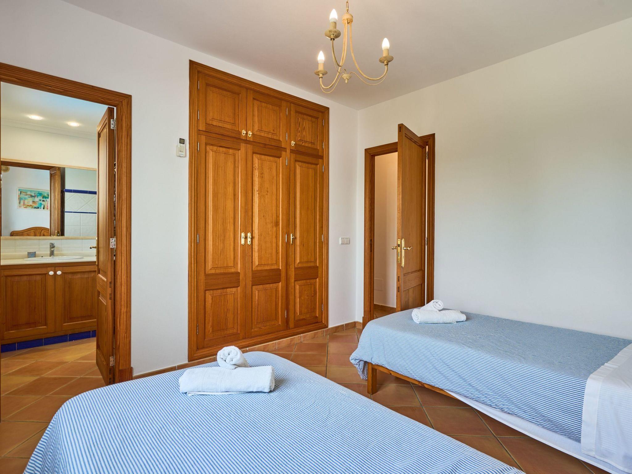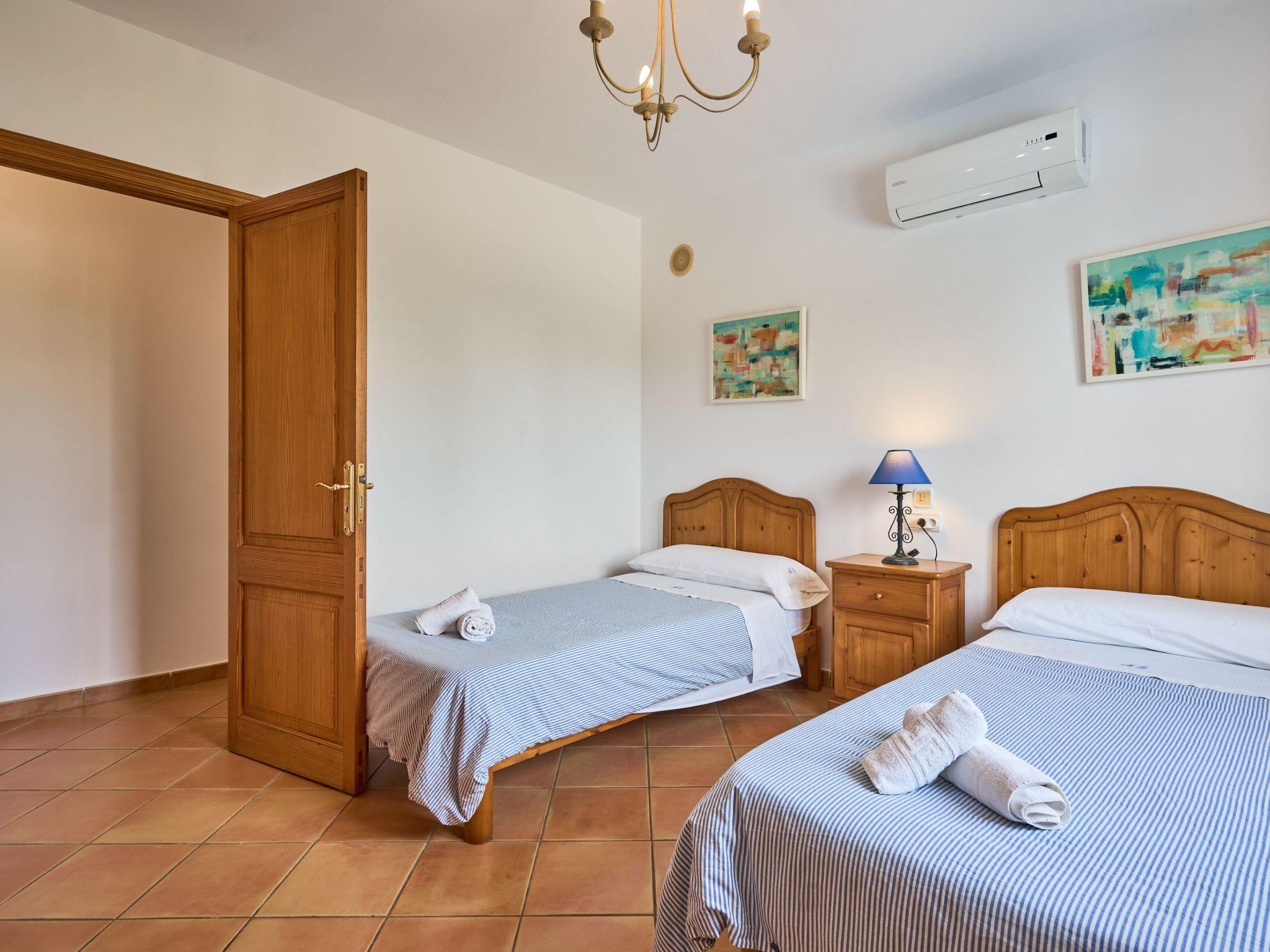 Holiday home on two floors with lawns, veranda and private pool. The ground floor has a living/dining room. Spacious, well-equipped kitchen with access to the pool area. Utility room with washing machine. One bedroom with double bed and en-suite bathroom with shower. The second bedroom with two single beds and en-suite bathroom with bathtub and two further bedrooms on the first floor. One with a double bed and the other with two single beds. Each with en-suite bathroom with bathtub and access to the terrace. Air conditioning in the bedrooms with fixed limited usage time.