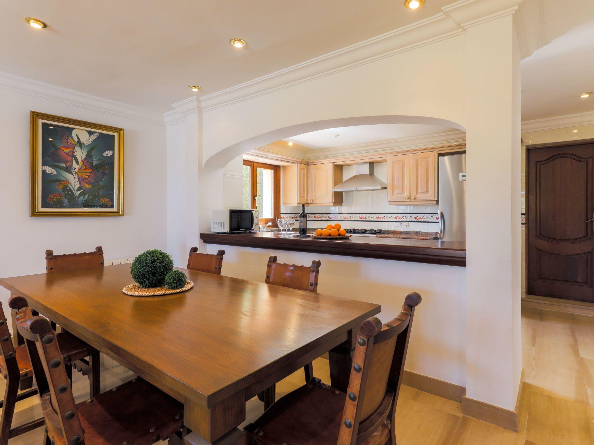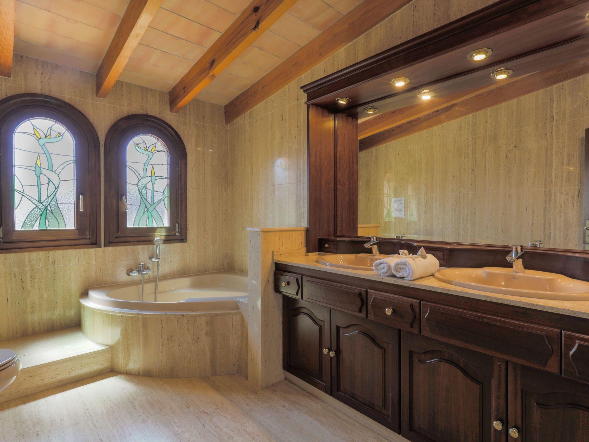 Sivina Sanau is a spacious family villa with an elegant classic style. Marble tiles give the house a pleasantly cool ambience in summer. The large entrance hall leads to an open-plan living and dining area with cosy sofas. Patio doors lead to the garden and the furnished terrace overlooking the pool. The kitchen is well equipped and is separated from the dining area by a breakfast bar. There is a washing machine in the adjoining utility room. One double bedroom and one with two single beds are located on the ground floor and share a large family bathroom with a raised round bath and shower. A further shower room with toilet can be accessed from the outside. A stately staircase with a long suspended chandelier leads to a further living room with views over the garden and pool to the tennis court. Patio doors lead to a sun terrace; ideal for private sunbathing. The master bedroom with double bed has a dressing area. Two further beautiful bedrooms, each with two single beds, have wonderful views over the countryside. On the upper floor there is a bathroom with marble tiles and a round bathtub, and tennis fans have a private tennis court at their disposal. The floodlights are not in operation.