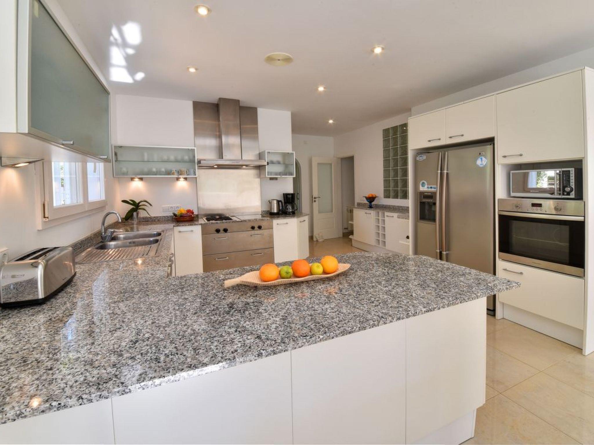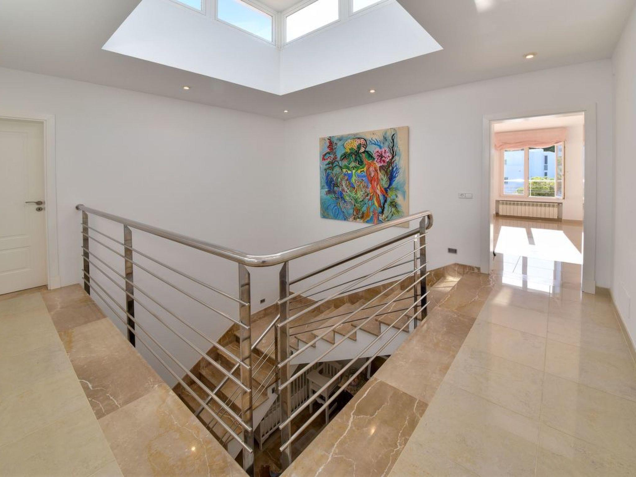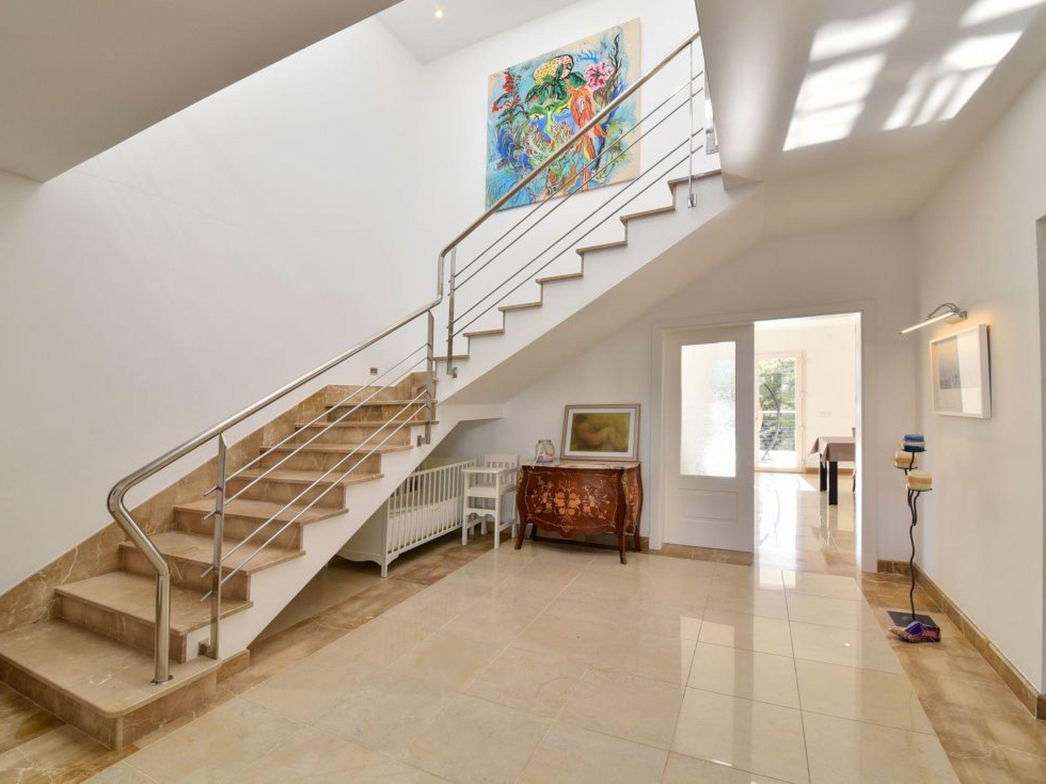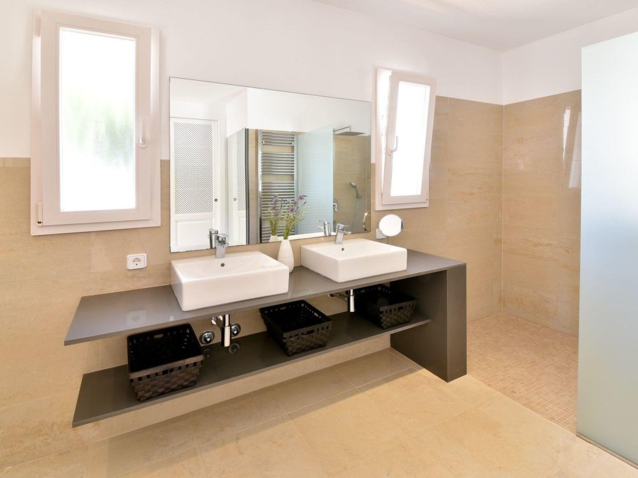 This spacious, light and airy villa consists of several levels. On the street level there is a spacious open-plan living/dining room with access to the covered terrace overlooking the lower pool area - this terrace also offers a vertical awning. The modern and large kitchen is equipped with a further dining table. Utility room and guest WC available. There is also the master bedroom with a double bed and en suite bathroom with separate bath and shower, as well as two twin bedrooms sharing a separate bathroom. On the upper floor there is a very spacious twin bedroom with an open-plan bathroom with shower. This bedroom has its own terrace with a lovely chill-out area and a side view of the small sandy bay of Cala Dor.