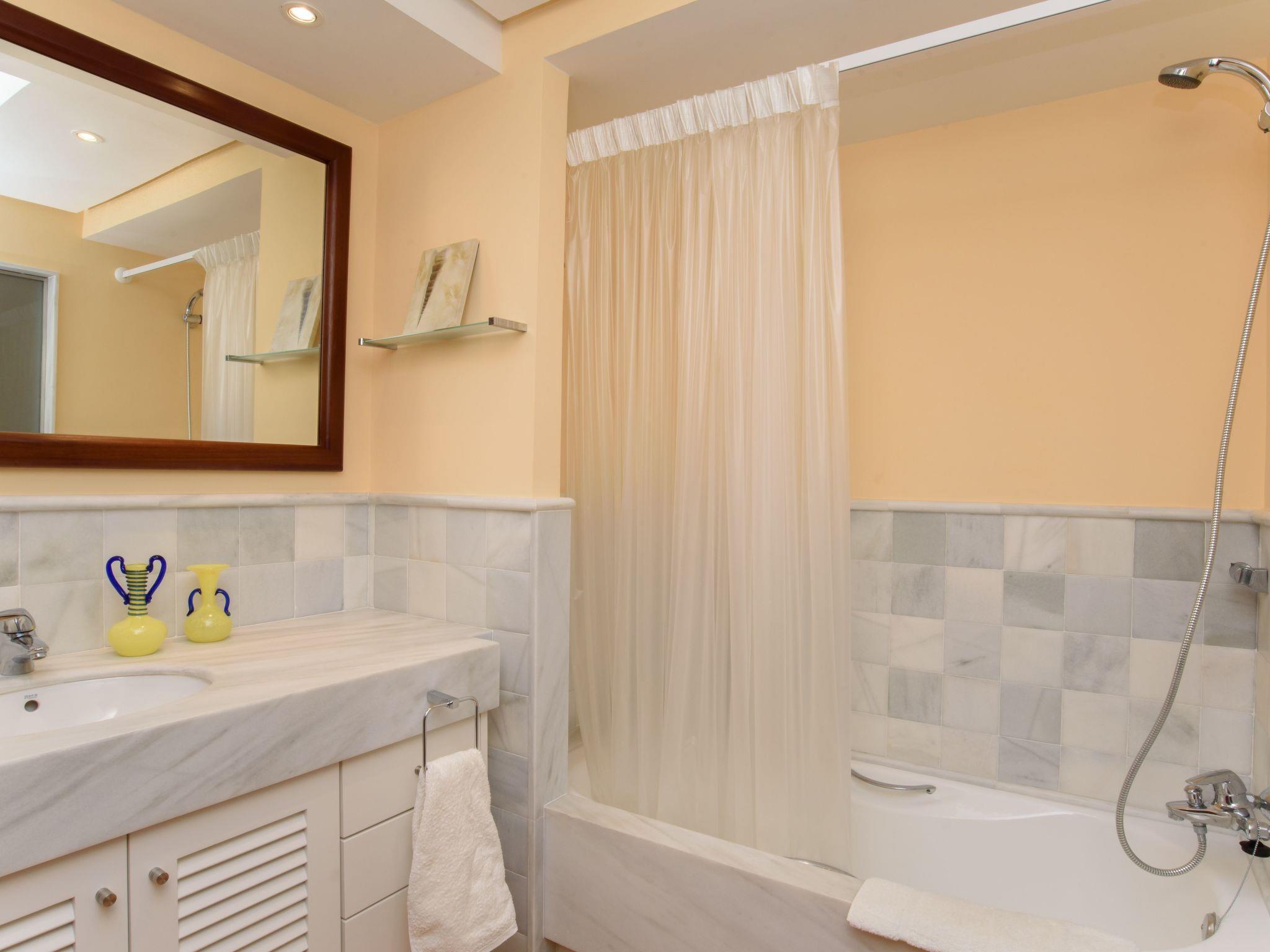 Villa Samar is generously constructed on two floors. The entrance area leads to the left into the open, very spacious living room with large sliding glass doors that open onto the covered terrace and the garden/pool area. The living room flows into the open-plan dining room. Behind it is the fully equipped kitchen with access to the terrace. To the right of the entrance, a corridor leads to two bedrooms, each with two single beds, both with access to the garden and pool and each with a full bathroom en suite. There is also a guest toilet on the ground floor. On the first floor there are two further bedrooms, each with two single beds, access to a large shared balcony/terrace and both with a full bathroom en suite.