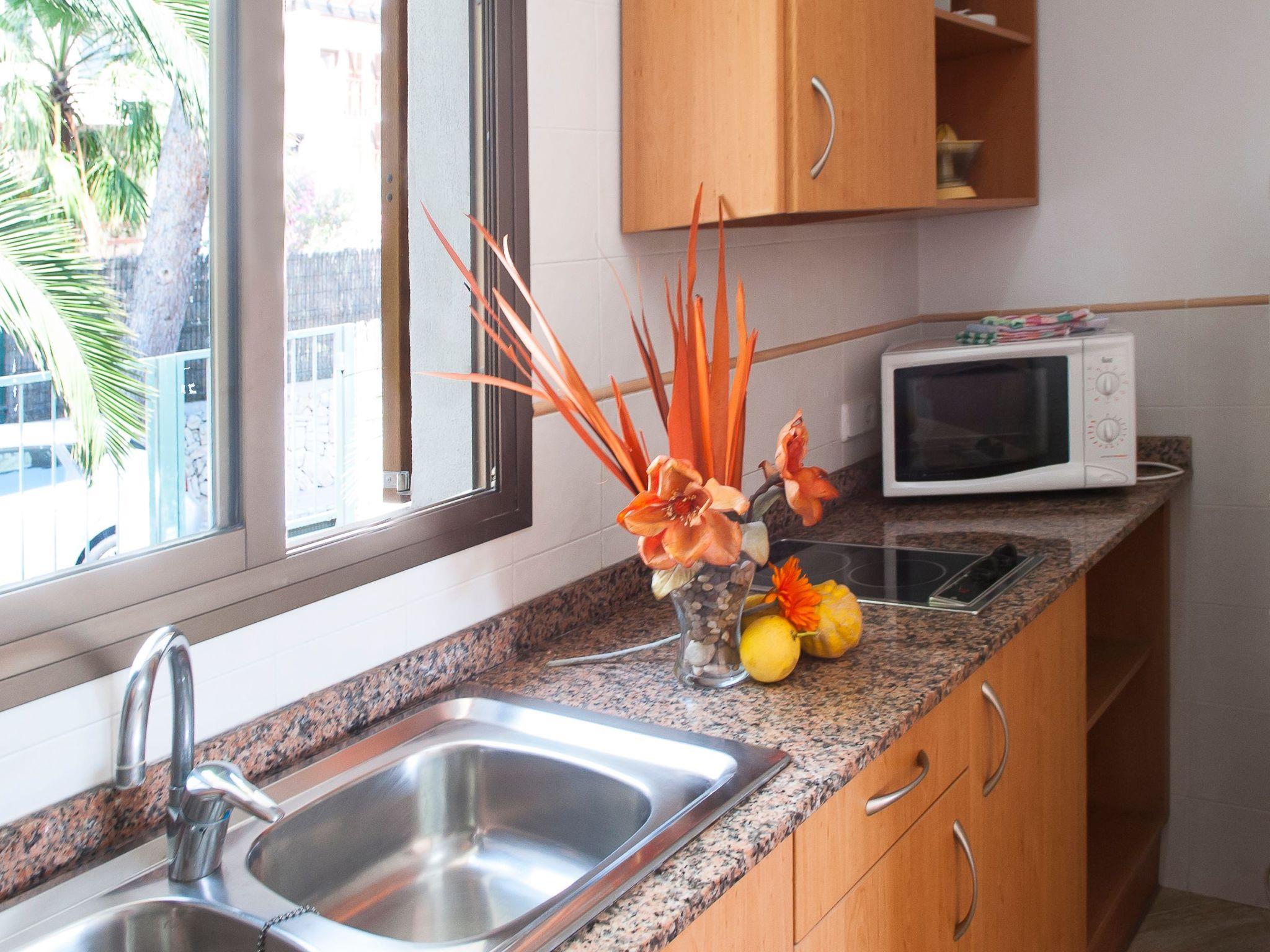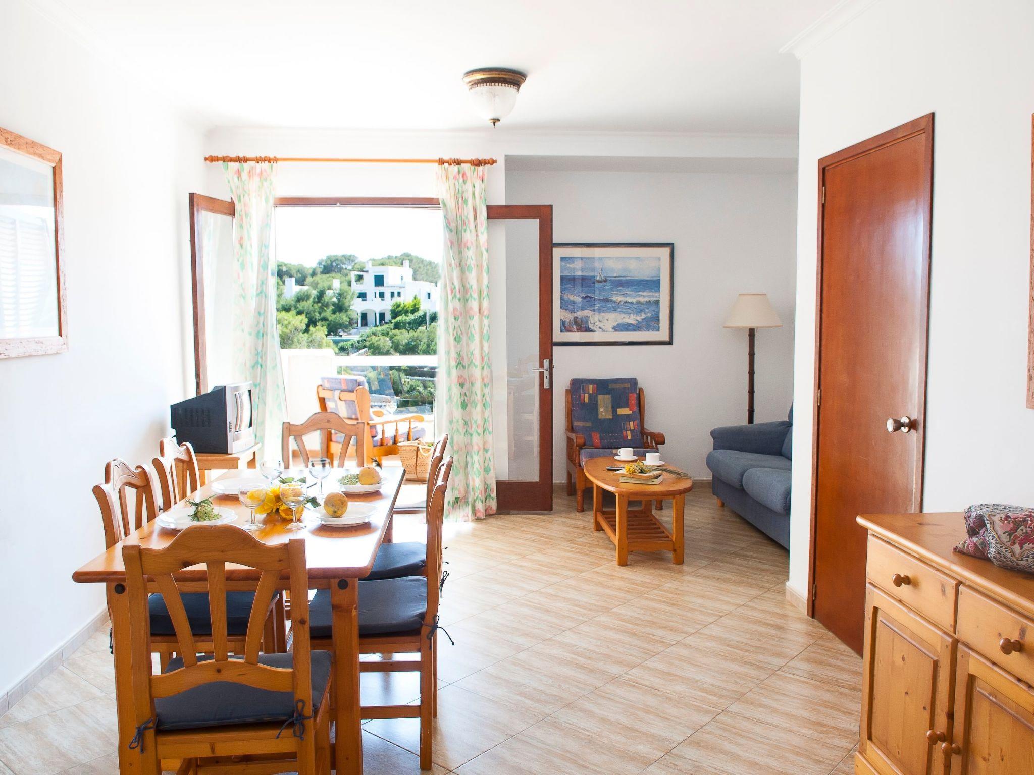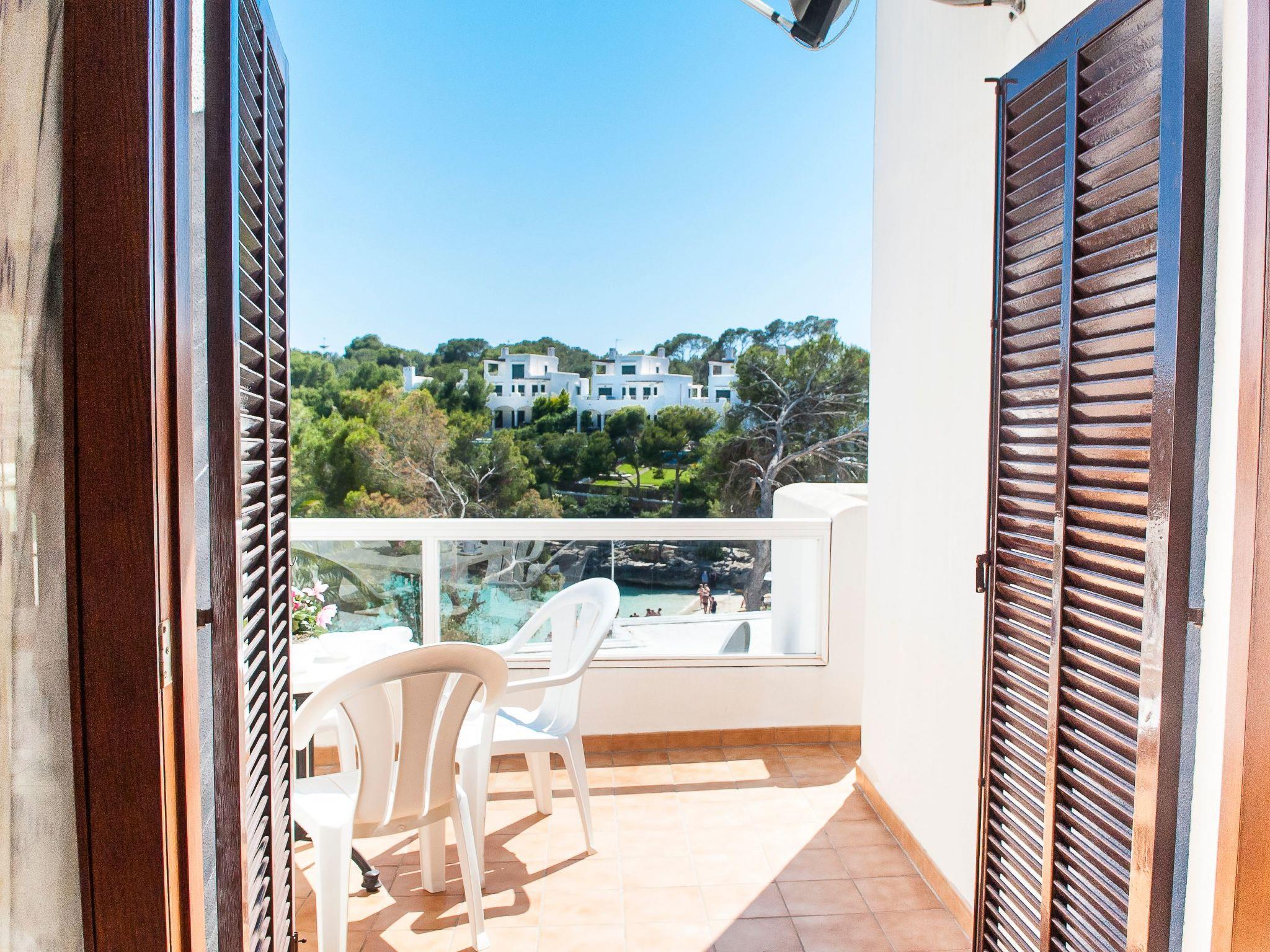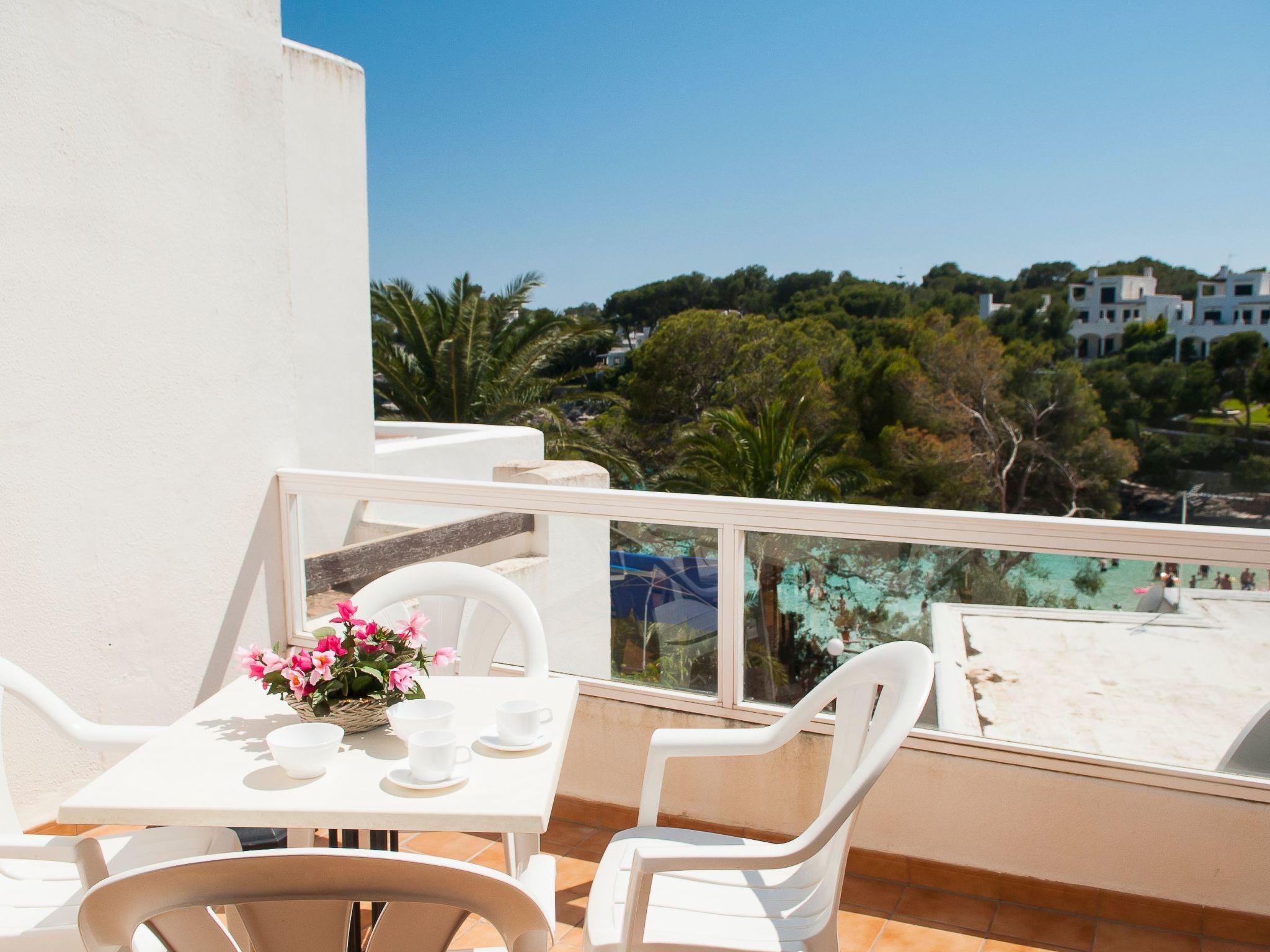 Here you will find shopping streets, restaurants, bars, cafés and the fashionable marina, which is well worth seeing. The bright living/dining area has direct access to the balcony with a partial view of the sandy bay and a small dining table. The compact kitchen is equipped for holiday use. The flat has two bedrooms, each with two single beds and access to the balcony. One bedroom has a bathroom with bathtub, where the washing machine is also located, while the other bedroom has a shower room. The beautiful, large communal pool is located directly above the sandy bay of Cala Gran - ideal for refreshing, sunbathing and relaxing. A path leads from here directly to the sandy bay.