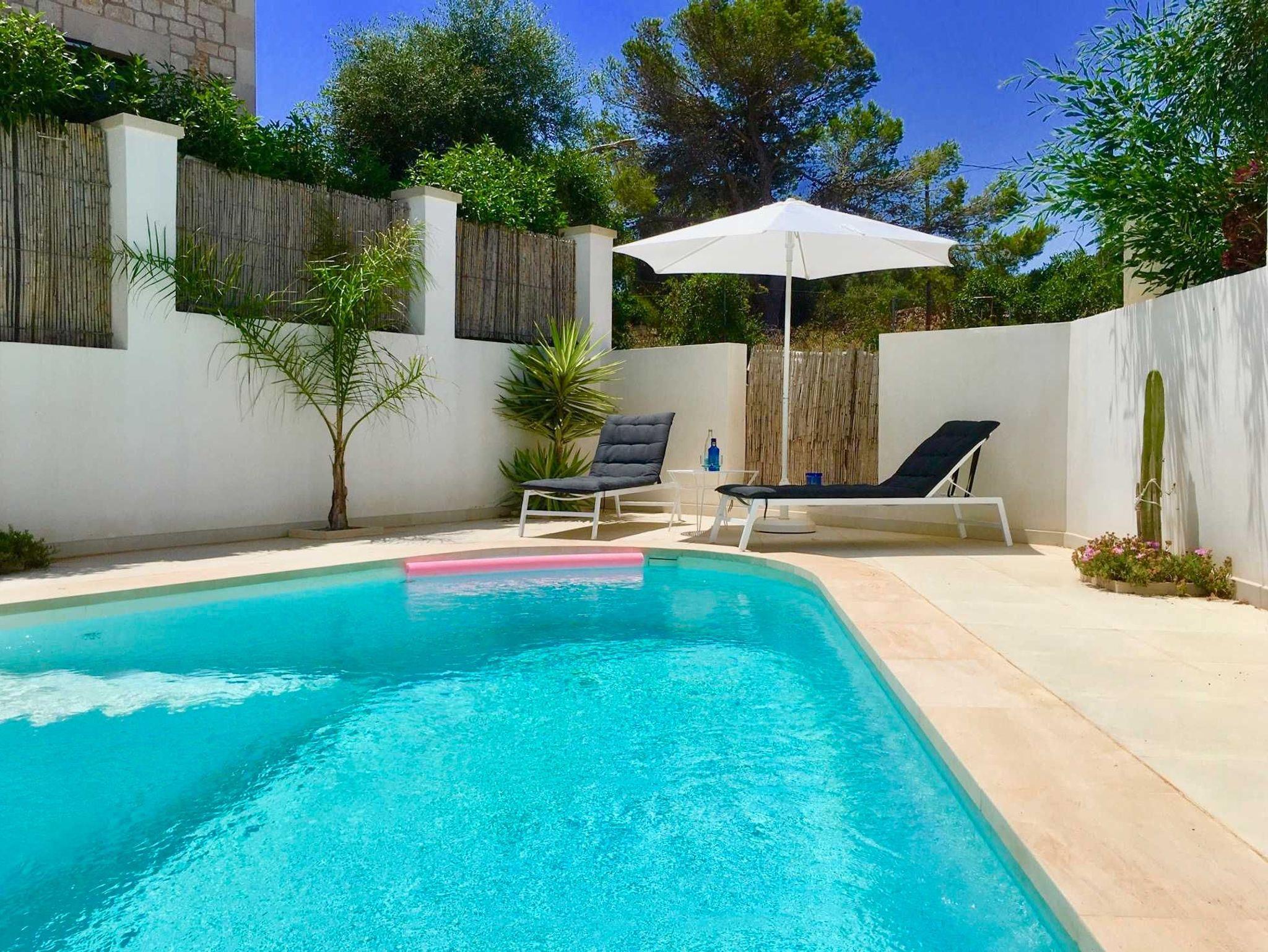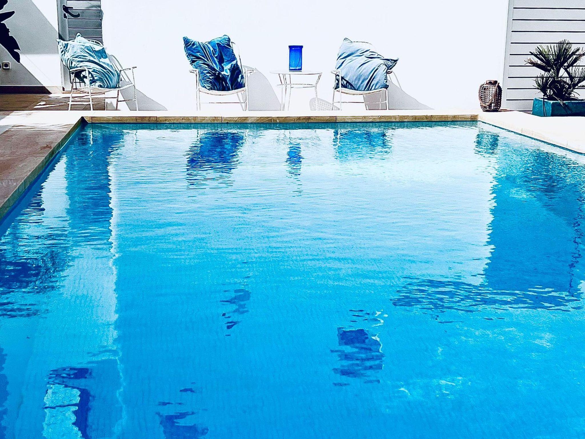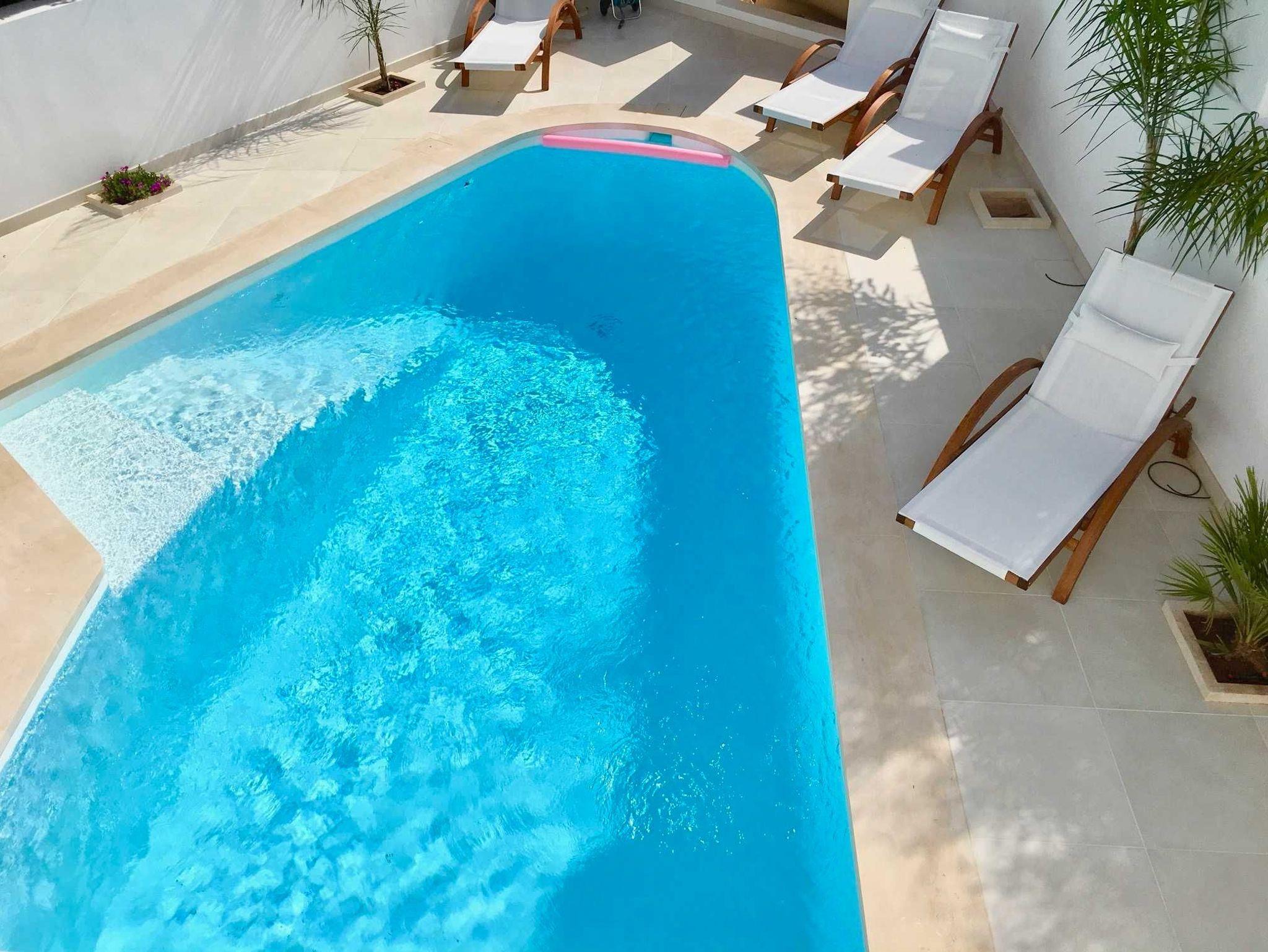 Pool: 3,25 x 7,35 m = ca.25 qm, Tiefe: 1,80 - 2,20 m, Aussendusche, Pooltücher, 4 Sonnenliegen, Terrassenmöbel, 4 Sonnenschirme, Sonnensegel