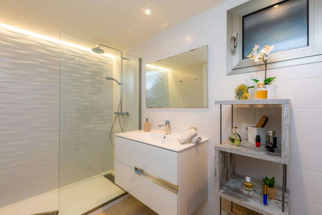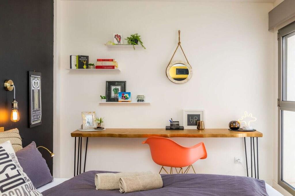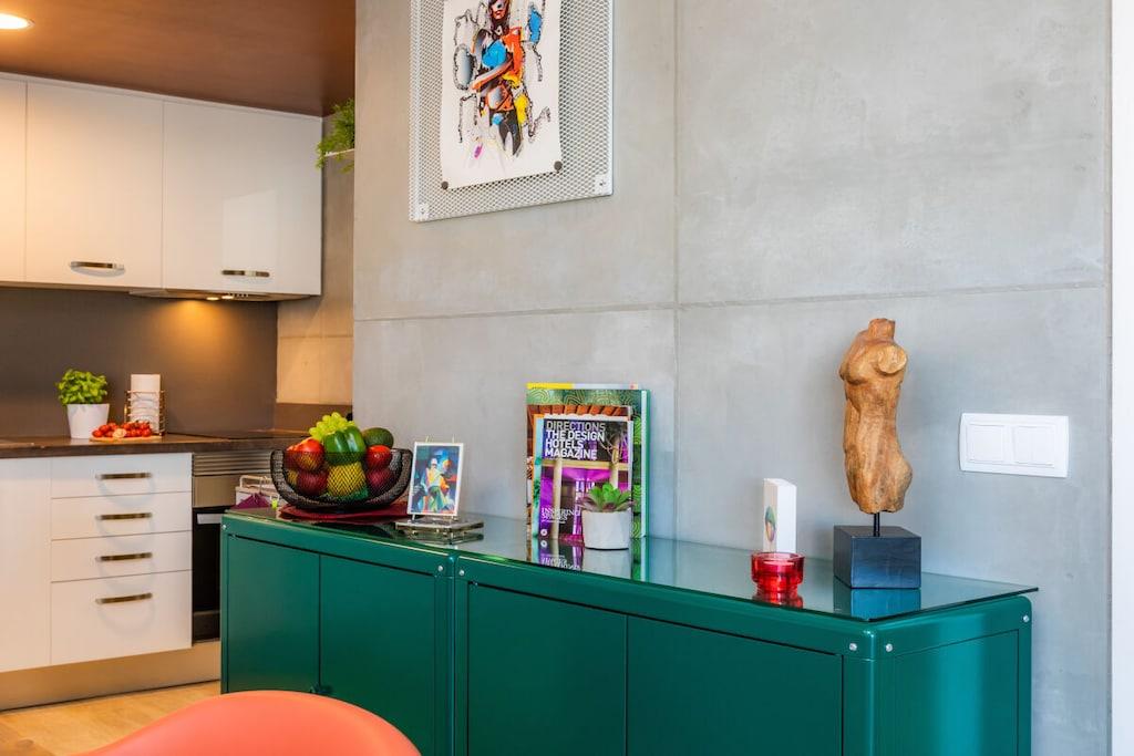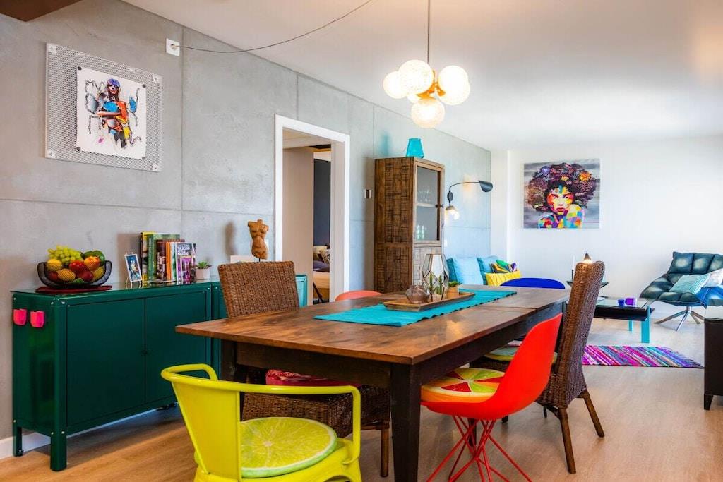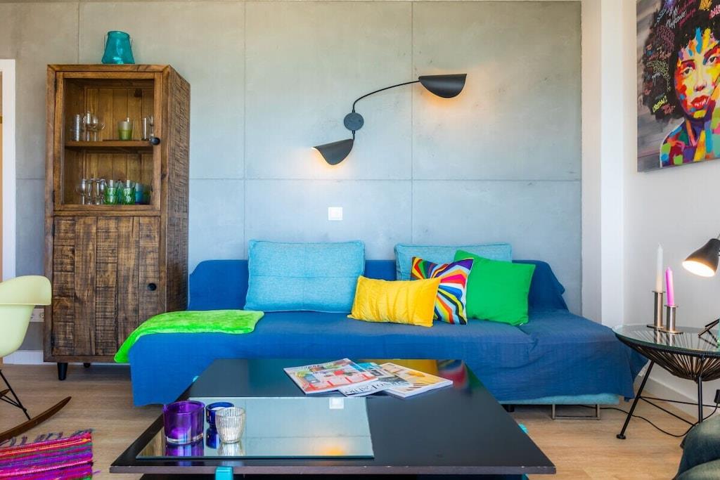 Lev som med venner! Strandferielejlighed i loftstil på 6. sal med majestætisk havudsigt på første linje. For det andet vindstille vestvendt altan. Den 84 m² store ferielejlighed på 6. sal (elevator tilgængelig) har 2 soveværelser, badeværelse med bruser, stor stue/spisestue/køkken, et depotrum og 2 altaner. Den 11 m² overdækkede altan, der støder op til opholdsområdet, ser mod øst over Cala Millor-bugten, men fanger også aftensolen bagtil. Den 4 m² store, solrige og vindbeskyttede vestvendte altan, der støder op til et soveværelse, ser ind mod bjergene. Den lyse ferielejlighed er stilfuldt og kreativt indrettet med stor sans for detaljen efter mottoet "Heavy metal møder funky farver". Begge soveværelser har en 180 x 200 cm dobbeltseng (separate springmadrasser) og stuesofaen er udtrækbar (ca. 150 x 200 cm) - så lejligheden byder på plads til 5 personer. Ferielejligheden tilbyder også bøger (tysk, engelsk), dvd'er, spil, stereoanlæg, Astra-satellitmodtager, fladskærms-tv og gratis WiFi.