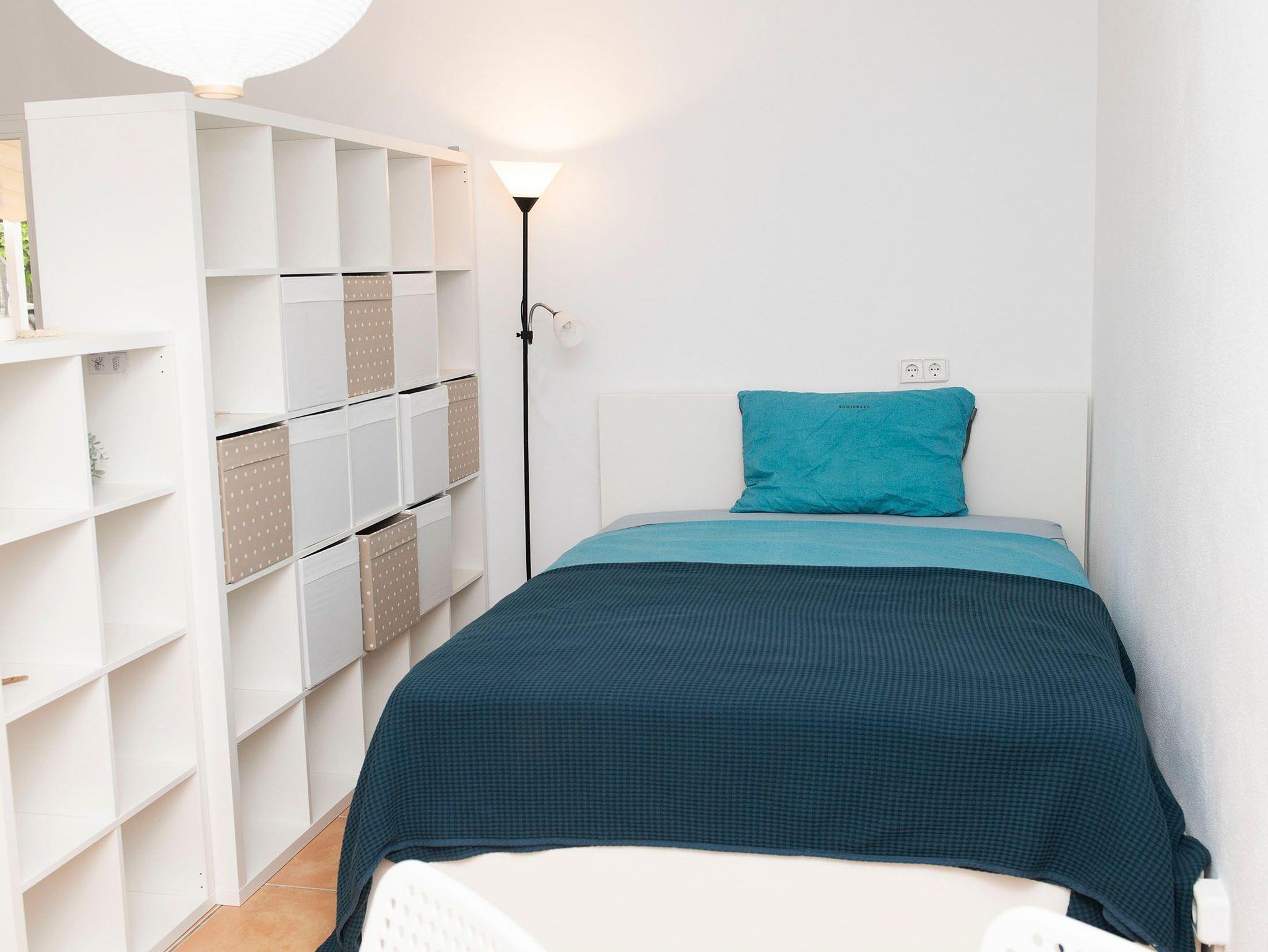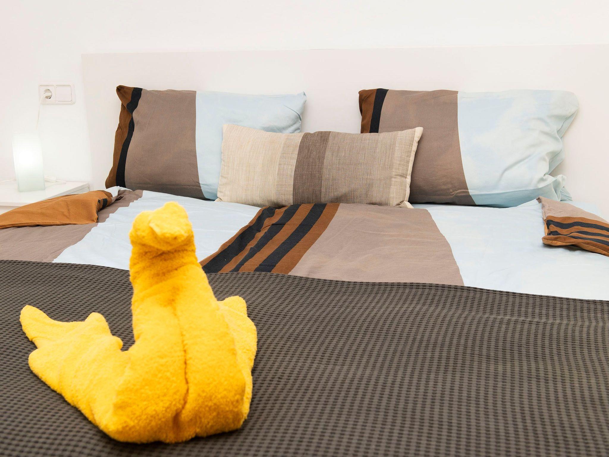 Die Wohnung verfügt über ein geräumiges Schlafzimmer mit Doppelbett und Bad en Suite sowie über ein zusätzliches Bett im Wohnbereich, das durch Regale optisch abgetrennt ist und somit einen weiteren Schlafplatz mit mehr Privatsphäre bietet. Der helle Wohn- und Essbereich ist mit einer voll ausgestatteten Küche kombiniert und lädt zum gemeinsamen Kochen und Entspannen ein.