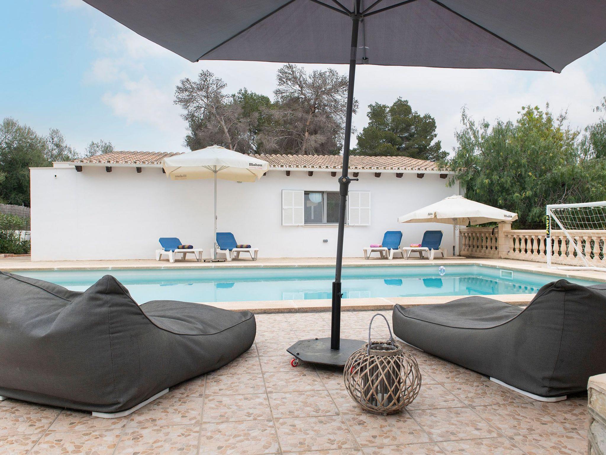 Im Außenbereich erwartet Sie ein großer mediterraner Garten mit Oliven- und Obstbäumen sowie eine private Terrasse mit Essbereich und Sonnenschutz, ideal für entspannte Stunden im Freien. Der Poolbereich bietet Erfrischung und Erholung auf den bereitstehenden Sonnenliegen.