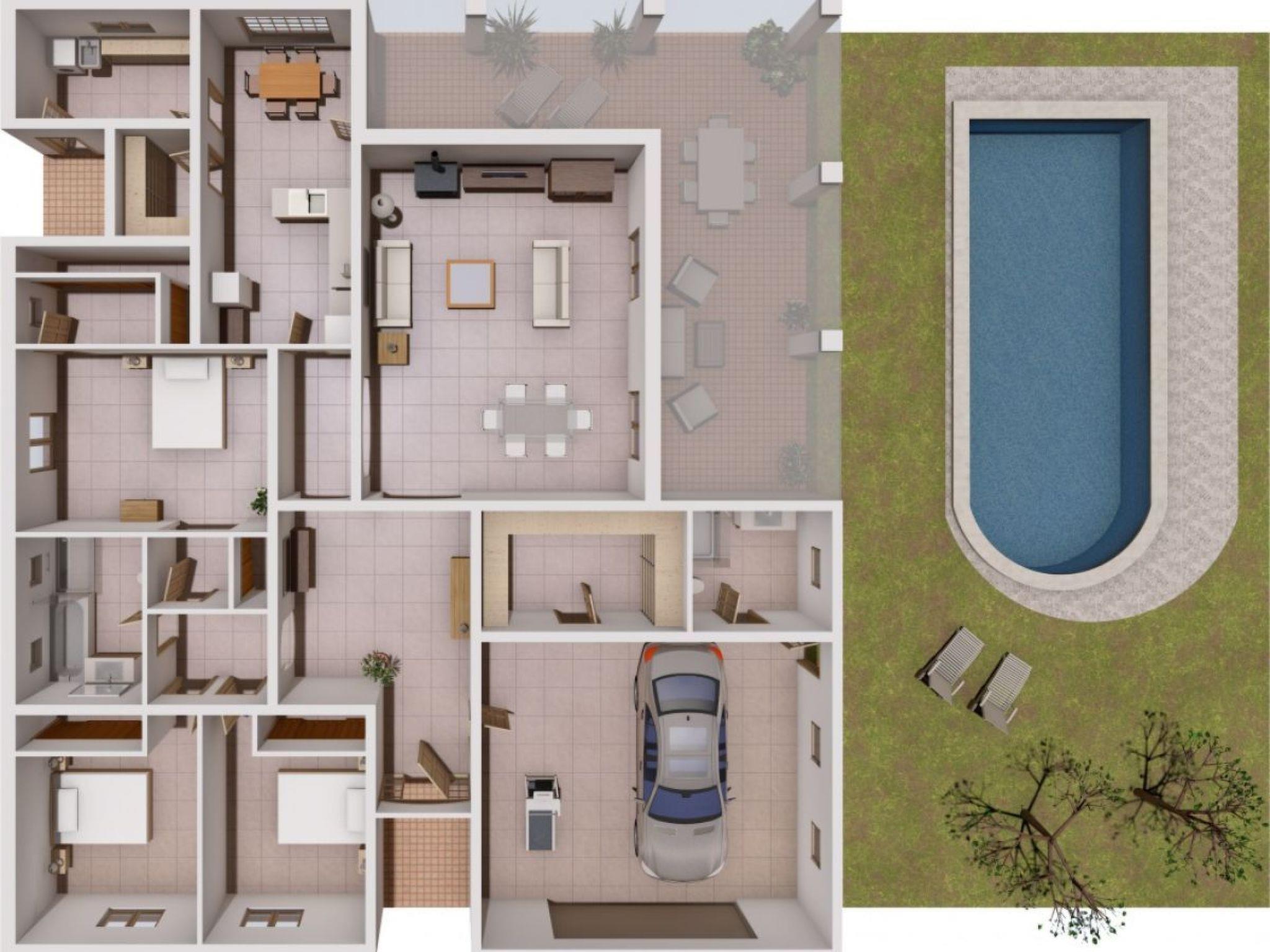 The outdoor area of this property is an oasis of relaxation. On the 14,000 m² plot, surrounded by a dreamlike garden with lawn, sun loungers and a spacious saltwater pool, you will find peace and relaxation. An extended terrace offers ample space for al fresco dining and relaxing, while a Weber barbecue provides culinary delights under the stars. The lovingly landscaped garden with palm trees, Mediterranean plants and an orchard will make your stay unforgettable.