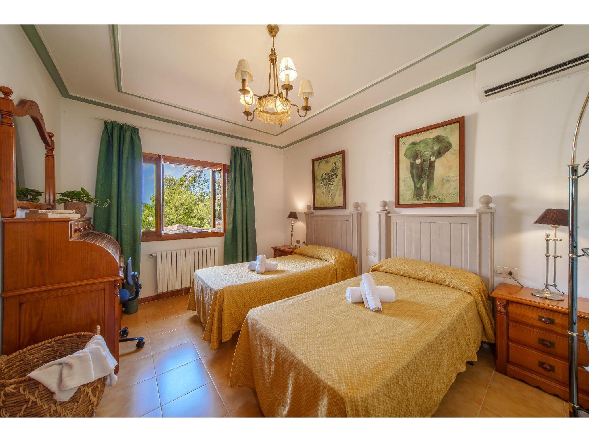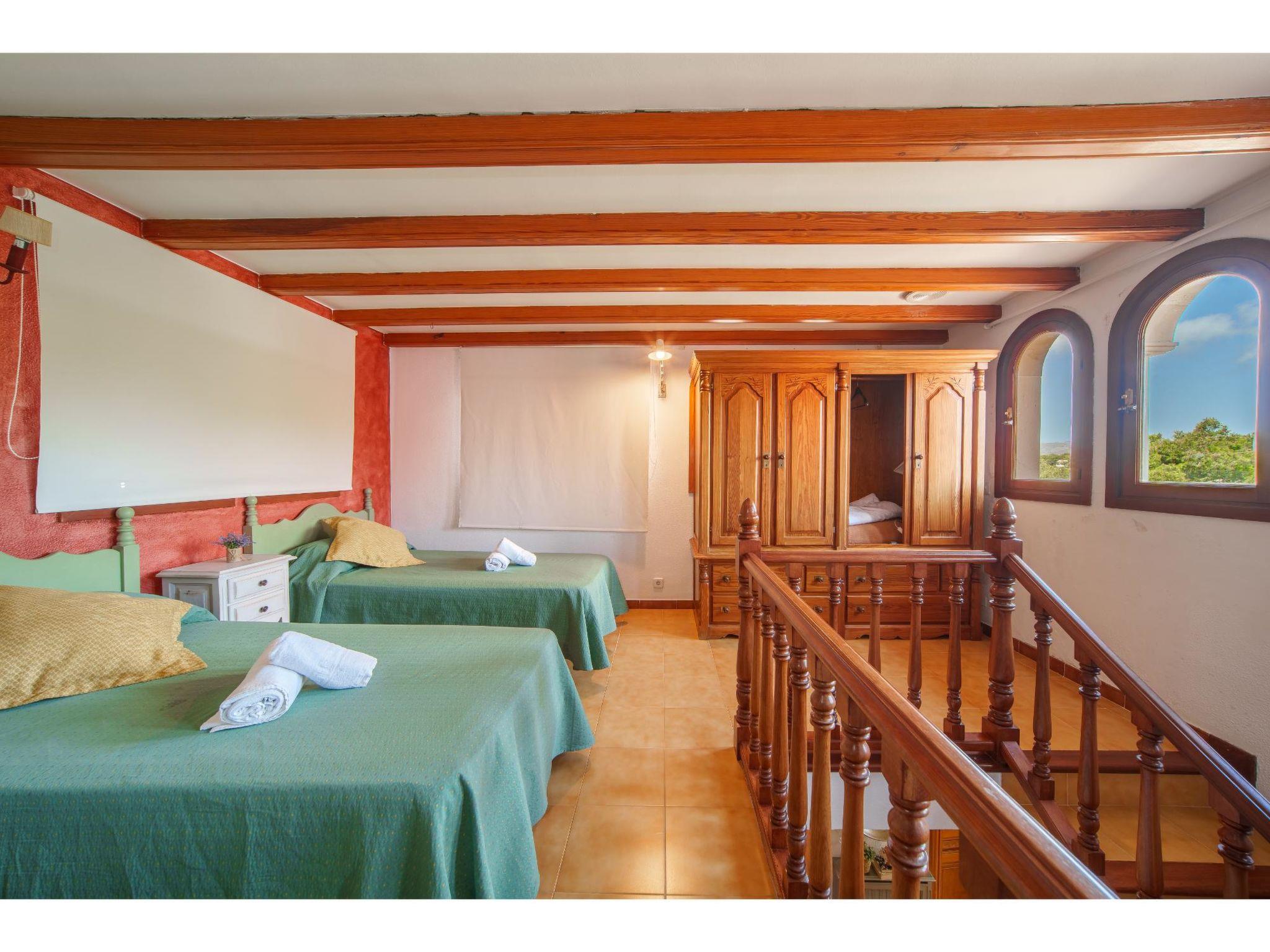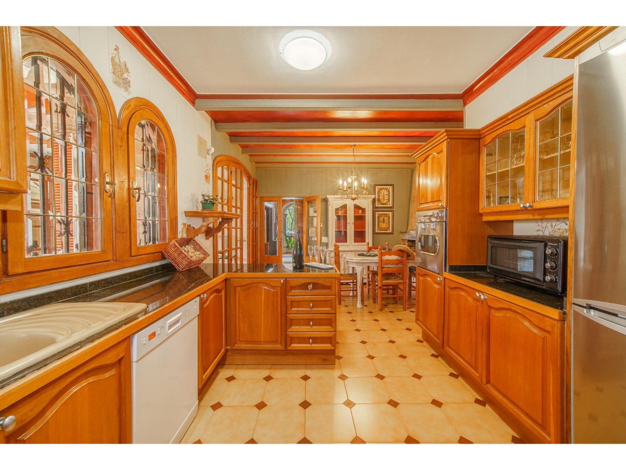 "Villa Munar I", 7-room house 220 m2 on 3 levels. Comfortable furnishings: living/dining room with open-hearth fireplace (only for decoration), dining table, satellite TV and air conditioning. Exit to the terrace. Living/dining room. 1 room with 1 french bed (135 cm), air conditioning. Open kitchen (oven, dishwasher, 4 gas rings, toaster, kettle, microwave, freezer, electric coffee machine) with small dining table, open-hearth fireplace. Shower/WC, sep. WC. Upper floor: 1 room with Dressing room with 1 french bed (150 cm), bath/WC, double hand-basin and air conditioning. 1 room with 2 beds. 1 room with 2 beds and air conditioning. Bath/WC, double hand-basin. 2nd upper floor: 1 open room with 3 beds. Oil heating. Terrace 15 m2, roofed. Terrace furniture, barbecue, deck chairs (9). Facilities: washing machine, iron. Internet (WiFi, free). Please note: suitable for families. Non-smoking house. Fire extinguisher. VT1544 // Reg. Nr.: ESFCTU0000070230001070910000000000000000000000VT15446