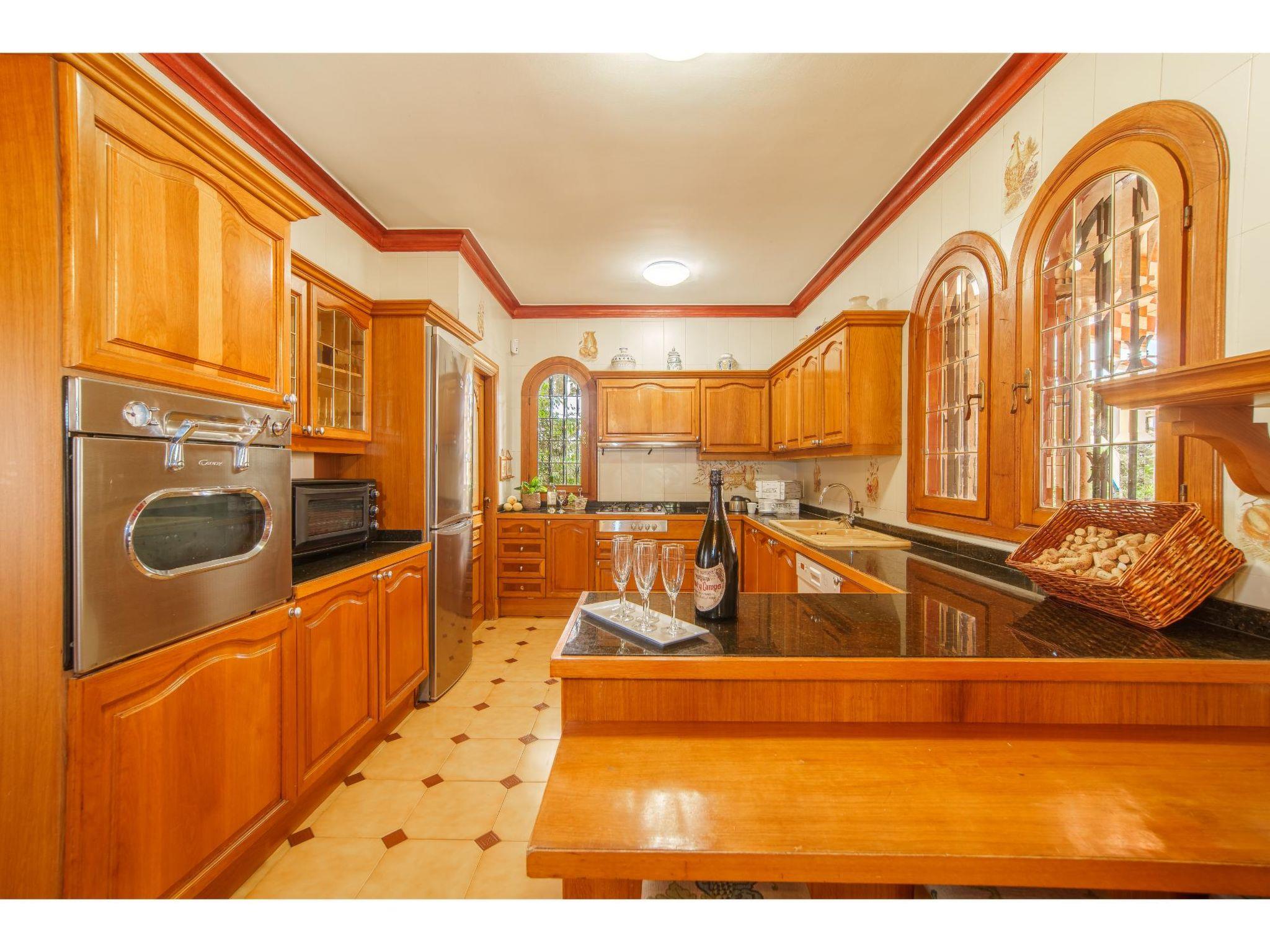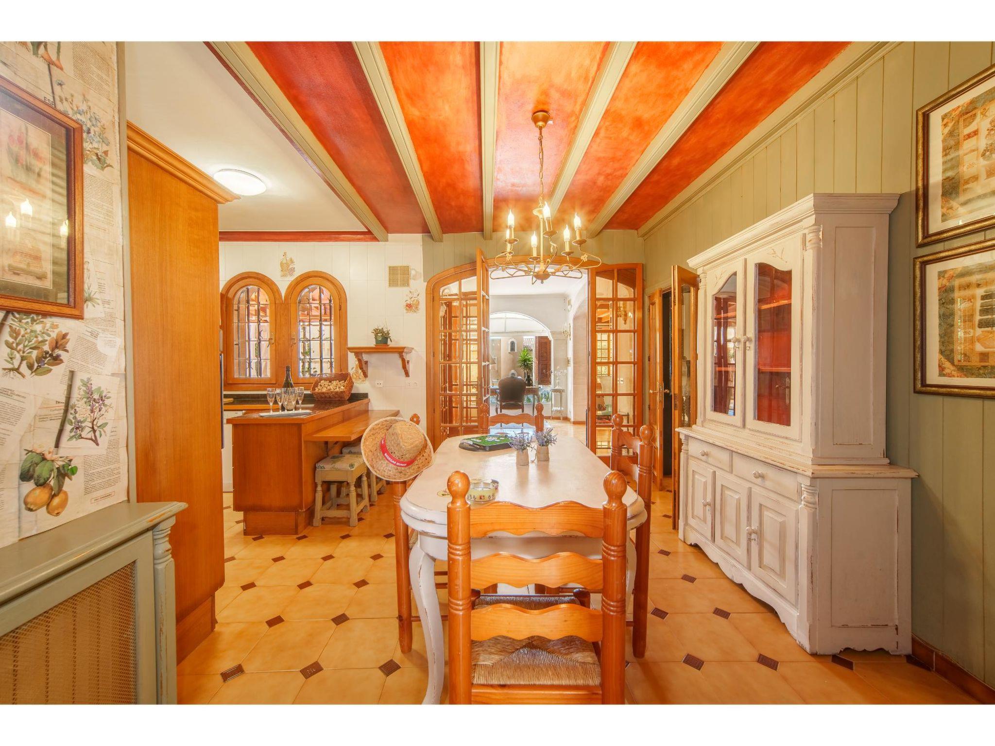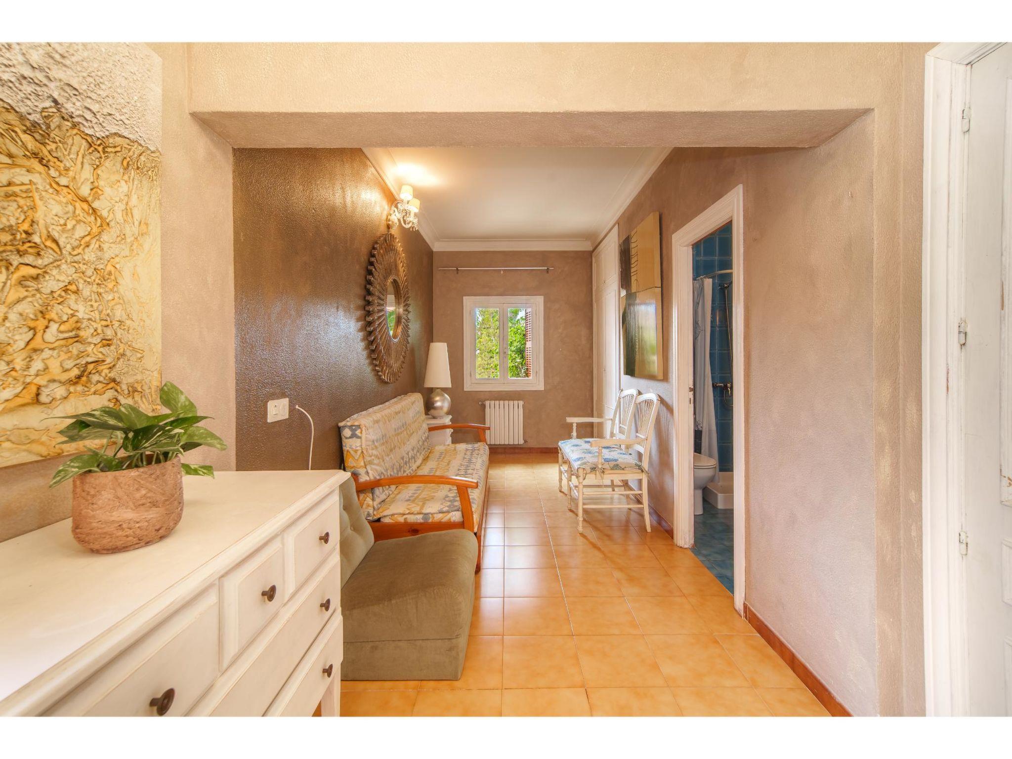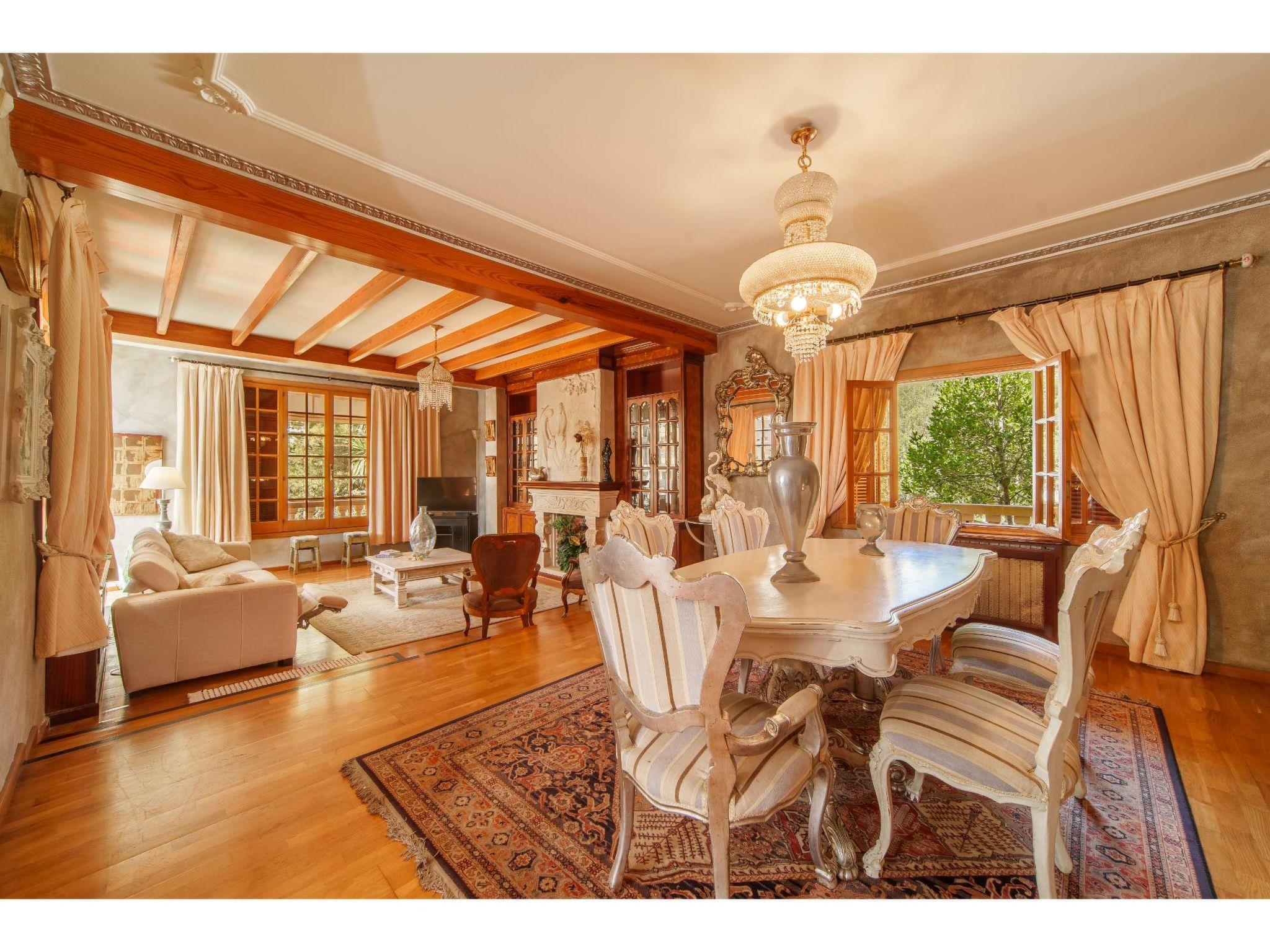 "Villa Munar I", 7-room house 220 m2 on 3 levels. Comfortable furnishings: living/dining room with open-hearth fireplace (only for decoration), dining table, satellite TV and air conditioning. Exit to the terrace. Living/dining room. 1 room with 1 french bed (135 cm), air conditioning. Open kitchen (oven, dishwasher, 4 gas rings, toaster, kettle, microwave, freezer, electric coffee machine) with small dining table, open-hearth fireplace. Shower/WC, sep. WC. Upper floor: 1 room with Dressing room with 1 french bed (150 cm), bath/WC, double hand-basin and air conditioning. 1 room with 2 beds. 1 room with 2 beds and air conditioning. Bath/WC, double hand-basin. 2nd upper floor: 1 open room with 3 beds. Oil heating. Terrace 15 m2, roofed. Terrace furniture, barbecue, deck chairs (9). Facilities: washing machine, iron. Internet (WiFi, free). Please note: suitable for families. Non-smoking house. Fire extinguisher. VT1544 // Reg. Nr.: ESFCTU0000070230001070910000000000000000000000VT15446