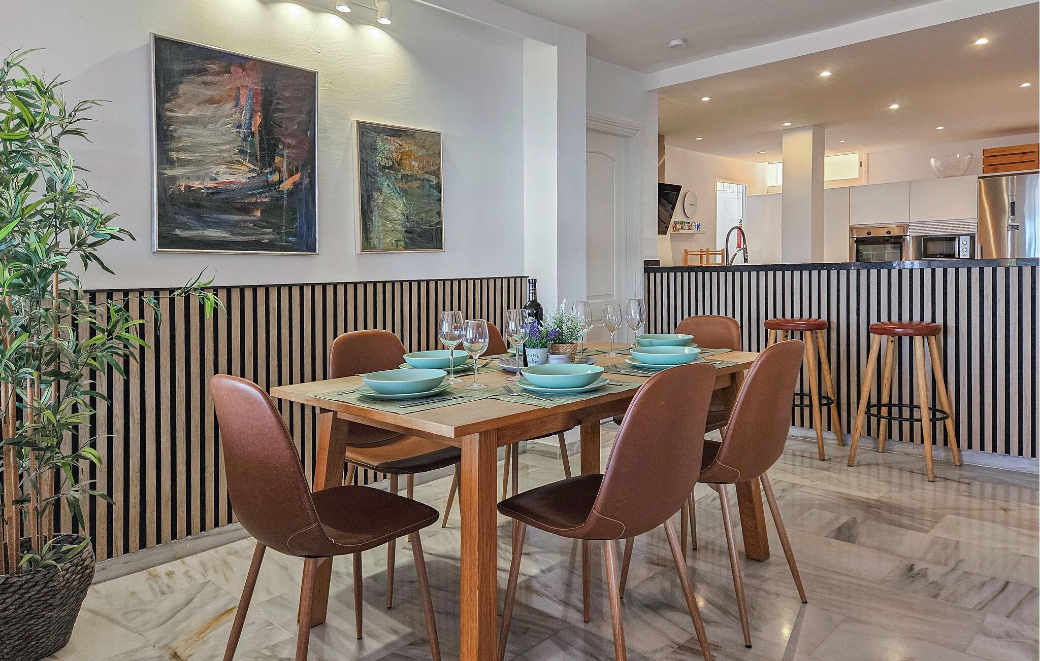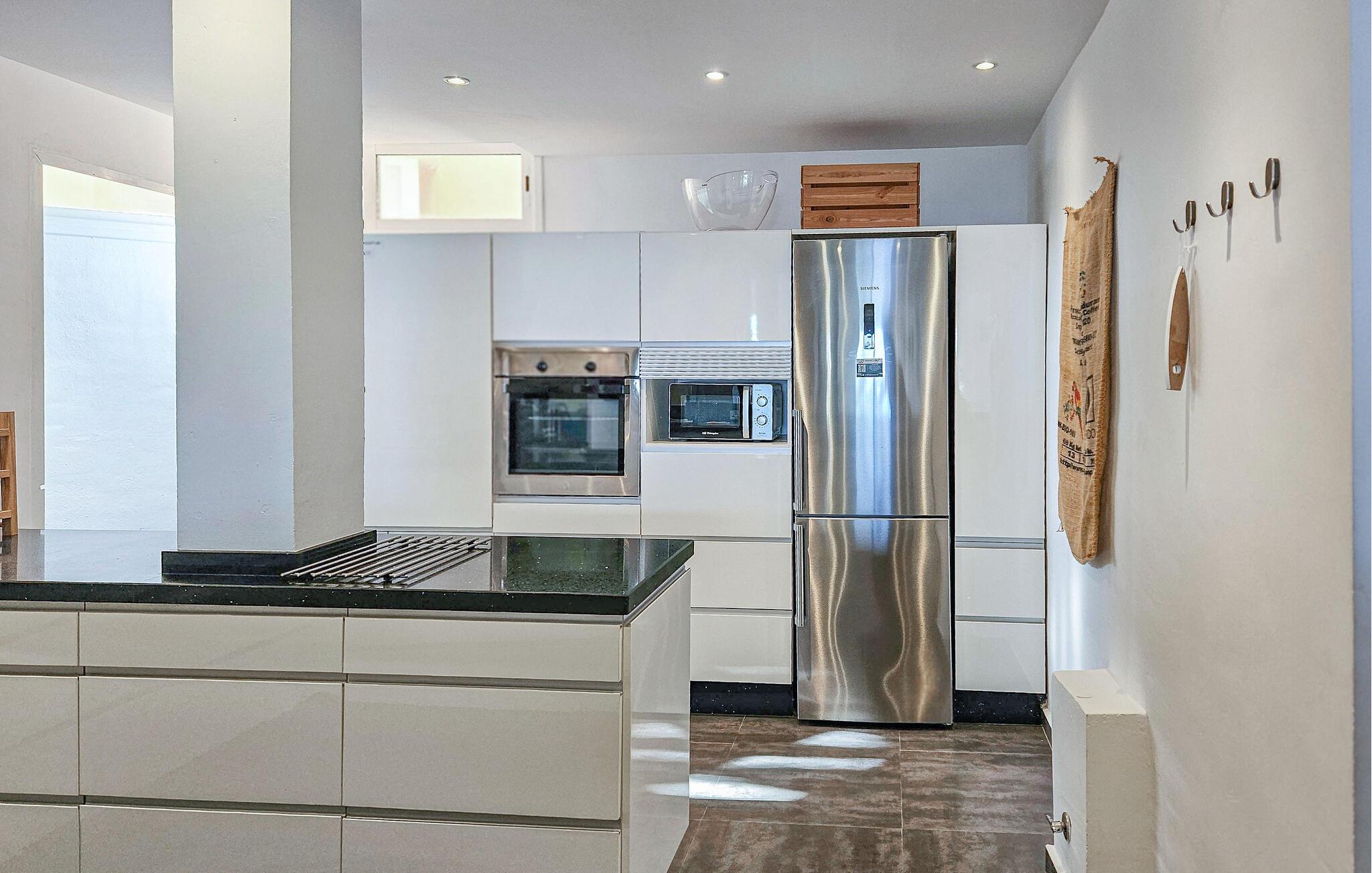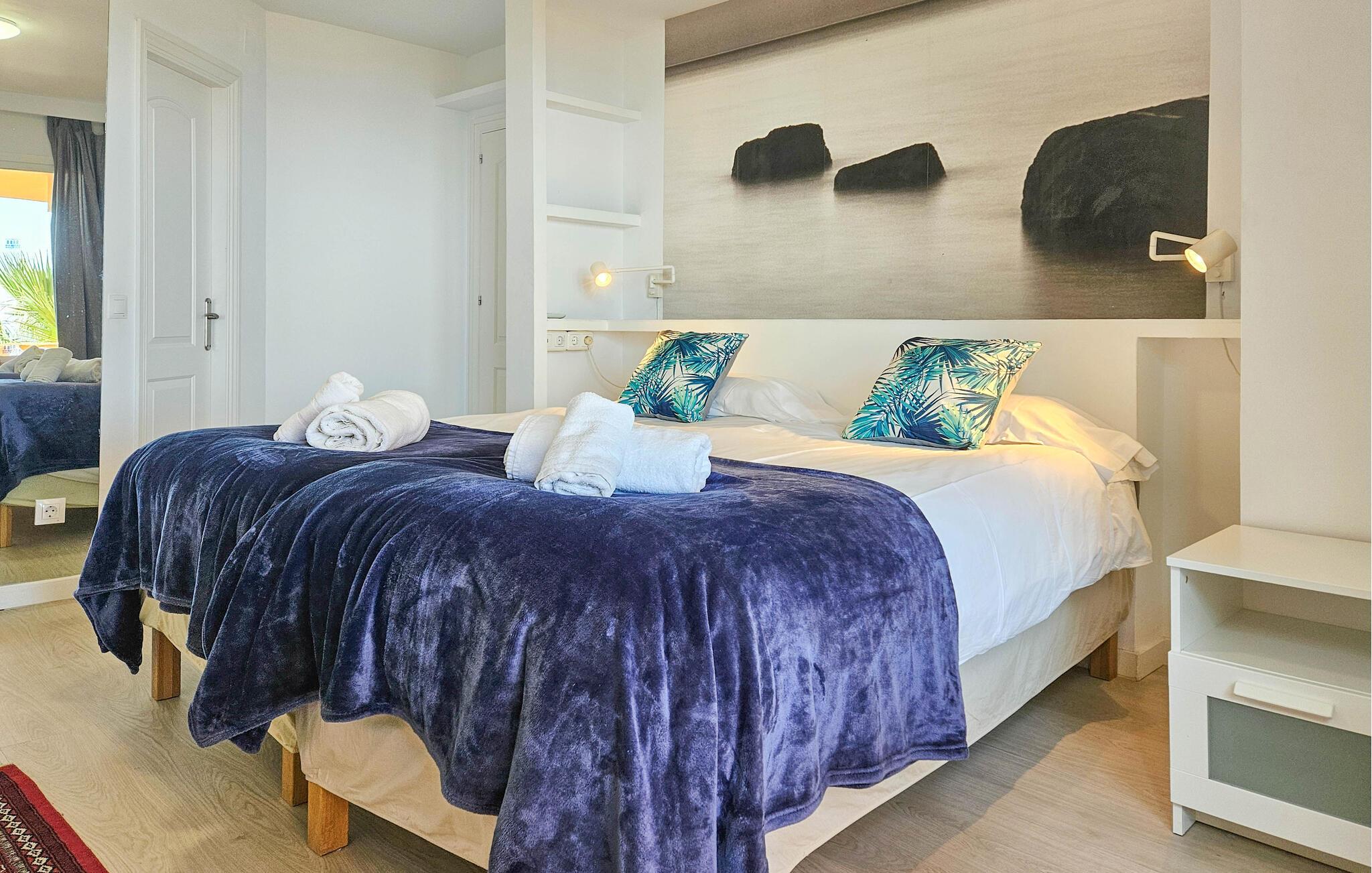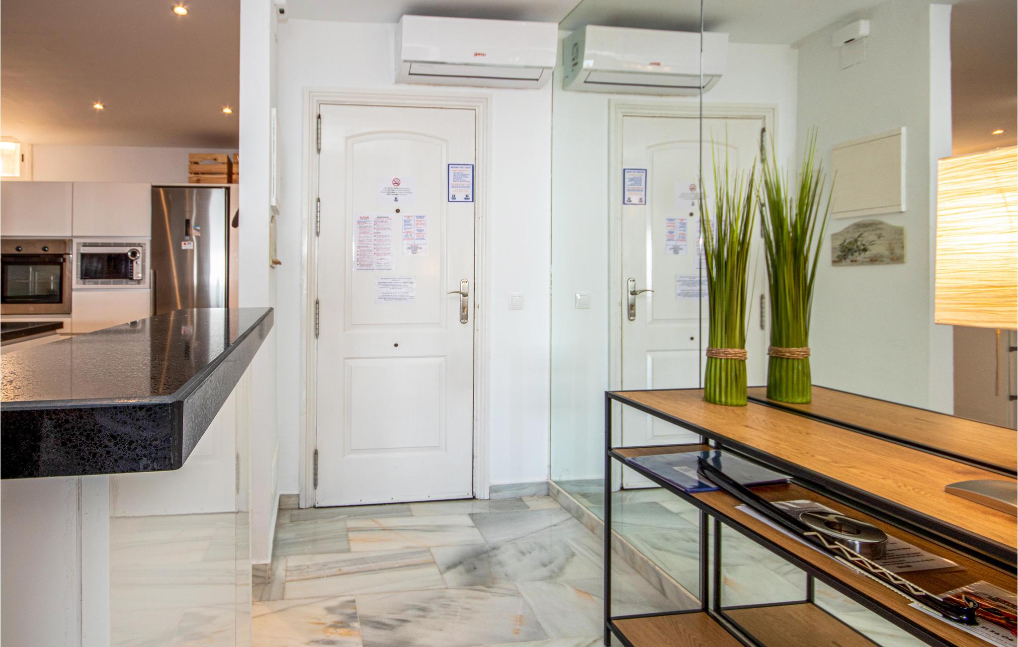 Den renoverede, rummelige lejlighed ligger på 2. sal. Består af en meget rummelig stue/spisestue med åben plan, stort, moderne og fuldt udstyret køkken med bryggers og vaskemaskine. Lejligheden er af meget høj kvalitet og har en varm og kold aircondition i stuen og i alle soveværelser. Der er også fiberoptisk WiFi og en digital boks, der transmitterer internationale kanaler på tv'et. Andre faciliteter inkluderer en Blueray DVD-afspiller og en radio. Loungen fører til en smuk terrasse med spektakulær udsigt over havet.