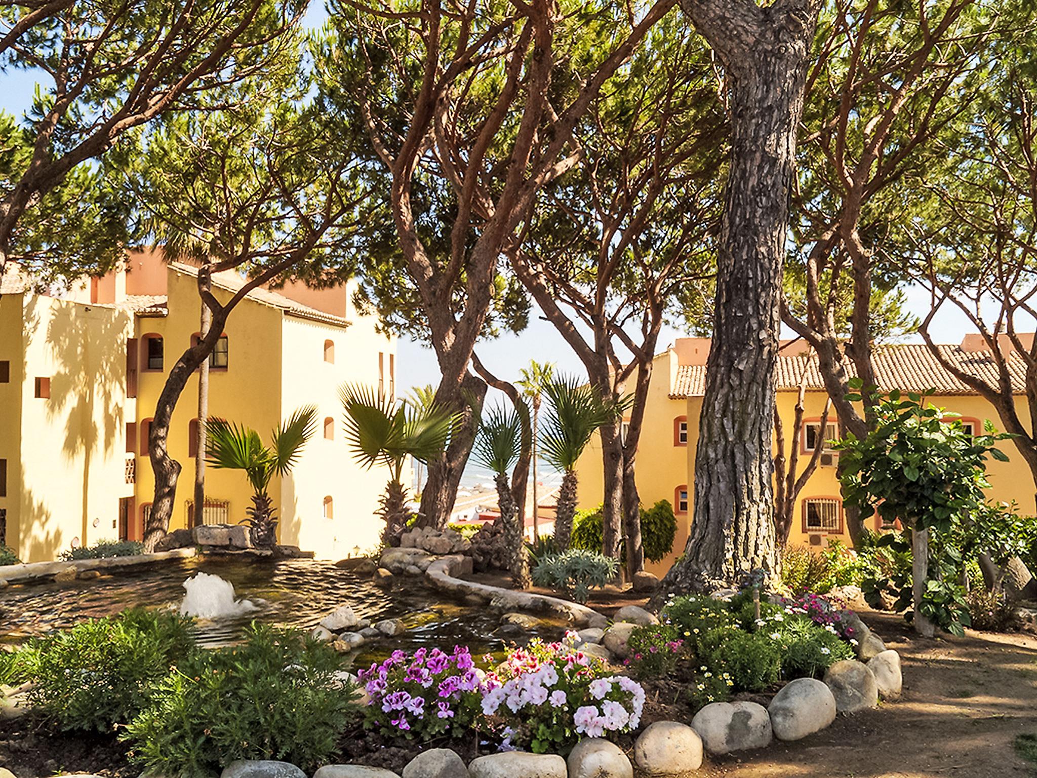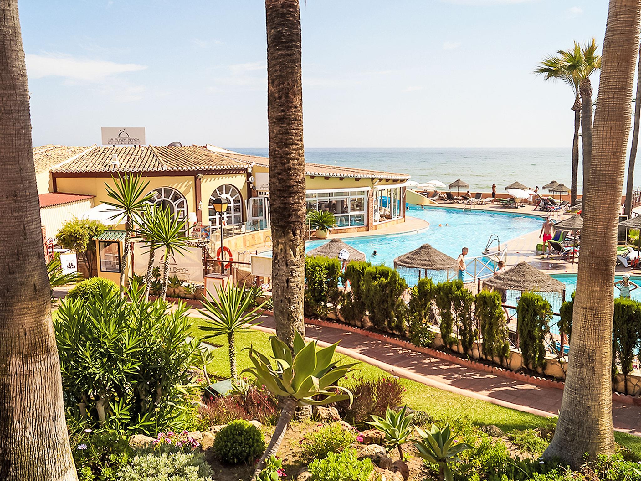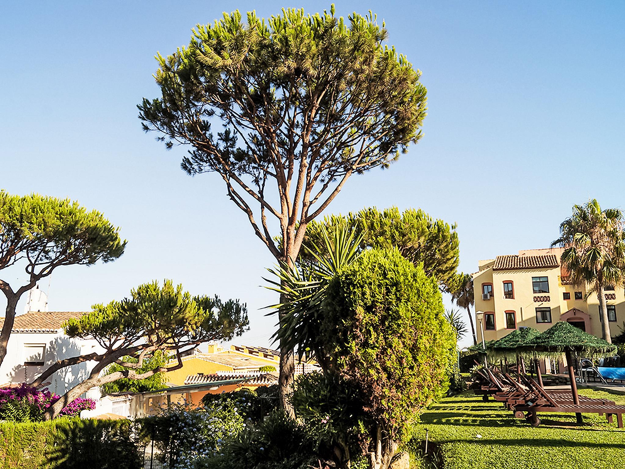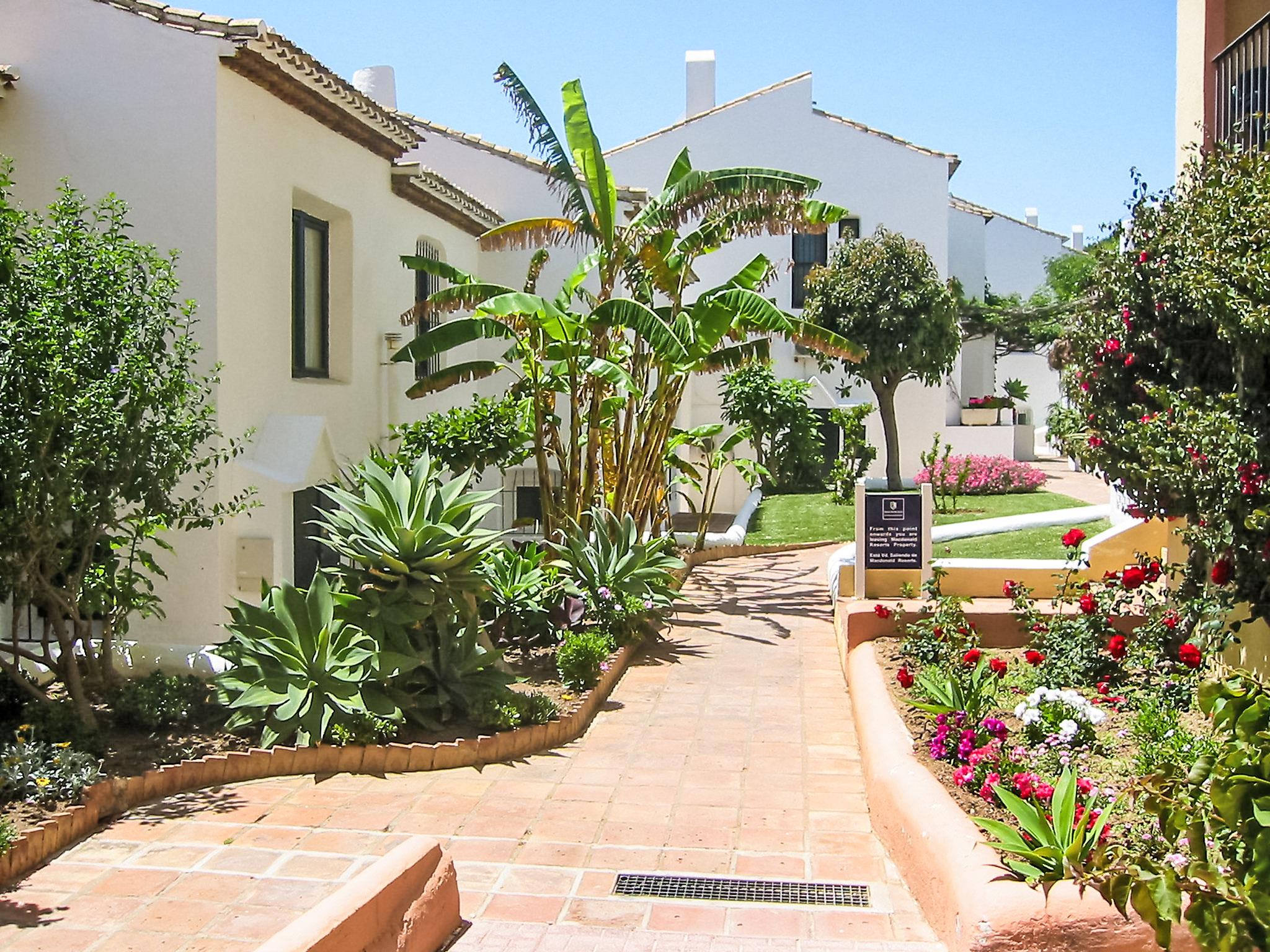 Calahonda 15 km from Marbella: *Extra: 2 heated swimming pools (outside and inside), 1 outside swimming pool, hot tub, Turkish bath, sauna, gym and aqua gym classes. Child friendly resort "Dona Lola". In a central, quiet position, 200 m from the sea, 200 m from the beach. For shared use: swimming pool (seasonal availability: 01.Jan. - 31.Dec.). Children's pool, outdoor shower, tennis (extra), table tennis, children's playground. In the complex: reception, restaurant, bar, bistro, shopping facilities, kiosk, laundry. Stepped path (15 steps) to the house. Shop 50 m, supermarket 400 m, shopping centre 200 m, restaurant, bar, café 20 m, bus stop "Las Postas" 700 m. Please note: entertainment in the season. Object suitable for 6 adults + 2 children. The complex has night security.