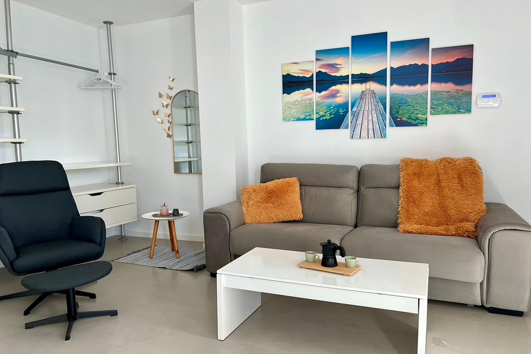 Træd ind i denne indbydende lejlighed, hvor komfort og bekvemmelighed forenes for at skabe en afslappet feriestemning. Indgangen åbner direkte til et moderne køkken, der er omhyggeligt udstyret med alt hvad du behøver - fra kogeplader og ovn til kaffemaskine og opvaskemaskine - hvilket gør det nemt at tilberede alt fra hurtig morgenmad til afslappede middage. Et spisebord inviterer dig til at samles og dele måltider, mens den tilstødende opholdsstue tilbyder et hyggeligt siddeområde, et fladskærms-tv med satellitkanaler og en dvd-afspiller til rolige aftener. Skydedøre fører dig ud til balkonen eller terrassen, det perfekte sted at nyde frisk luft og udsigten med en morgenkaffe eller et aftenglas vin. Soveværelset er designet til afslappende nætter og er møbleret med enten en komfortabel dobbeltseng eller to enkeltsenge og åbner også ud til en balkon eller terrasse for et strejf af udendørs charme. Badeværelset kombinerer stil og funktion med badekar, bidet, hårtørrer og alt det nødvendige, du har brug for til at slappe af efter en dag med udforskning. Ud over selve lejligheden kan gæsterne nyde adgang til gennemtænkte ekstrafunktioner, der forbedrer oplevelsen. Et fitnessrum med udstyr holder din rutine på sporet, mens private havedøre åbner ud til en grøn oase med en møbleret terrasse, grillplads og masser af plads til at slappe af under åben himmel. Uanset om du laver mad, slapper af eller udforsker, blander denne lejlighed moderne bekvemmeligheder med indbydende rum - et sted, hvor hver eneste detalje er designet til at få dig til at føle dig hjemme.