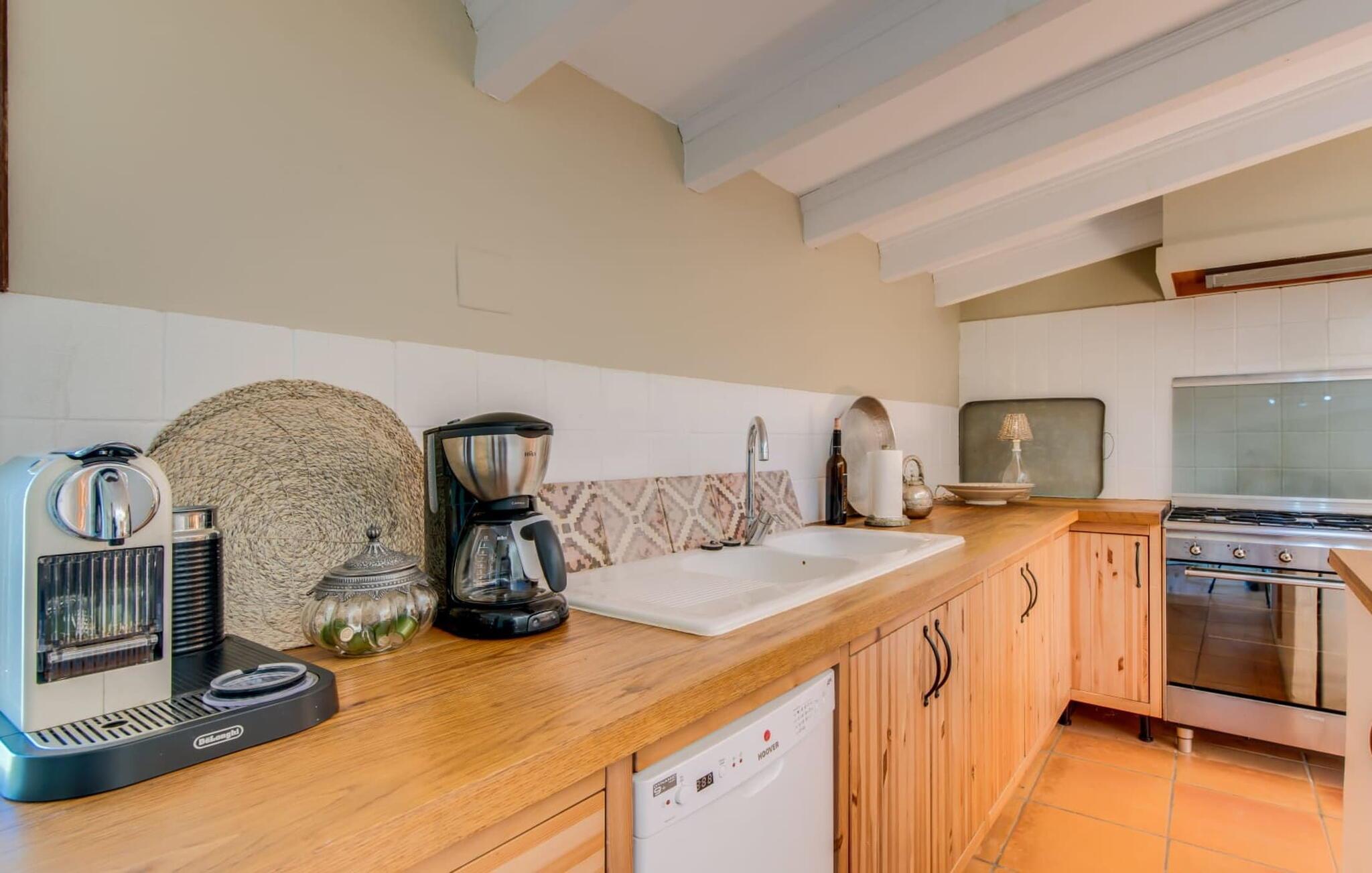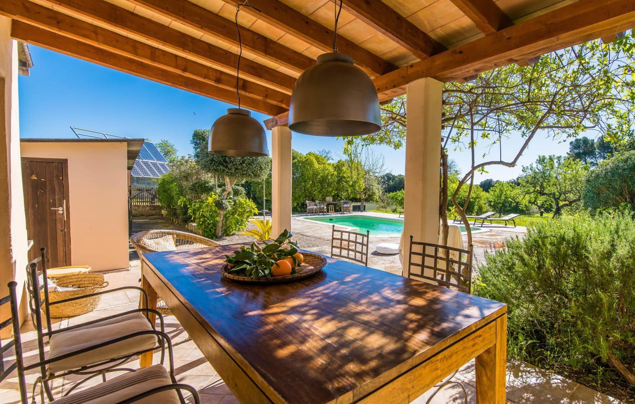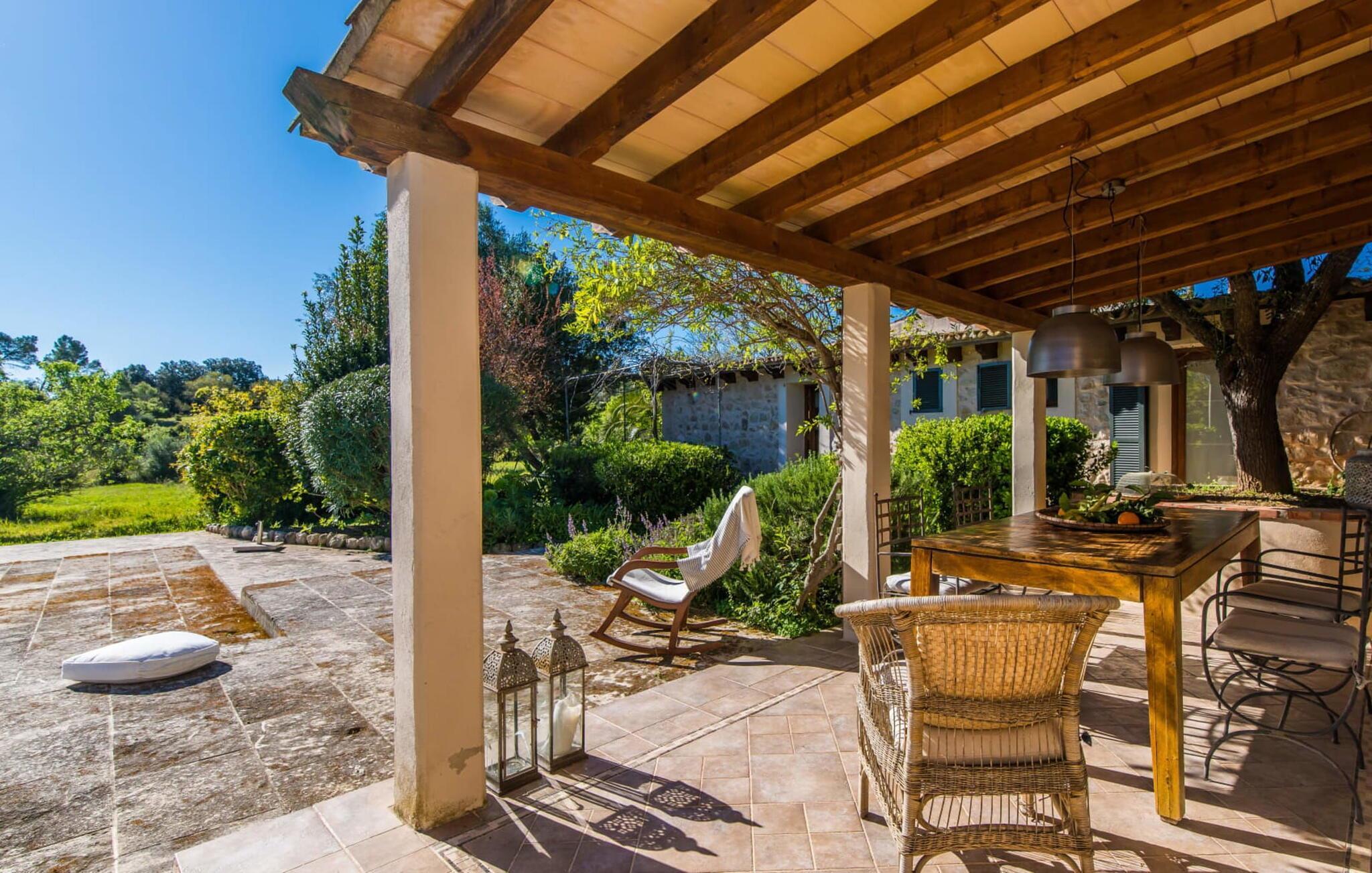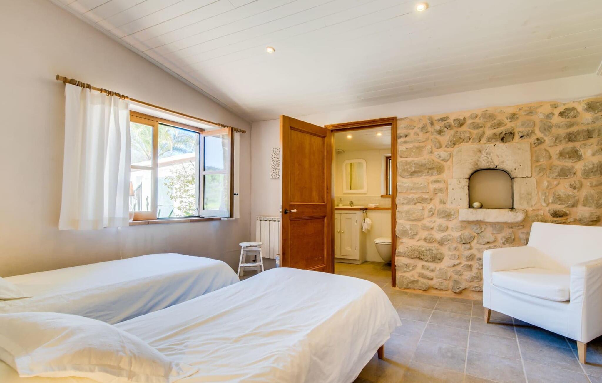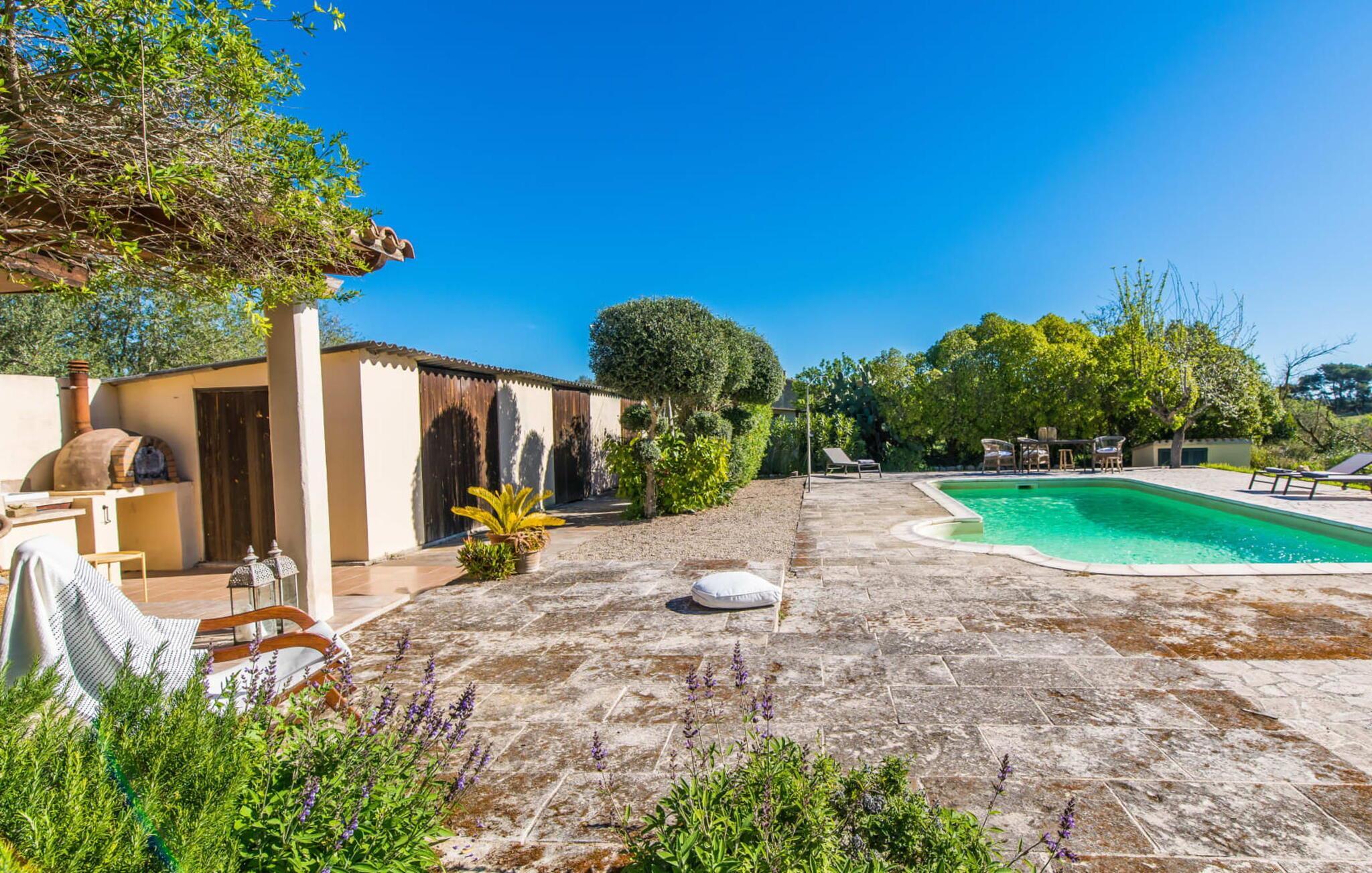 en rolig, ugeneret beliggenhed og midt i frodige grønne områder og uberørt natur finder I jeres skønne sommerhus, der straks vil forelske jer i. Leder du efter en autentisk mallorcansk atmosfære, er du kommet til det rette sted, da ejendommen er en bygning fra 1850, der er blevet nænsomt renoveret. Dette moderne feriehus blev oprindeligt brugt til landbrug og har en charmerende og rummelig have. Kun én ting venter dig her: ren afslapning. Gå en tur gennem haven og nyd duften af citroner i luften, prøv en af de saftige oliven eller figner, der hænger fra træerne, og tag en dyb indånding: det er feriesæson! Når middagsvarmen kommer, kan du tage en dukkert i den private pool, som lover at køle dig ned. Så skal du bare slappe af med en god læsning på en af de komfortable liggestole under parasollen. Om aftenen inviterer grillen til at tilbringe dagen helt udendørs. Når du kommer ind i huset fra en af terrasserne, vil du straks føle dig hjemme takket være den charme og autenticitet, der gennemsyrer alle rum. Varme terracottagulve, gyldenbrunt iroko-træ, synligt murværk lavet af stenbrud: dette hus har stil. Under renoveringen blev der sørget for kun at bruge udsøgte møbler og inventar i huset. Den har et minimalistisk design, som passer perfekt til kombinationen af hvide og cremefarvede toner og det honningfarvede træ, der er at finde i hele huset. Du vil med det samme stryge bordpladen på det store spisebord af smukt træ for at mærke det. I den hyggelige opholdsstue er der en kæmpe åben pejs til hyggelige aftener i køligere temperaturer. Der er også et tv med tysk satellitmodtagelse. Køkkenet er meget hyggeligt takket være det let skrå loft. Den har en opvaskemaskine, en elkedel og forskellige kaffemaskiner og alt hvad et selvforplejningshjerte begærer. Soveværelserne er også indrettet i bløde pastelfarver og har hver deres badeværelse. Fincaen ligger i centrum af øen, kun 30 km fra hovedstaden Palma. Så centralt og alligevel med en fantastisk ugenert beliggenhed byder det på en lang række muligheder for fritidsaktiviteter uden for den smukke ejendom. Især vandrefans kan glæde sig, for det lille ferieparadis ligger under det markante Puig de Randa-bjerg, der rejser sig over det mallorcanske lavland og minder en del om Sydafrikas Taffelbjerg. Under stigningen har du mulighed for at besøge tre klostre, der ligger i forskellig højde. Når du når toppen, vil du blive belønnet med en spektakulær udsigt over Tramuntana-bjergene. Strande såsom Caló de Sant Antoni eller Es Trenc kan nemt nås med lejebil, mindre end 30 km væk. Den paradisiske villa "Calmita" ligger midt i et spektakulært landskab nær det markante Puig de Randa-bjerg. Den lille by Montuiri, cirka 4 miles væk, har alt hvad du behøver med bagerier, supermarkeder og et vidunderligt marked, der tilbyder en bred vifte af friske, lokale råvarer. De populære strande Platja de Palma og Platja de Sa Rapita ligger omkring 19 km væk, men flere andre smukke bugter såsom Es Trenc kan også nemt nås med lejebil. Dette er et Fincallorca feriehus.