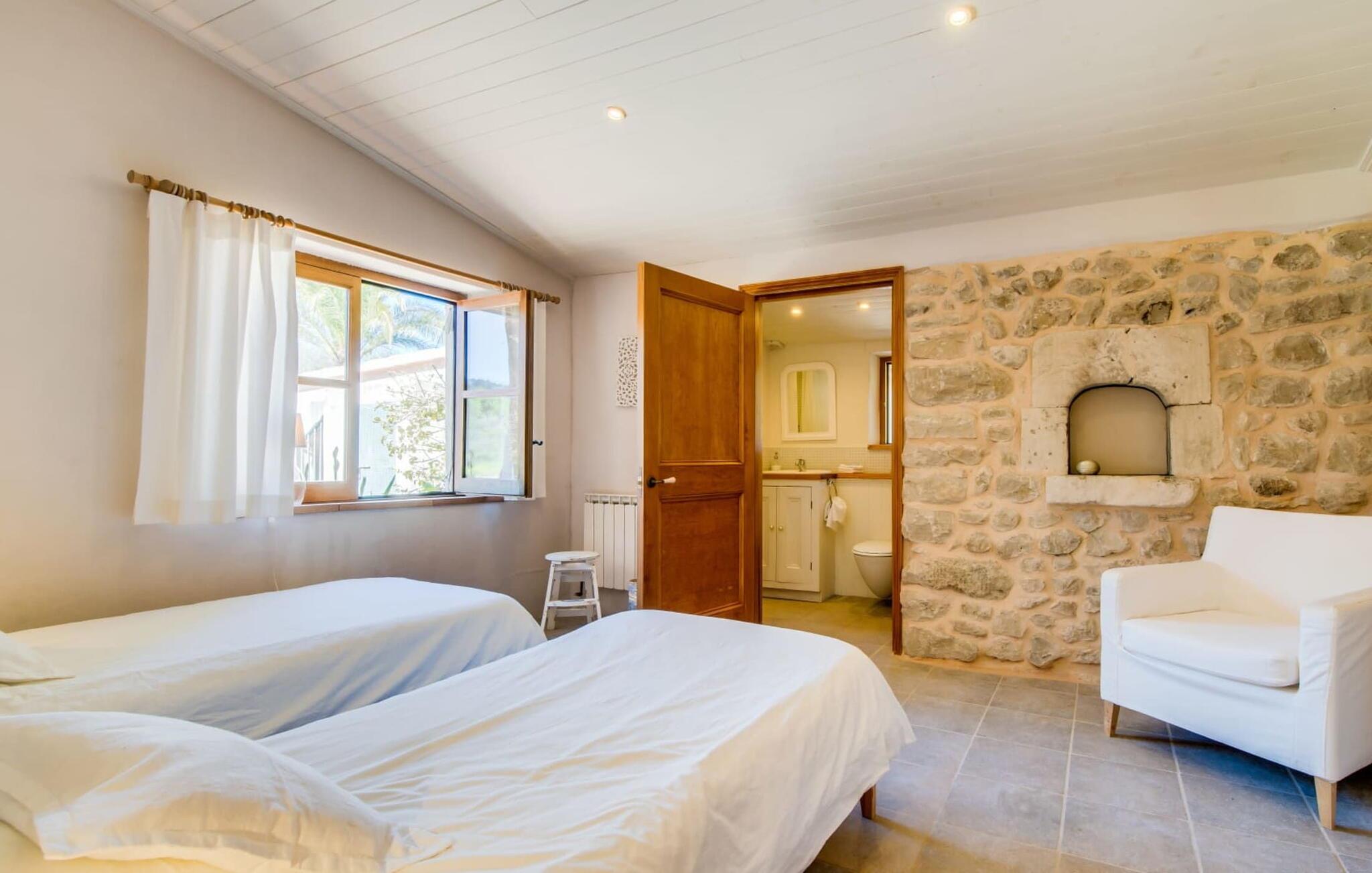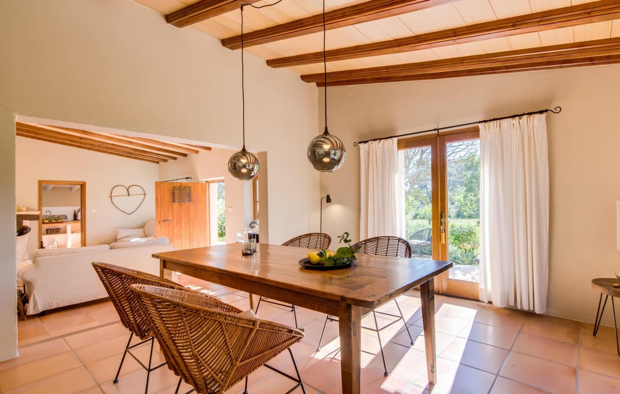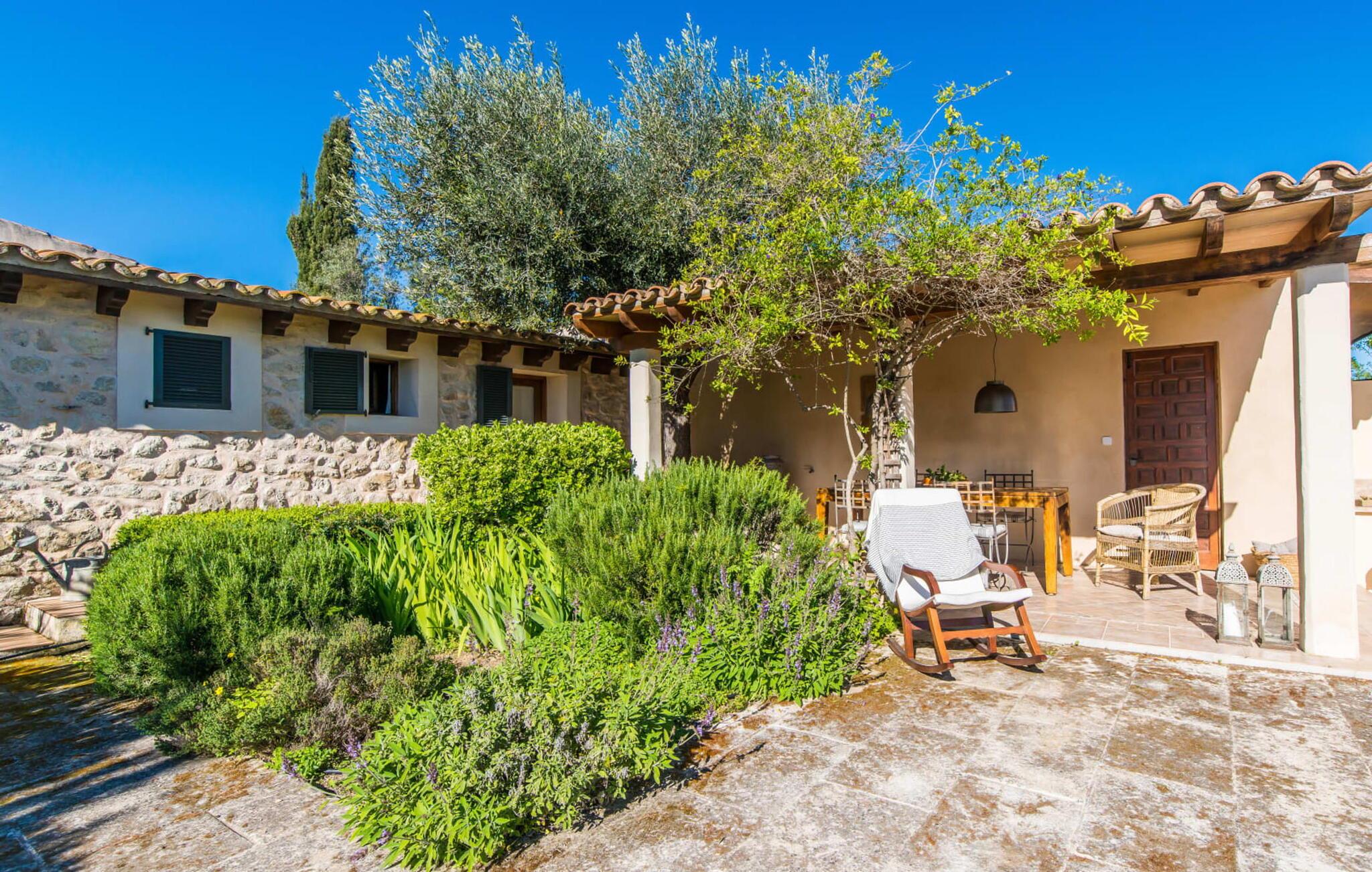 en rolig, ugeneret beliggenhed og midt i frodige grønne områder og uberørt natur finder I jeres skønne sommerhus, der straks vil forelske jer i. Leder I efter en autentisk mallorcansk atmosfære, er I kommet til det rette sted, da ejendommen er en bygning fra 1850, der er blevet nænsomt renoveret. Dette moderne feriehus blev oprindeligt brugt til landbrug og har en charmerende og rummelig have. Kun én ting venter jer her: ren afslapning. Gå en tur gennem haven og nyd duften af citroner i luften, prøv en af de saftige oliven eller figner, der hænger fra træerne, og tag en dyb indånding: det er feriesæson! Når middagsvarmen kommer, kan I tage en dukkert i den private pool, som lover at køle jer ned. Så skal I bare slappe af med en god læsning på en af de komfortable liggestole under parasollen. Om aftenen inviterer grillen til at tilbringe dagen helt udendørs. Når I kommer ind i huset fra en af terrasserne, vil I straks føle jer hjemme takket være den charme og autenticitet, der gennemsyrer alle rum. Varme terracottagulve, gyldenbrunt iroko-træ, synligt murværk lavet af stenbrud: dette hus har stil. Under renoveringen blev der sørget for kun at bruge udsøgte møbler og inventar i huset. Den har et minimalistisk design, som passer perfekt til kombinationen af hvide og cremefarvede toner og det honningfarvede træ, der er at finde i hele huset. I vil med det samme stryge bordpladen på det store spisebord af smukt træ for at mærke det. I den hyggelige opholdsstue er der en kæmpe åben pejs til hyggelige aftener i køligere temperaturer. Der er også et tv med tysk satellitmodtagelse. Køkkenet er meget hyggeligt takket være det let skrå loft. Den har en opvaskemaskine, en elkedel og forskellige kaffemaskiner og alt hvad et selvforplejningshjerte begærer. Soveværelserne er også indrettet i bløde pastelfarver og har hver deres badeværelse. Fincaen ligger i centrum af øen, kun 30 km fra hovedstaden Palma. Så centralt og alligevel med en fantastisk ugenert beliggenhed byder det på en lang række muligheder for fritidsaktiviteter uden for den smukke ejendom. Især vandrefans kan glæde sig, for det lille ferieparadis ligger under det markante Puig de Randa-bjerg, der rejser sig over det mallorcanske lavland og minder en del om Sydafrikas Taffelbjerg. Under stigningen har I mulighed for at besøge tre klostre, der ligger i forskellig højde. Når I når toppen, vil I blive belønnet med en spektakulær udsigt over Tramuntana-bjergene. Strande som Caló de Sant Antoni eller Es Trenc kan nemt nås med lejebil, mindre end 30 km væk. Den paradisiske villa "Calmita" ligger midt i et spektakulært landskab nær det markante Puig de Randa-bjerg. Den lille by Montuiri, cirka 4 miles væk, har alt hvad I behøver med bagerier, supermarkeder og et vidunderligt marked, der tilbyder en bred vifte af friske, lokale råvarer. De populære strande Platja de Palma og Platja de Sa Rapita ligger omkring 19 km væk, men flere andre smukke bugter som Es Trenc kan også nemt nås med lejebil.