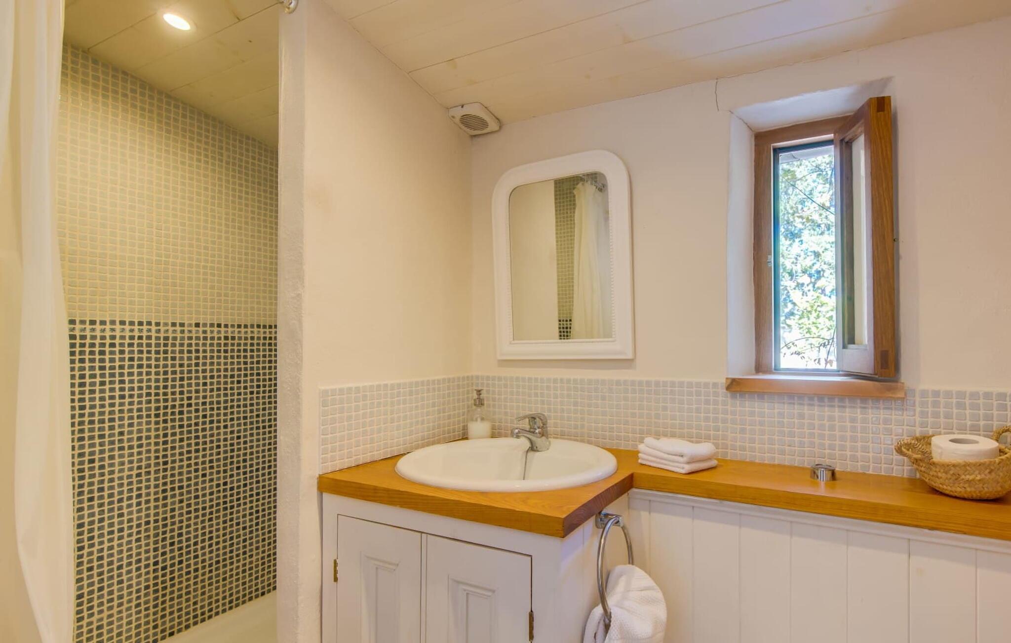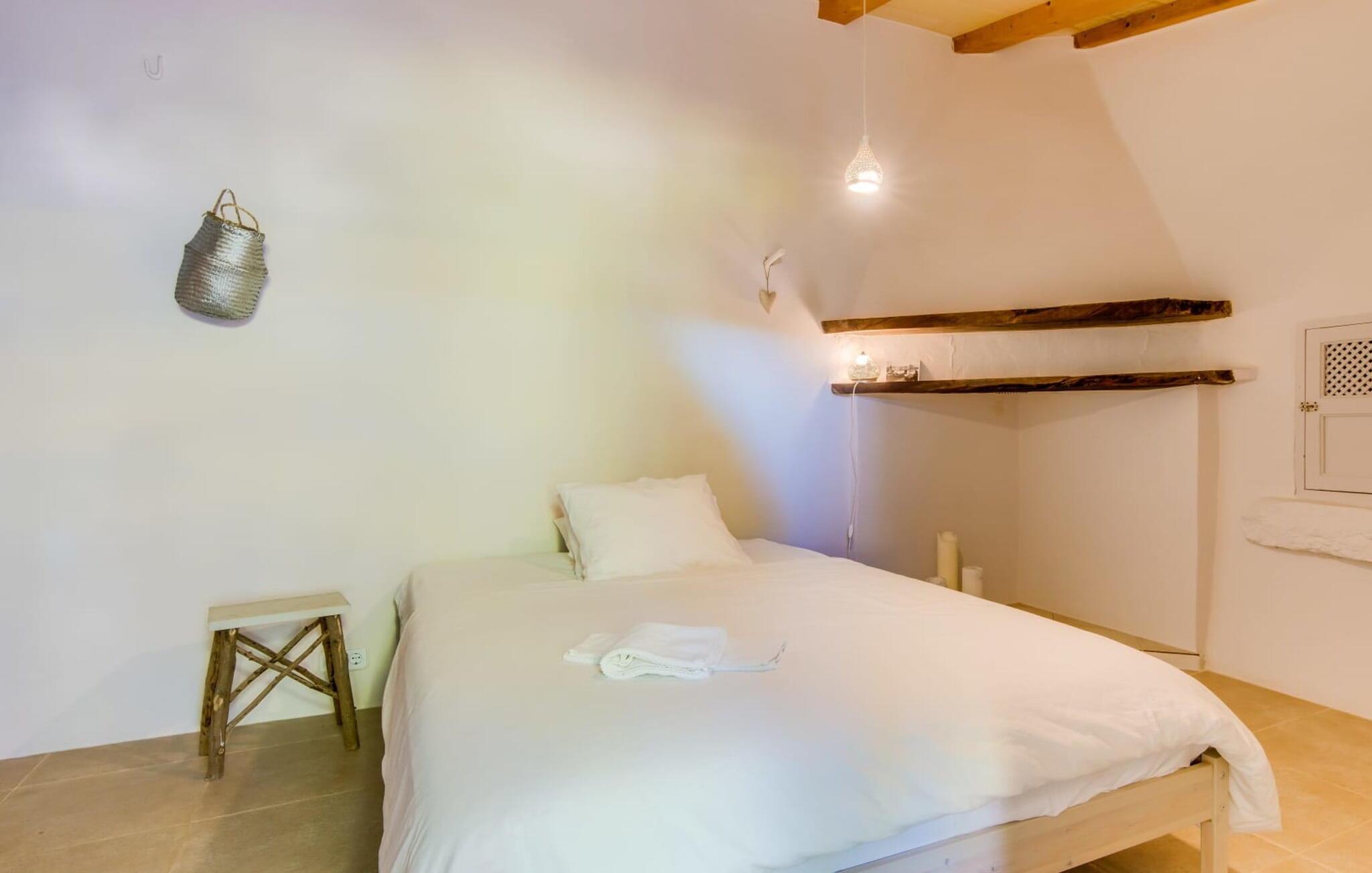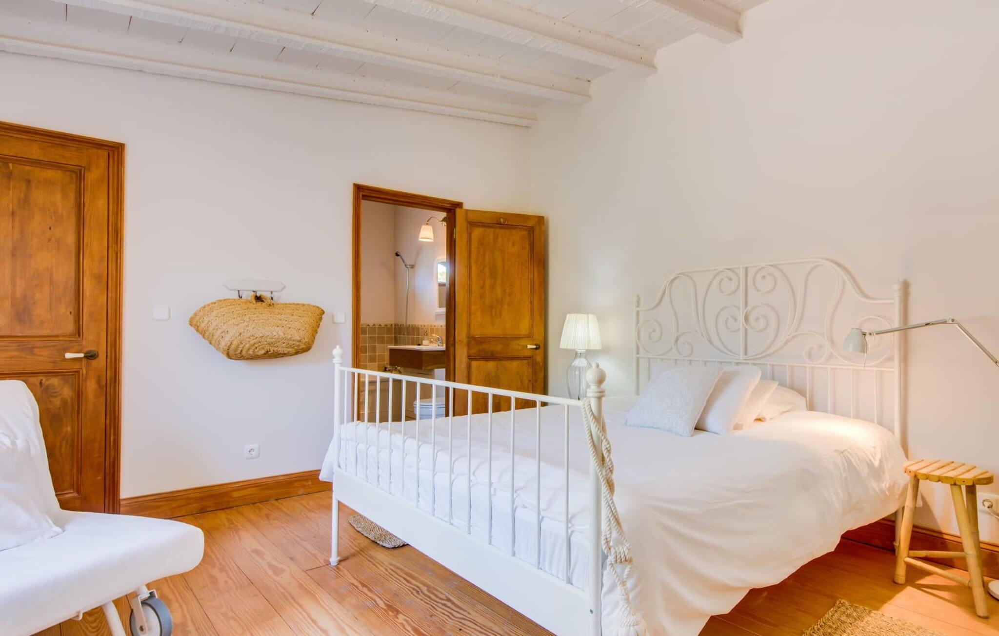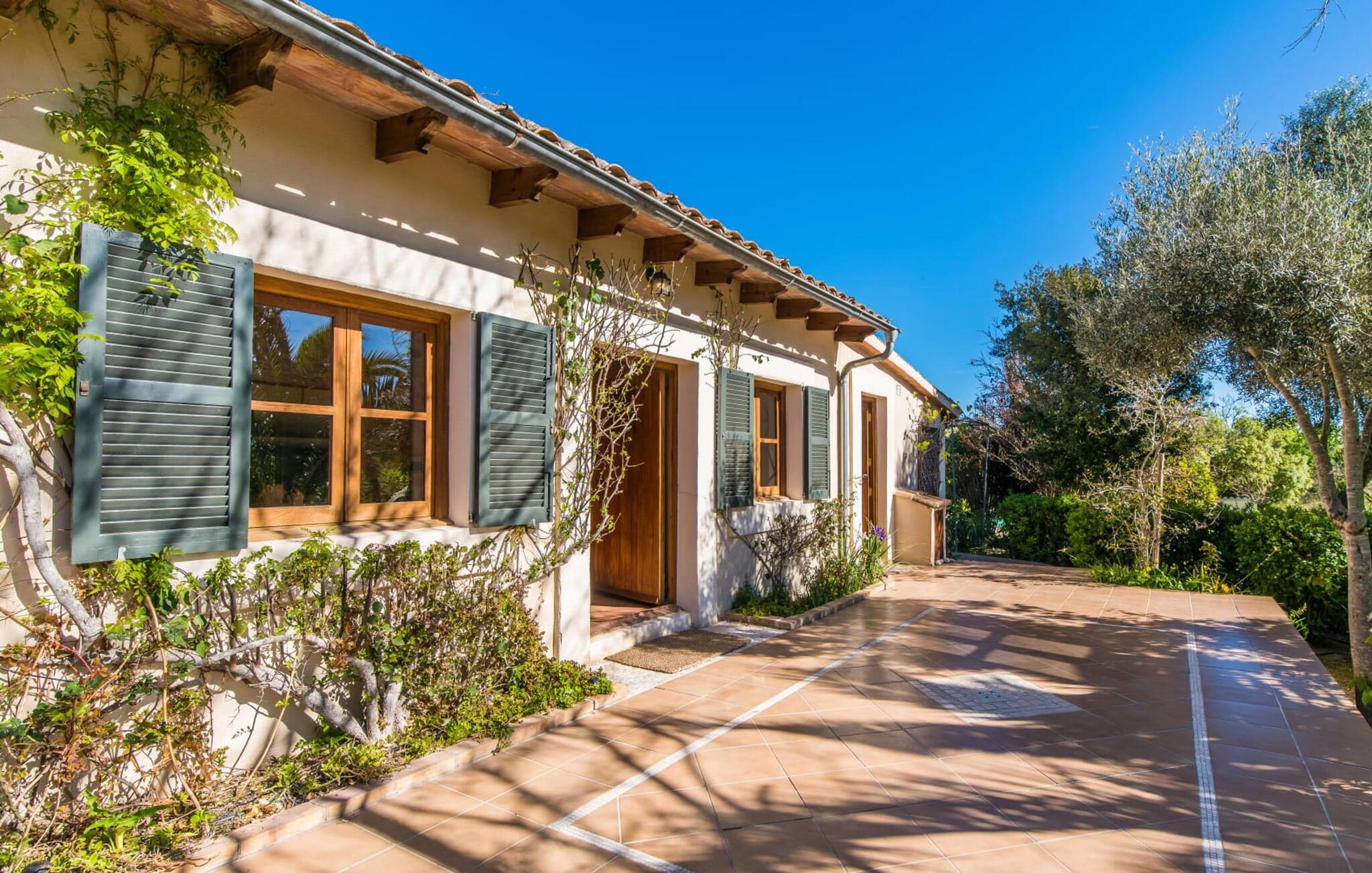 en rolig, ugeneret beliggenhed og midt i frodige grønne områder og uberørt natur finder I jeres skønne sommerhus, der straks vil forelske jer i. Leder I efter en autentisk mallorcansk atmosfære, er I kommet til det rette sted, da ejendommen er en bygning fra 1850, der er blevet nænsomt renoveret. Dette moderne feriehus blev oprindeligt brugt til landbrug og har en charmerende og rummelig have. Kun én ting venter jer her: ren afslapning. Gå en tur gennem haven og nyd duften af citroner i luften, prøv en af de saftige oliven eller figner, der hænger fra træerne, og tag en dyb indånding: det er feriesæson! Når middagsvarmen kommer, kan I tage en dukkert i den private pool, som lover at køle jer ned. Så skal I bare slappe af med en god læsning på en af de komfortable liggestole under parasollen. Om aftenen inviterer grillen til at tilbringe dagen helt udendørs. Når I kommer ind i huset fra en af terrasserne, vil I straks føle jer hjemme takket være den charme og autenticitet, der gennemsyrer alle rum. Varme terracottagulve, gyldenbrunt iroko-træ, synligt murværk lavet af stenbrud: dette hus har stil. Under renoveringen blev der sørget for kun at bruge udsøgte møbler og inventar i huset. Den har et minimalistisk design, som passer perfekt til kombinationen af hvide og cremefarvede toner og det honningfarvede træ, der er at finde i hele huset. I vil med det samme stryge bordpladen på det store spisebord af smukt træ for at mærke det. I den hyggelige opholdsstue er der en kæmpe åben pejs til hyggelige aftener i køligere temperaturer. Der er også et tv med tysk satellitmodtagelse. Køkkenet er meget hyggeligt takket være det let skrå loft. Den har en opvaskemaskine, en elkedel og forskellige kaffemaskiner og alt hvad et selvforplejningshjerte begærer. Soveværelserne er også indrettet i bløde pastelfarver og har hver deres badeværelse. Fincaen ligger i centrum af øen, kun 30 km fra hovedstaden Palma. Så centralt og alligevel med en fantastisk ugenert beliggenhed byder det på en lang række muligheder for fritidsaktiviteter uden for den smukke ejendom. Især vandrefans kan glæde sig, for det lille ferieparadis ligger under det markante Puig de Randa-bjerg, der rejser sig over det mallorcanske lavland og minder en del om Sydafrikas Taffelbjerg. Under stigningen har I mulighed for at besøge tre klostre, der ligger i forskellig højde. Når I når toppen, vil I blive belønnet med en spektakulær udsigt over Tramuntana-bjergene. Strande som Caló de Sant Antoni eller Es Trenc kan nemt nås med lejebil, mindre end 30 km væk. Den paradisiske villa "Calmita" ligger midt i et spektakulært landskab nær det markante Puig de Randa-bjerg. Den lille by Montuiri, cirka 4 miles væk, har alt hvad I behøver med bagerier, supermarkeder og et vidunderligt marked, der tilbyder en bred vifte af friske, lokale råvarer. De populære strande Platja de Palma og Platja de Sa Rapita ligger omkring 19 km væk, men flere andre smukke bugter som Es Trenc kan også nemt nås med lejebil.