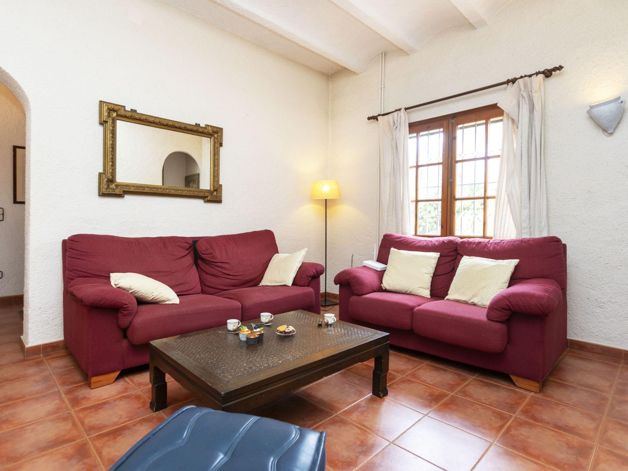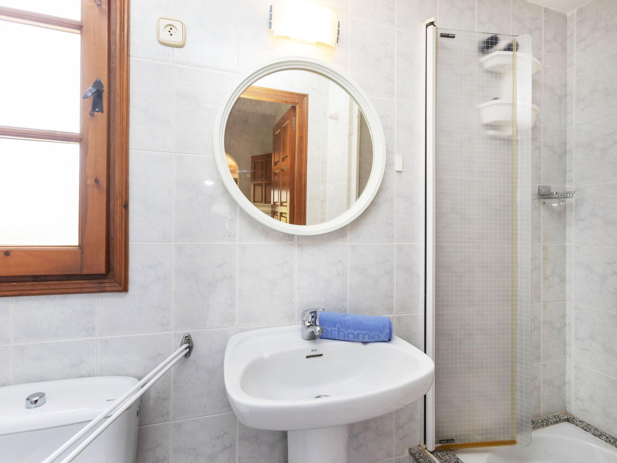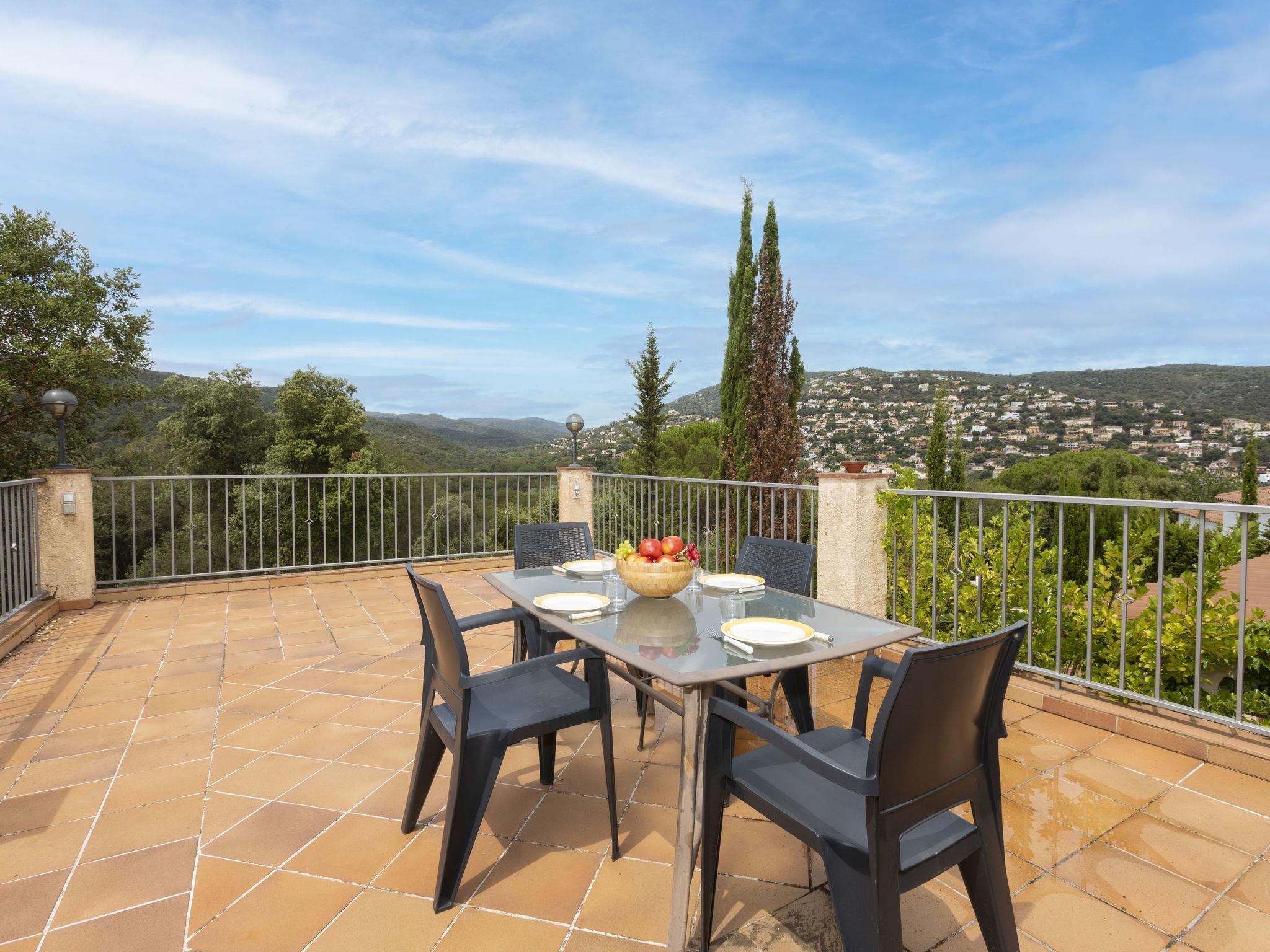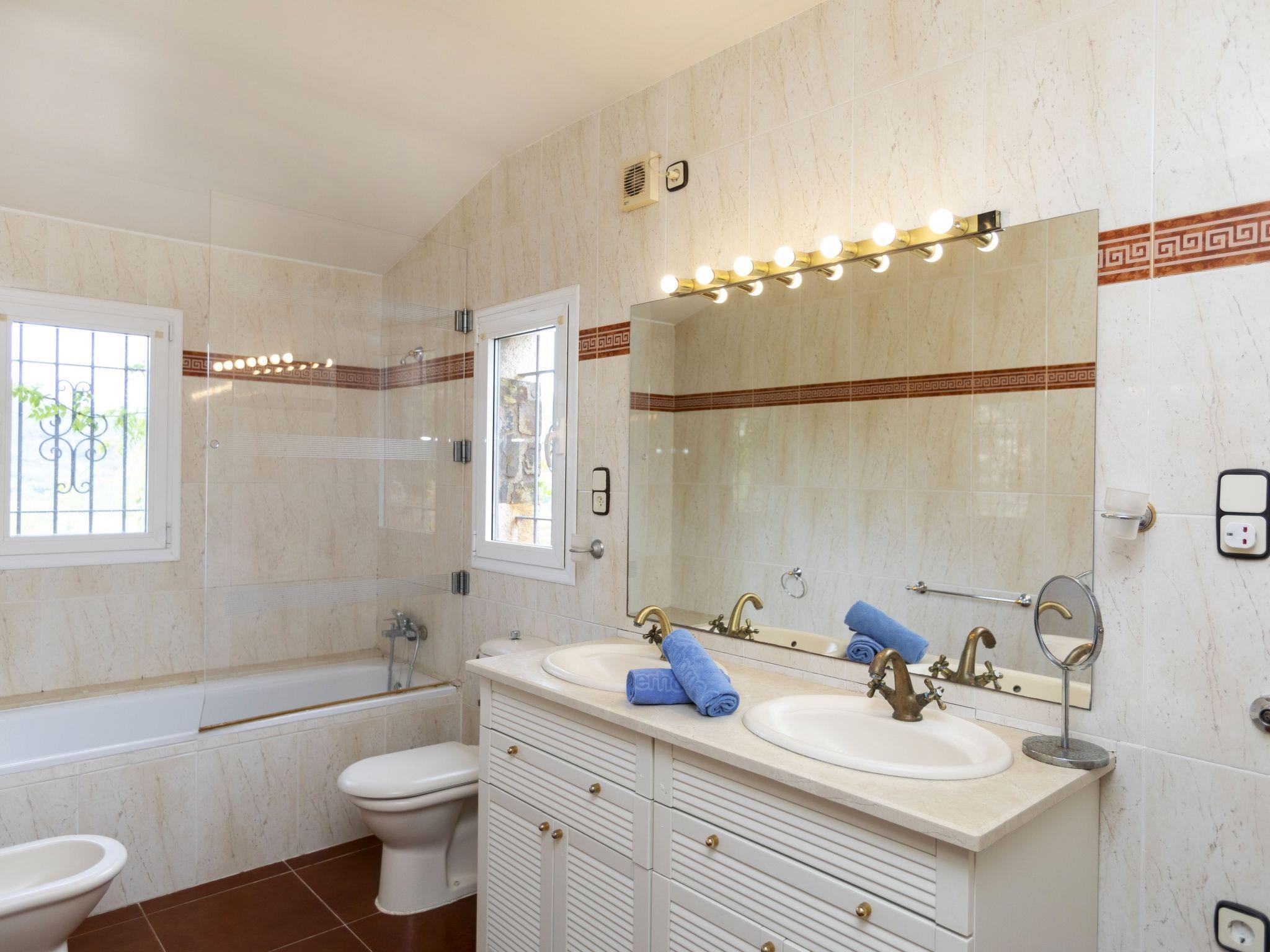 "Can Maggi", 4-room villa 167 m2. Practical furnishings: living/dining room with digital TV. Exit to the garden, to the terrace, to the swimming pool. 1 room with 1 french bed (150 cm, length 190 cm), bath/WC. 1 room with 1 french bed (135 cm, length 190 cm). Open kitchen (dishwasher, 4 ceramic glass hob hotplates, toaster, kettle, microwave, freezer, electric coffee machine). Sep. WC. No heating option. Upper floor: 1 room with 1 french bed (150 cm, length 190 cm), shower/WC. Garden, lawn, large porch. Terrace furniture, deck chairs (4), covered balcony. Panoramic view of the mountains and the countryside. Facilities: washing machine, iron, children's high chair, baby cot, hair dryer. Internet (WiFi, free). Parking at the house. Please note: TV only ES. HUTG-001298 // Reg. Nr.: ESFCTU00001701500017320300000000000000000HUTG-0012987