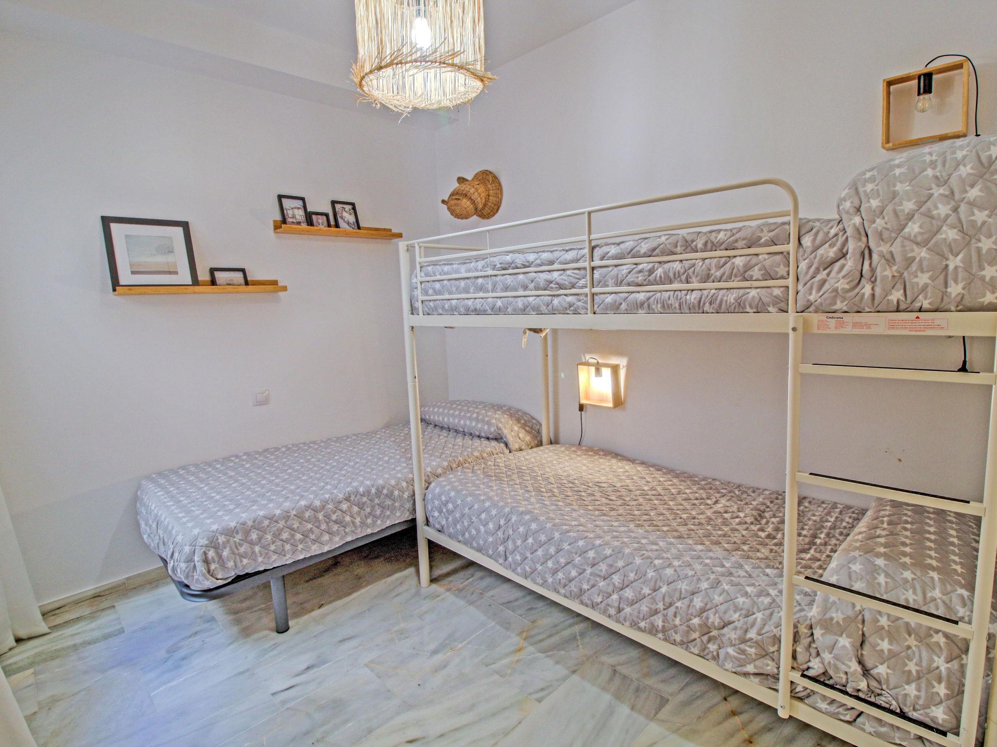 "Calpe Bay", 3-room apartment 80 m2 on 2nd floor. Spacious, comfortable and cosy furnishings: living/dining room with electric heating and air conditioning. Exit to the terrace. 1 room with 1 french bed (150 cm, length 190 cm), air conditioning and forced-air heating. 1 room with 1 bed (90 cm, length 190 cm), 1 x 2 bunk beds (90 cm, length 190 cm), air conditioning and forced-air heating. Kitchen (oven, dishwasher, 4 ceramic glass hob hotplates, toaster, kettle, freezer, electric coffee machine). Bath/WC. Small terrace. Terrace furniture. Distant view of the resort and the ocean. Facilities: washing machine, iron. Parking space n 154 (1 car). Suitable for families. VT-491359-A