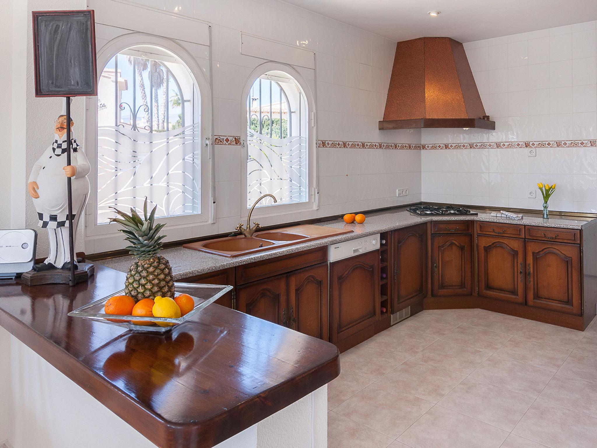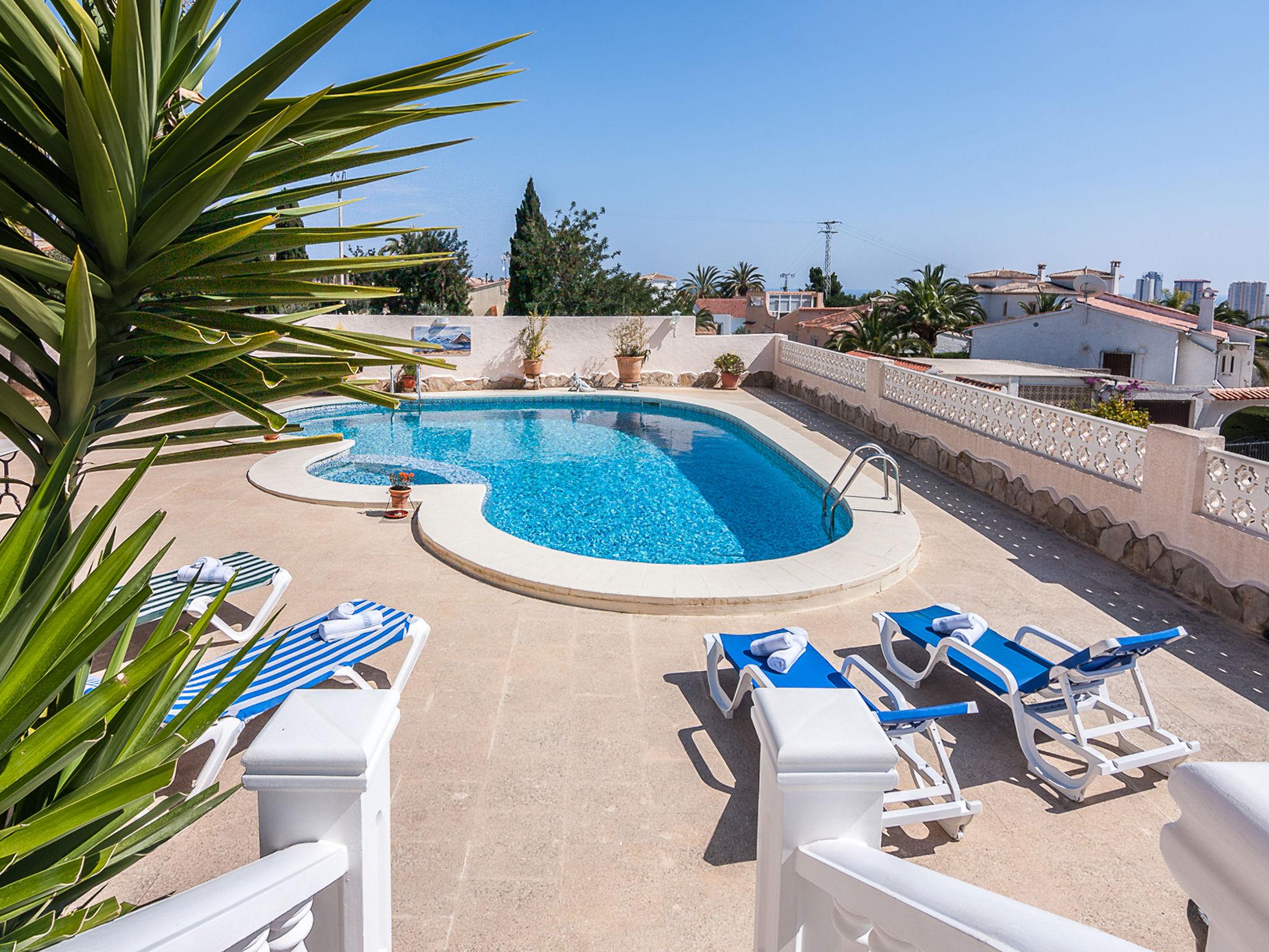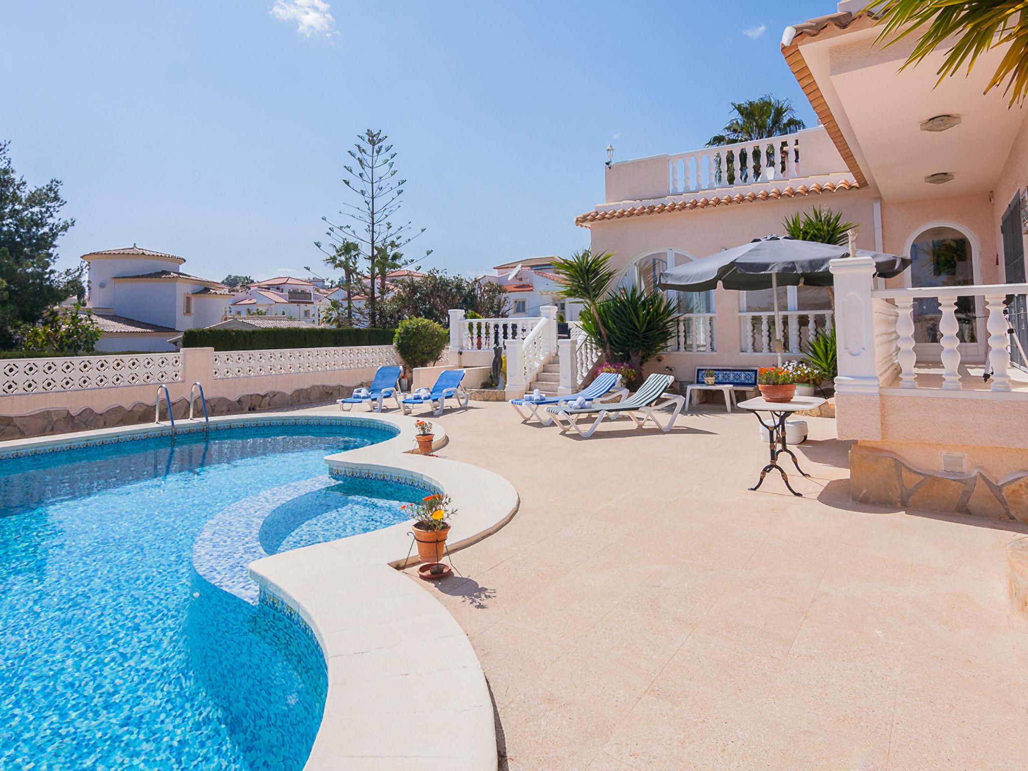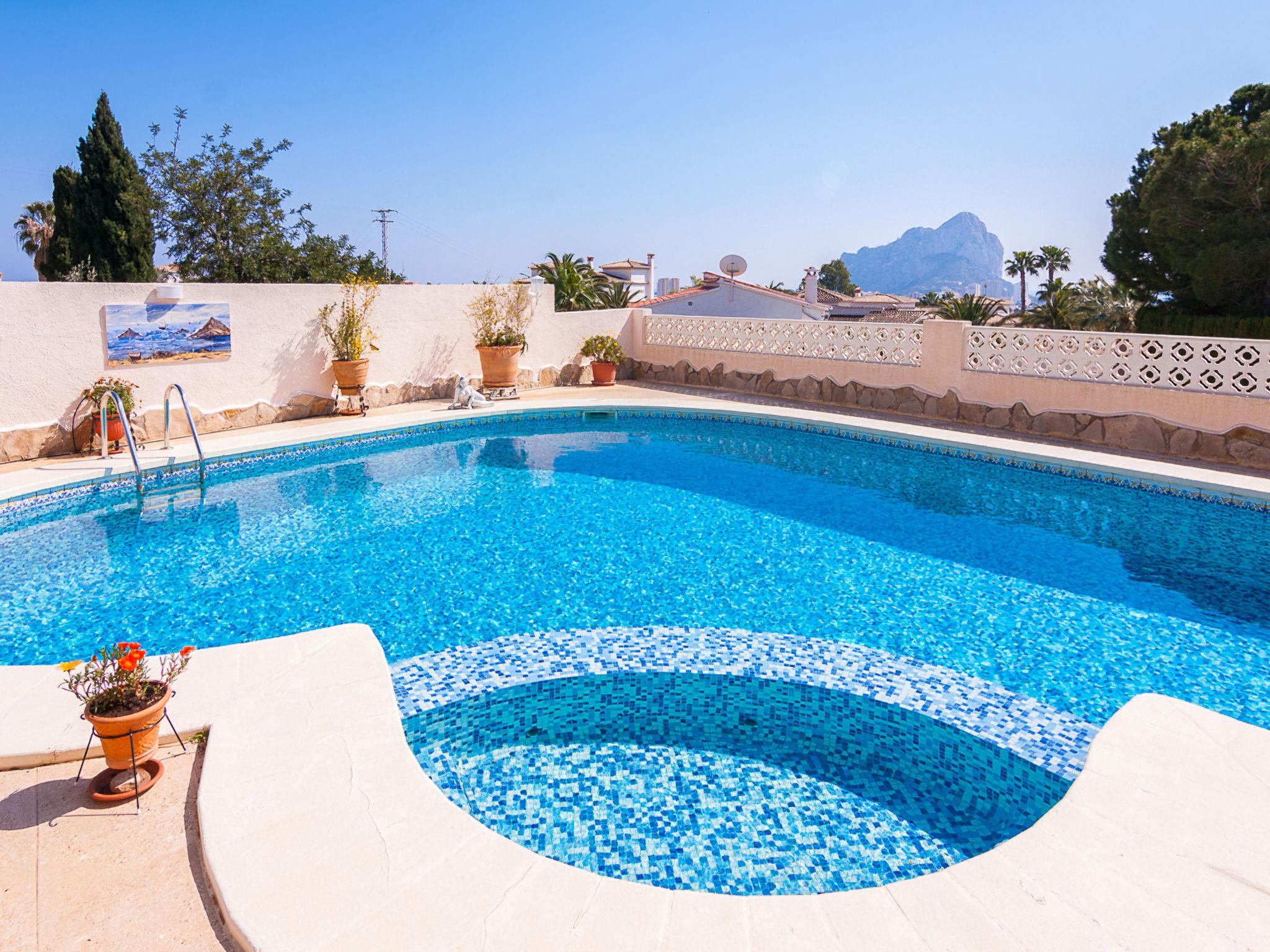 Partida Vallesa: Beautiful, cosy villa "Quito". Outside the resort, 2.9 km from the centre of Calpe, in the district Vallesa, in a secluded, sunny position residential area (villas), 2.1 km from the sea, 2.5 km from the beach. Private: property 820 m2 (fenced), swimming pool kidney shaped, fenced (9 x 5 m, depth 140 - 220 cm, seasonal availability: 01.Jan. - 31.Dec.). Outdoor shower, arbour, terrace, garden furniture, barbecue, pool maintenance by the owner/gardener. Parking. Shop 1.6 km, supermarket 1.6 km, restaurant 900 m, bar, bakery 1.6 km, internet café 900 m, pub garden, 34 minute walk to the centre, bus stop "Bus" 100 m, sandy beach "Playa de la Fosa" 2.5 km, swimming bay 1.9 km. Sports harbour 3.3 km, marina 3.3 km, surf school 3.3 km, sailing school 3.3 km. Nearby attractions: Peñon de Ifach, Salinas de Calpe, Parque de la Vallesa. Please note: baby equipment on request (extra). The owner does not accept any youth groups.