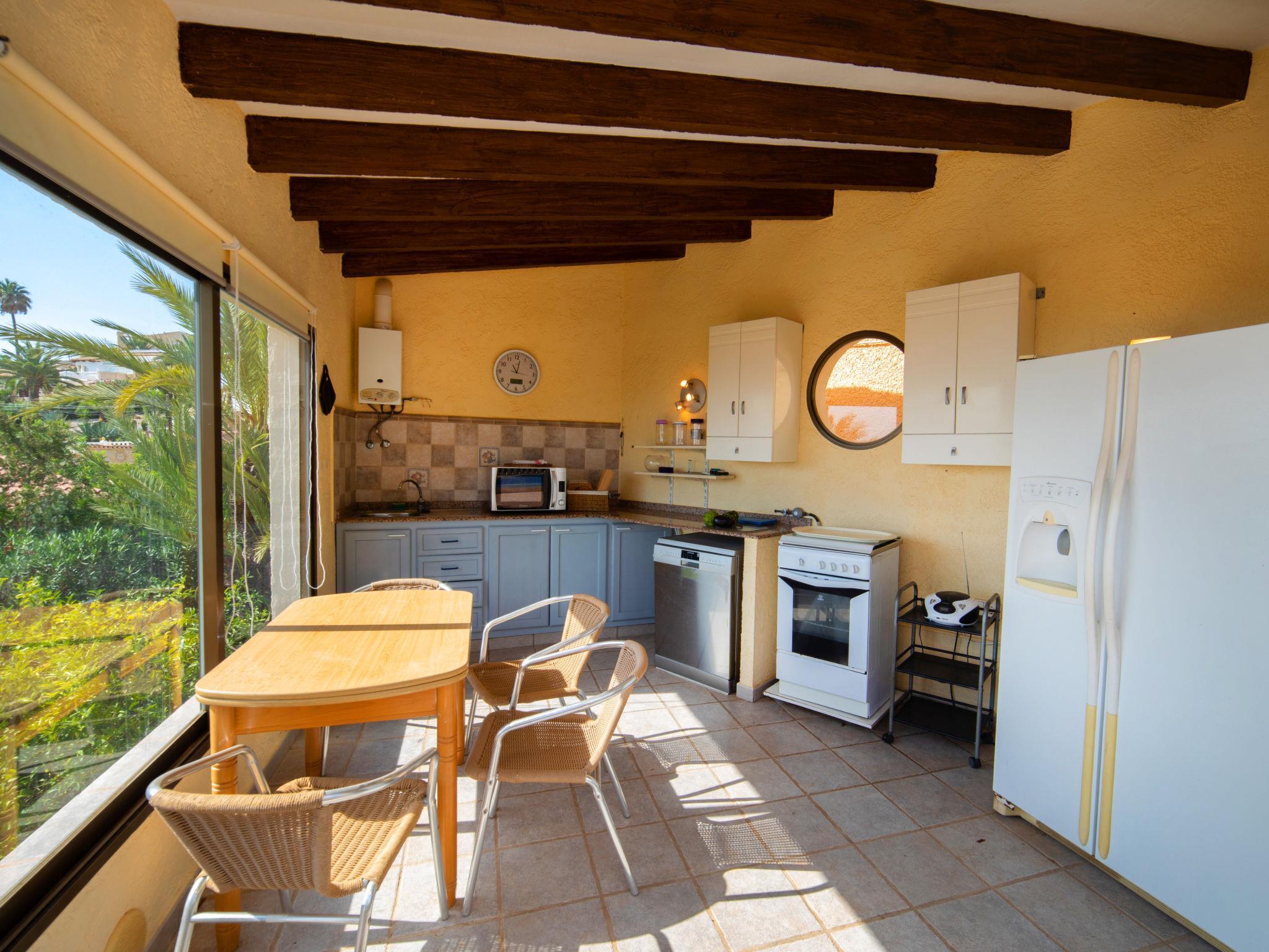 Maryvilla: Beautiful house "Leon", 2 storeys. 2 km from the centre of Calpe, in a sunny, elevated position residential area (villas), 400 m from the sea, 950 m from the beach. Private: property (fenced), swimming pool (10 x 5 m, seasonal availability: 01.Jan. - 31.Dec.). Outdoor shower, pool house with fridge and cooking stove, terrace, garden furniture, barbecue. Grocery 2 km, supermarket 2 km, restaurant, bar 50 m, bus stop "Parada Bus" 2.1 km, sandy beach "Playa Arenal" 3 km, rocky beach "Cala Les Urques" 400 m. Sports harbour 5 km, golf course (9 hole) 15 km. Nearby attractions: Aqualandia, Mundomar, Terra Mítica, Terra Natura, Benidorm Palace (Benidorm), Les Fonts de l'Algar, Castillo de Guadalest. The owner does not accept any youth groups.