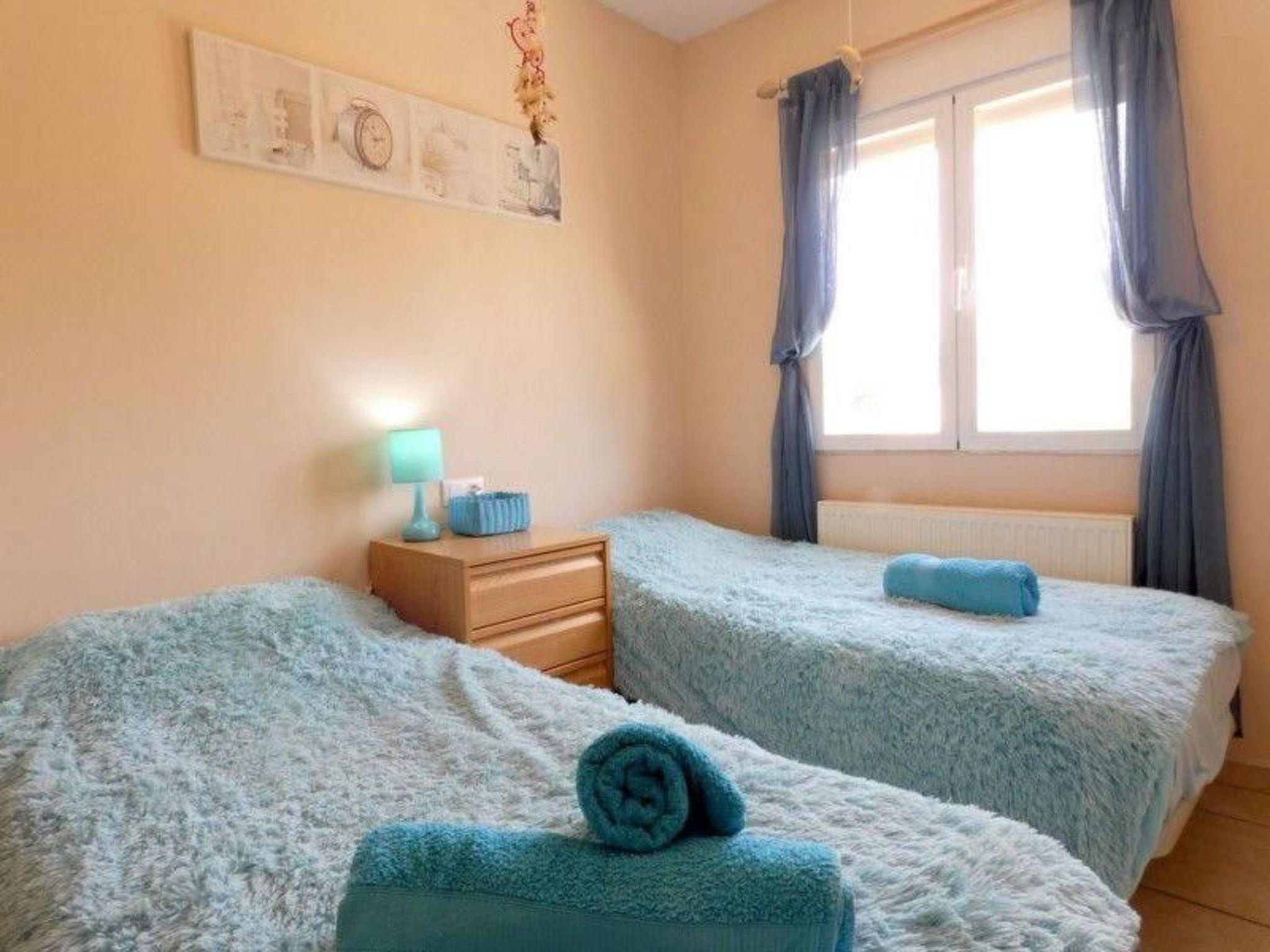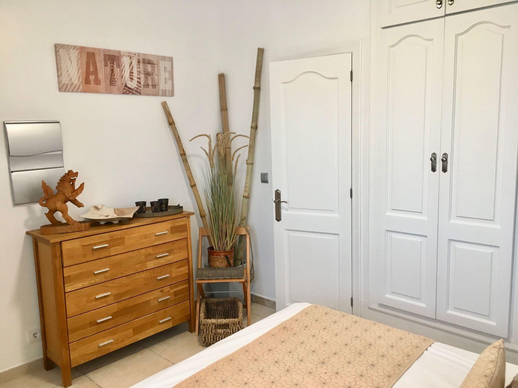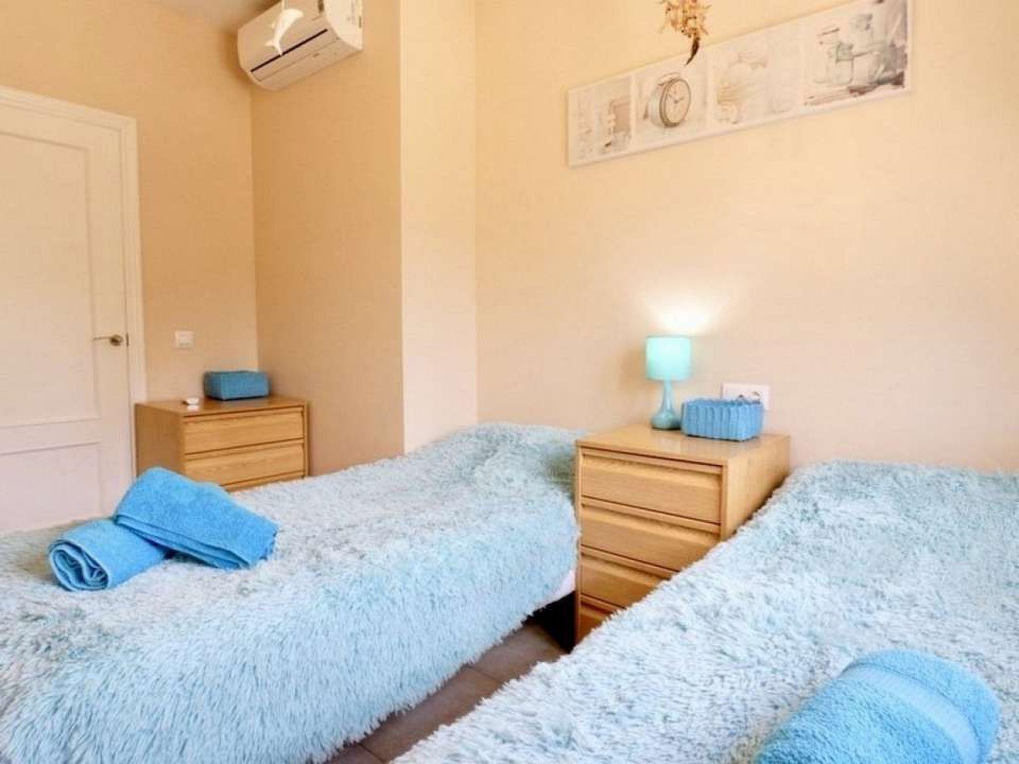 The apartment in the ground floor comprises a kitchen, small shower room/toilet sink, entrance hall, leading to open plan dining area and living room with two large sofas, which leads on to a large balcony with outdoor dining table and chairs ( for 6 persons). The apartment has 2 bedrooms, one bedroom with two single beds, and another with king size bed and suite bathroom. This apartment can enjoy of common places like the garden, swimming pool and exterior kitchen and terrace.