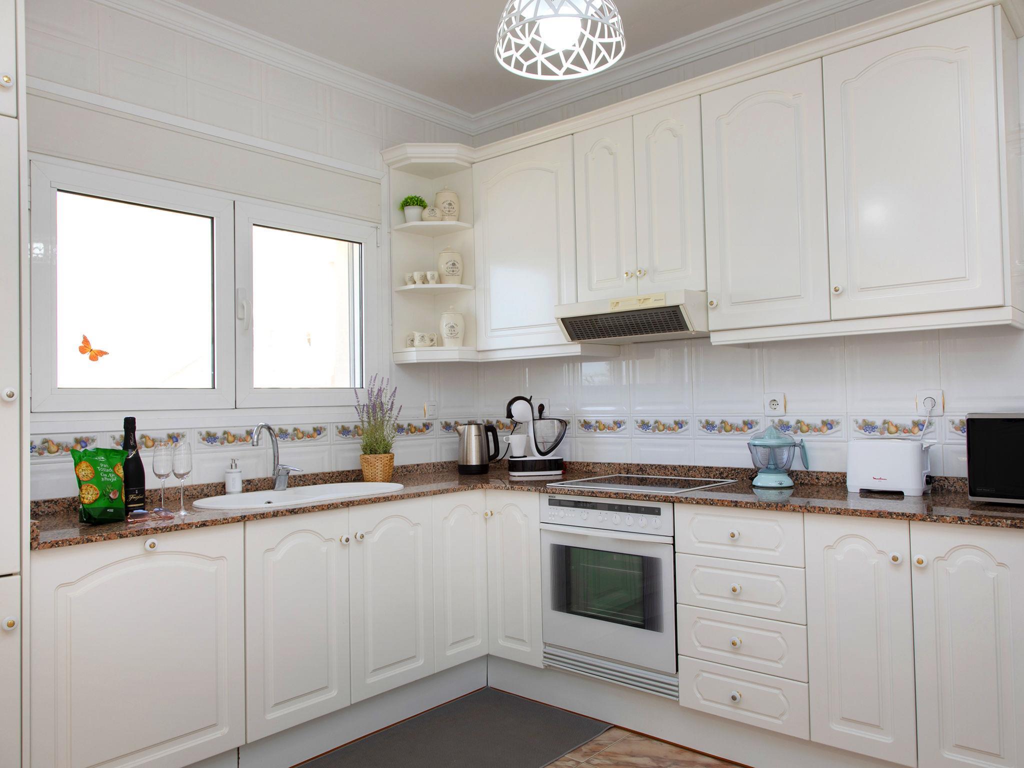 Vallesa: Large, beautiful villa "La Escapada", 2 storeys. In the resort 3.8 km from the centre of Calpe, in the district La Vallesa, in a quiet, sunny position residential area (villas), traffic calmed area, 1.5 km from the sea, 1.5 km from the beach, in a cul-de-sac. Private: property 1'000 m2 (fenced), swimming pool heated (11 x 4 m, seasonal availability: 01.Jan. - 31.Dec., extra) with internal staircase and salt-electrolysis pool-cleaning system. Outdoor shower, terrace, barbecue house, pool maintenance by the owner/gardener. In the house: central heating system, heating available only from 01.Nov. - 31.Mar.. Parking. Grocery 1.4 km, supermarket 1.4 km, restaurant 850 m, bar, café, pedestrian zone 100 m, pub garden 850 m, bus stop "Para La vallesa" 170 m, sandy beach "Playa de la Fossa" 1.5 km. Sports harbour 3 km, marina 3 km, golf course (9 hole) 13.7 km, surf school 3 km, sailing school 3 km, tennis 2.5 km. Nearby attractions: Aqualandia, Mundomar, Terra Mítica, Terra Natura, Benidorm Palace (Benidorm), Castillo de Guadalest. Please note: suitable for families, suitable for seniors baby equipment (included). The owner does not accept any youth groups. Neighbourhood highly sensitive to noise. Quietness and good behaviour expected. Heated swimming pool (November-March), extra. Reservation must be made at least one week before arrival.