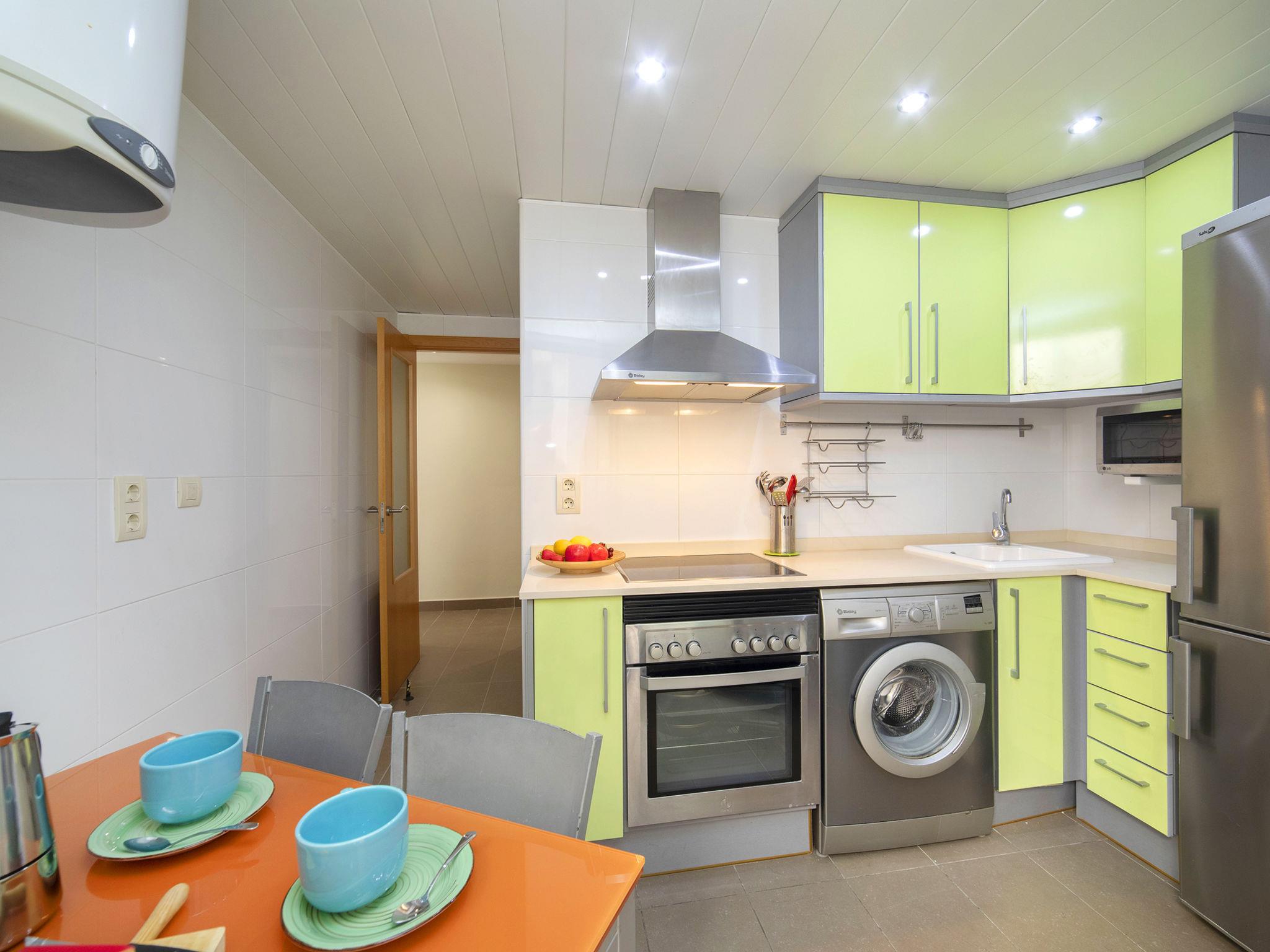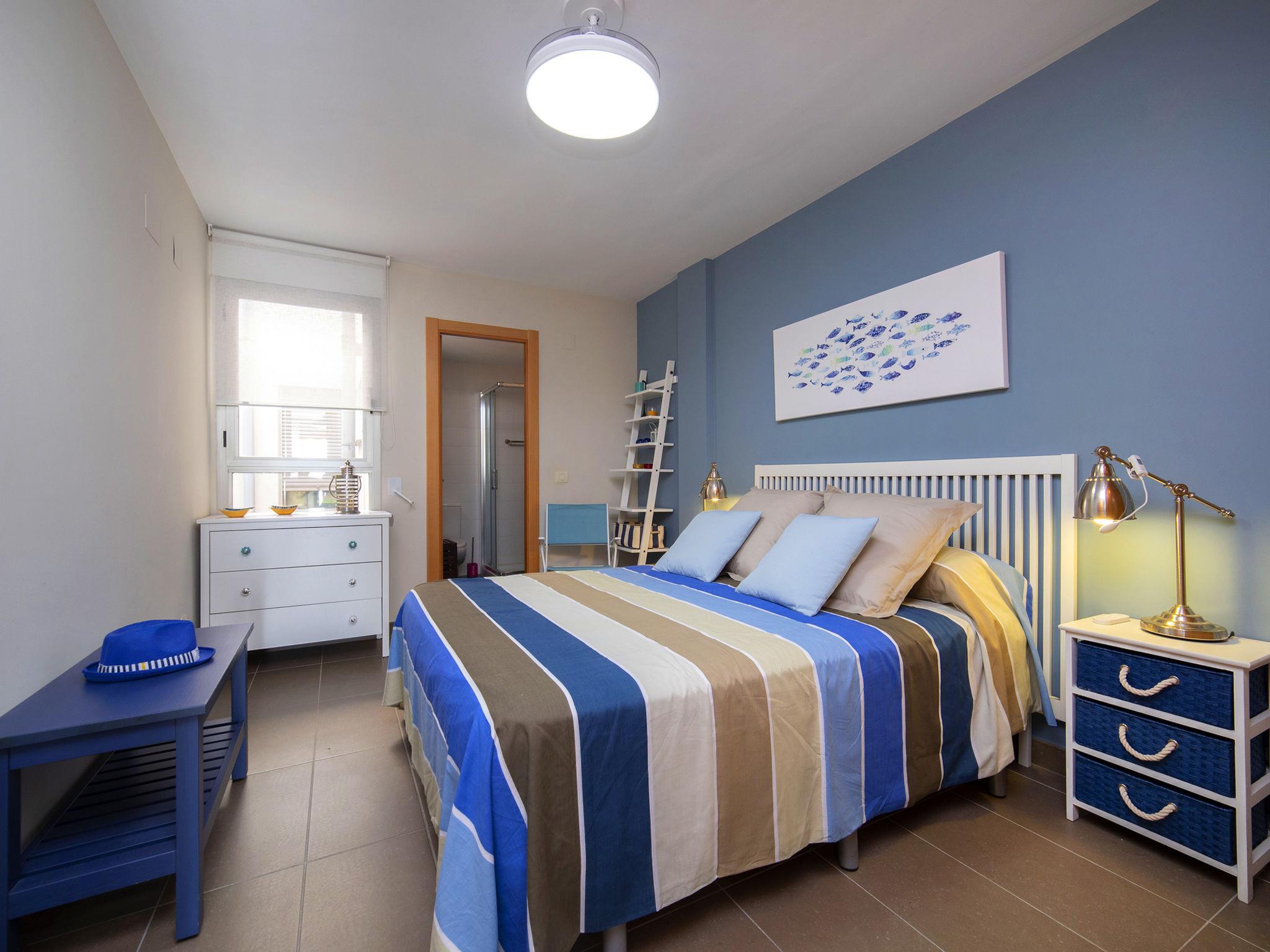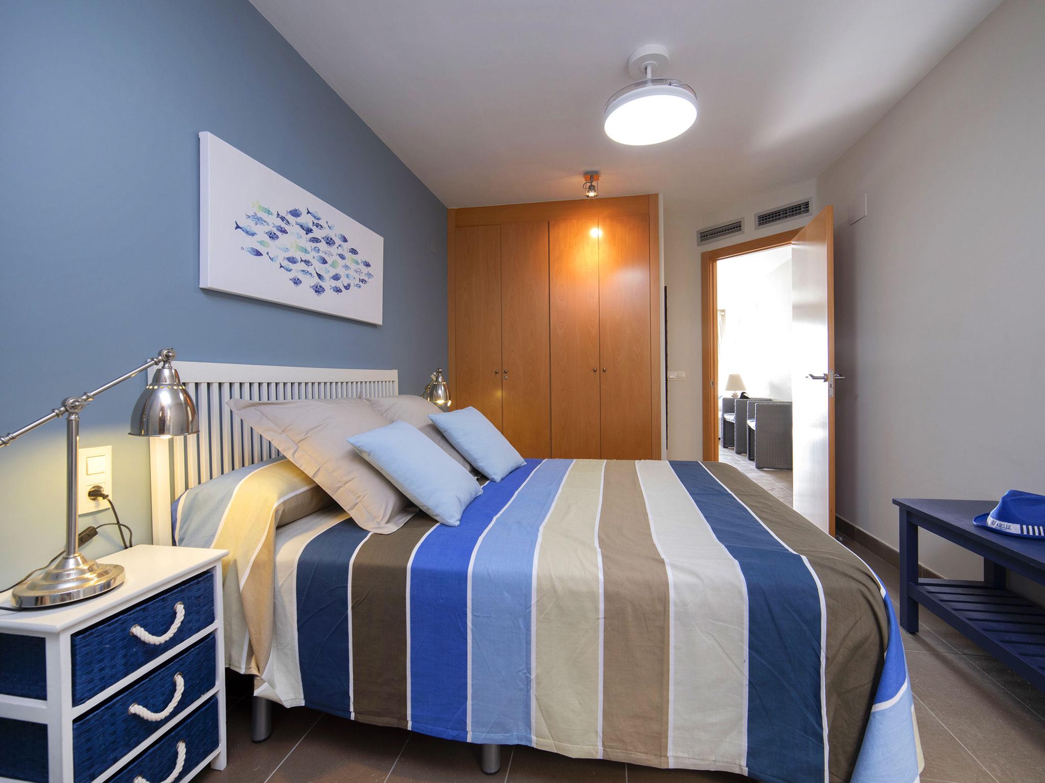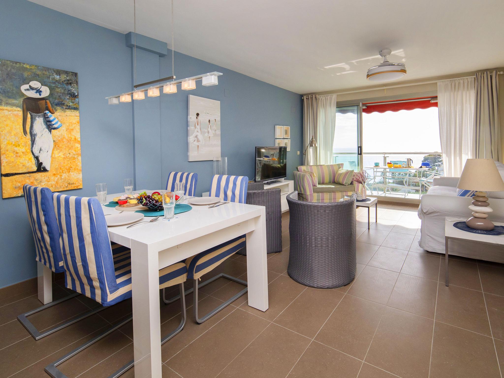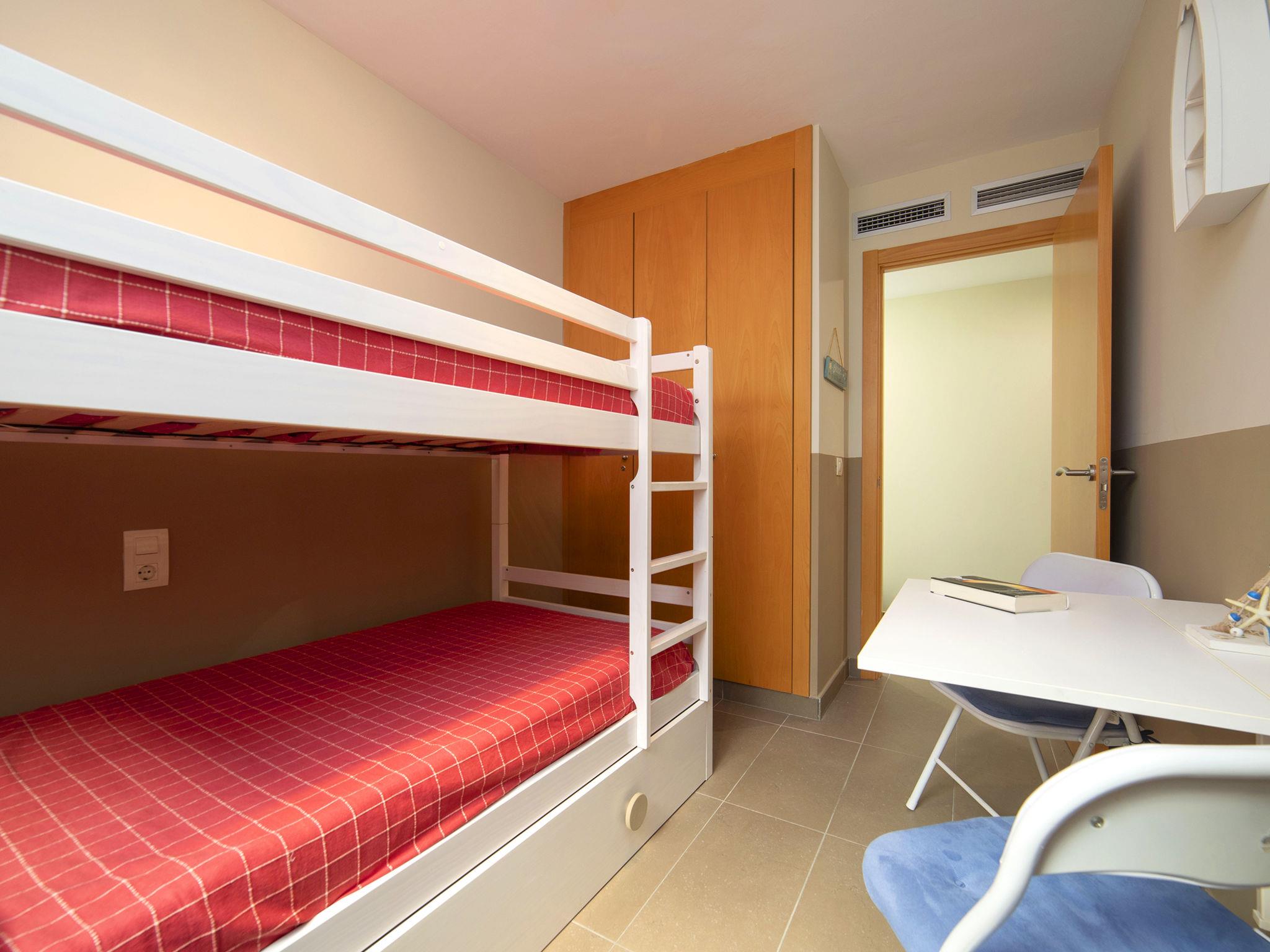 "Borumbot", 3-room apartment 81 m2 on 3rd floor. Object suitable for 2 adults + 2 children. Spacious and bright, beautiful and cosy furnishings: living/dining room with satellite TV, digital TV, air conditioning, fan and forced-air heating. Exit to the terrace. 1 room with 1 french bed (1 x 180 cm, length 200 cm), shower/WC, air conditioning, fan and forced-air heating. 1 room with 1 x 2 bunk beds (80 cm, length 190 cm) (2 x), air conditioning and forced-air heating. Kitchen (oven, 4 ceramic glass hob hotplates, toaster, kettle, microwave, electric coffee machine). Bath/bidet/WC. Terrace furniture. Very beautiful view of the sea, the resort and the town. Facilities: washing machine, iron, children's high chair, baby cot, hair dryer. Internet (WiFi, free). Parking (roofed). Please note: non-smoking house. VT-513427-A // Reg. Nr.: ESFCTU00000302900067231100000000000000000VT-513427-A1