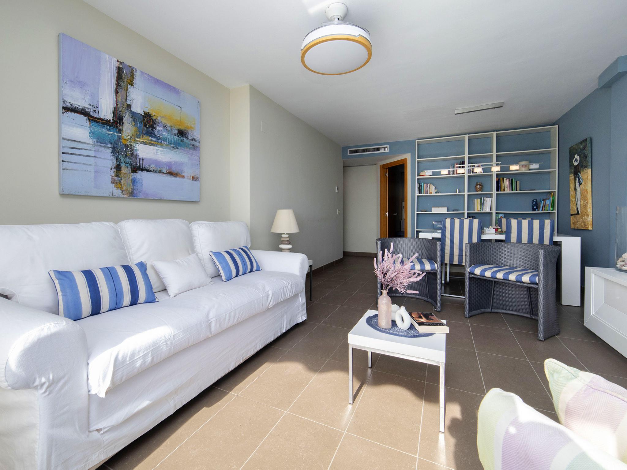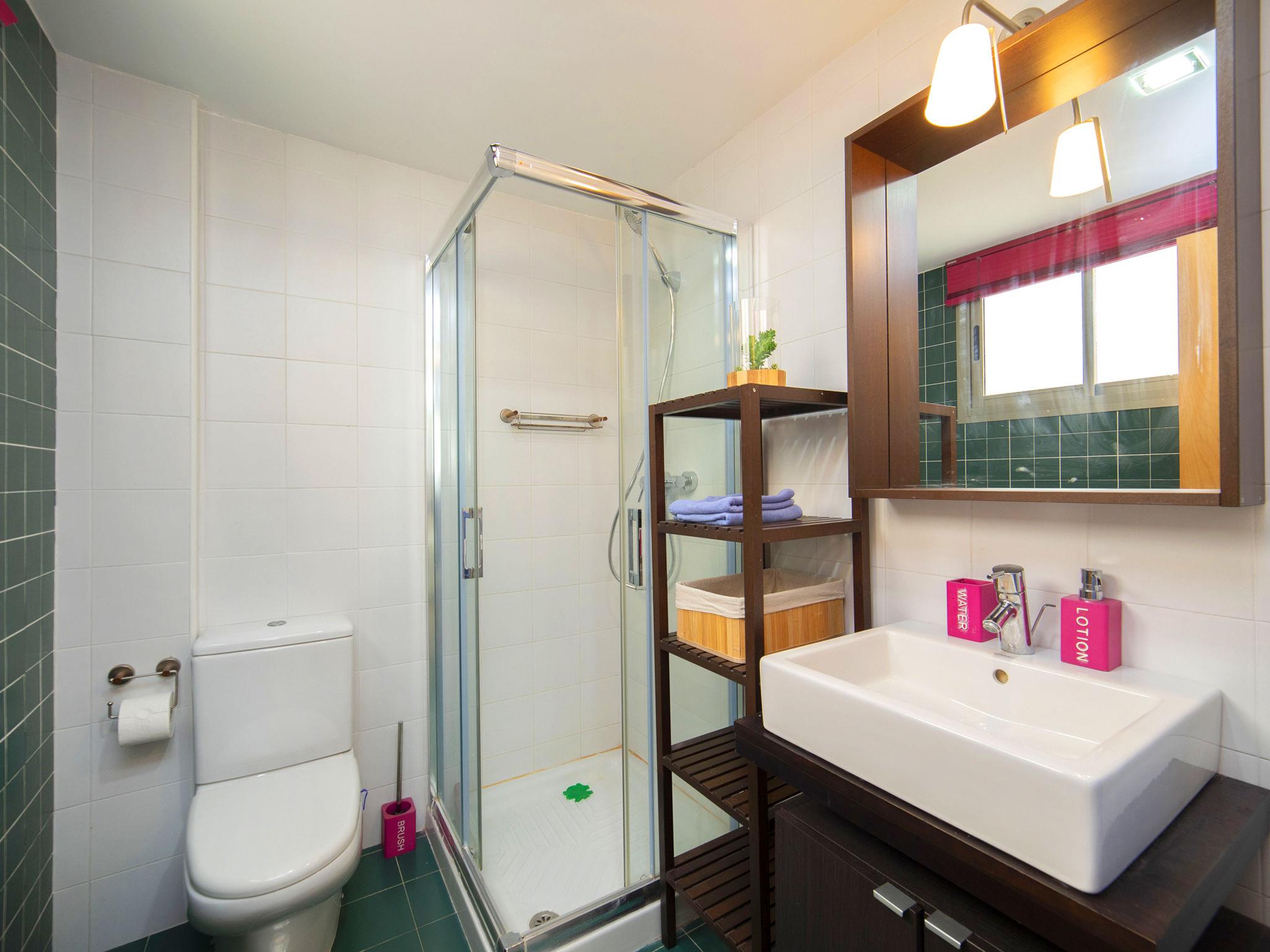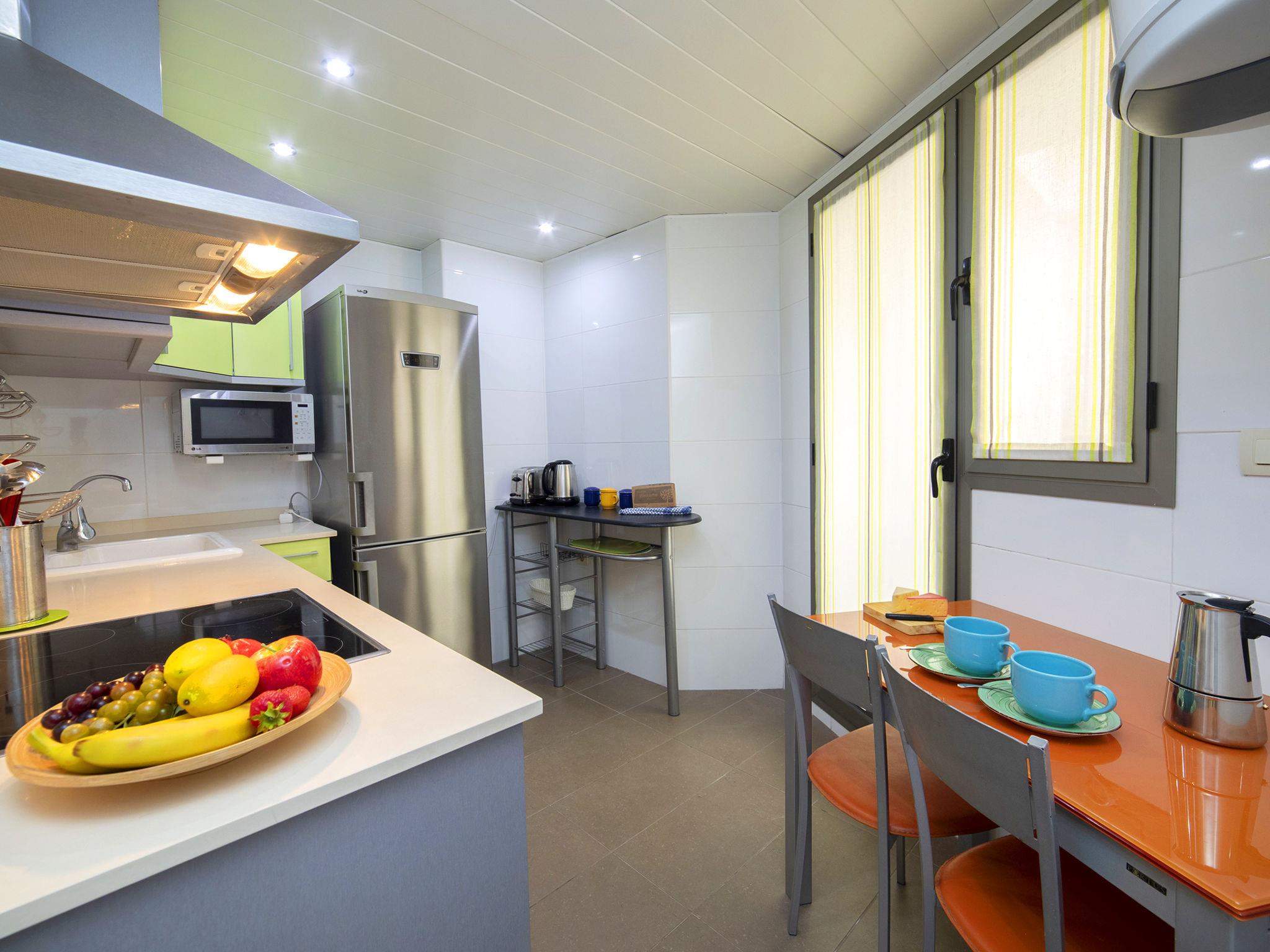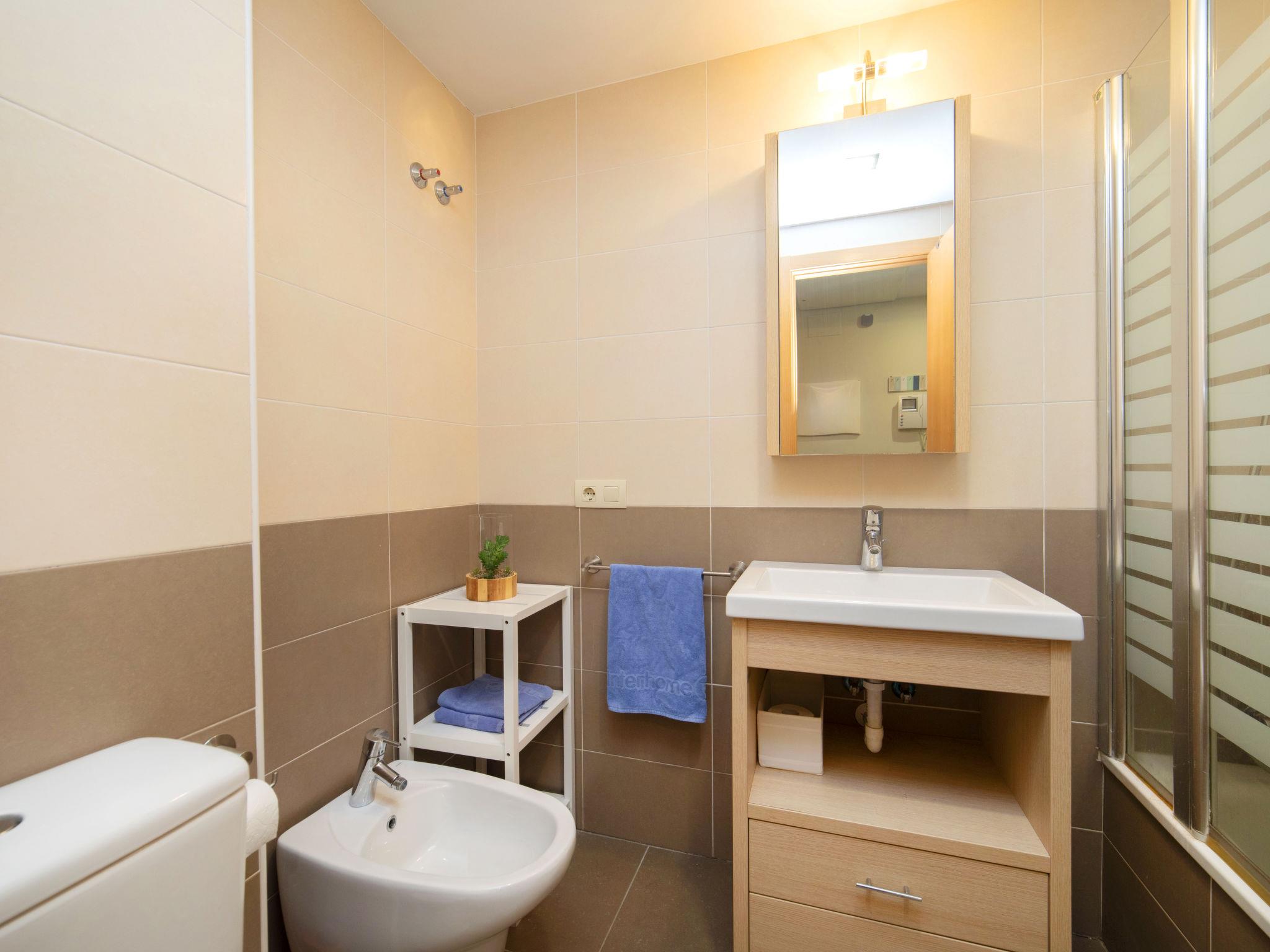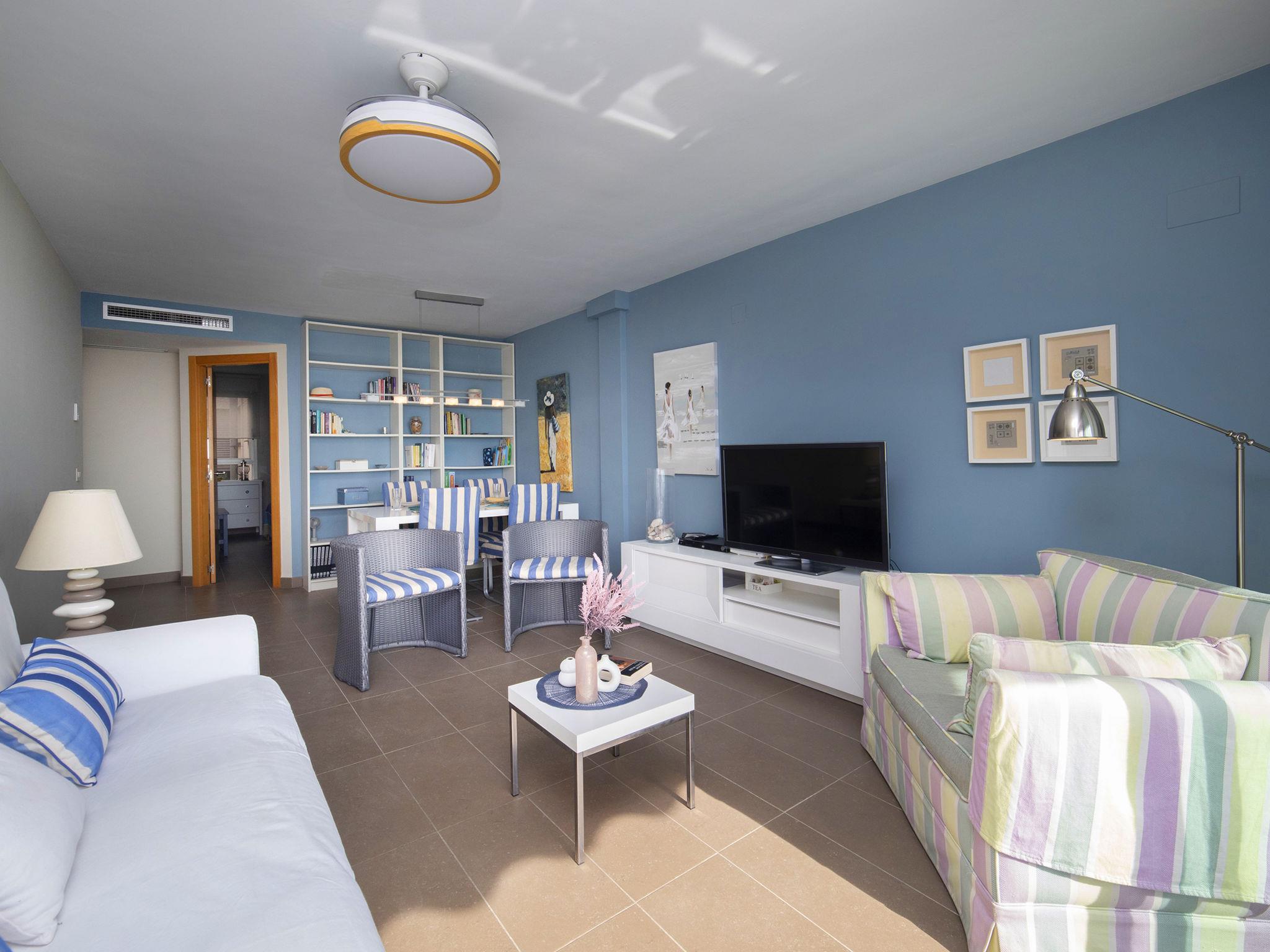 "Borumbot", 3-room apartment 81 m2 on 3rd floor. Object suitable for 2 adults + 2 children. Spacious and bright, beautiful and cosy furnishings: living/dining room with satellite TV, digital TV, air conditioning, fan and forced-air heating. Exit to the terrace. 1 room with 1 french bed (1 x 180 cm, length 200 cm), shower/WC, air conditioning, fan and forced-air heating. 1 room with 1 x 2 bunk beds (80 cm, length 190 cm) (2 x), air conditioning and forced-air heating. Kitchen (oven, 4 ceramic glass hob hotplates, toaster, kettle, microwave, electric coffee machine). Bath/bidet/WC. Terrace furniture. Very beautiful view of the sea, the resort and the town. Facilities: washing machine, iron, children's high chair, baby cot, hair dryer. Internet (WiFi, free). Parking (roofed). Please note: non-smoking house. VT-513427-A // Reg. Nr.: ESFCTU00000302900067231100000000000000000VT-513427-A1