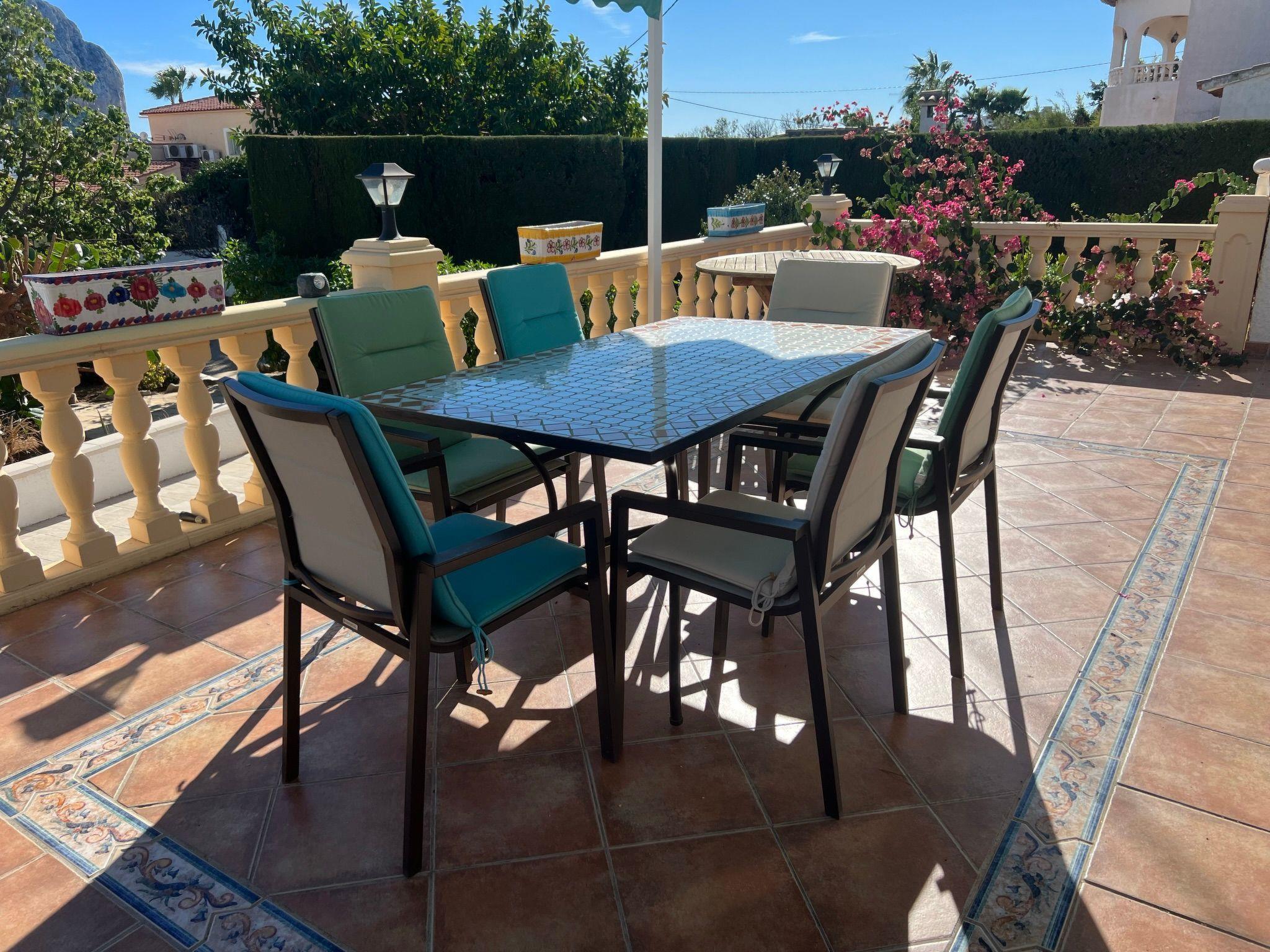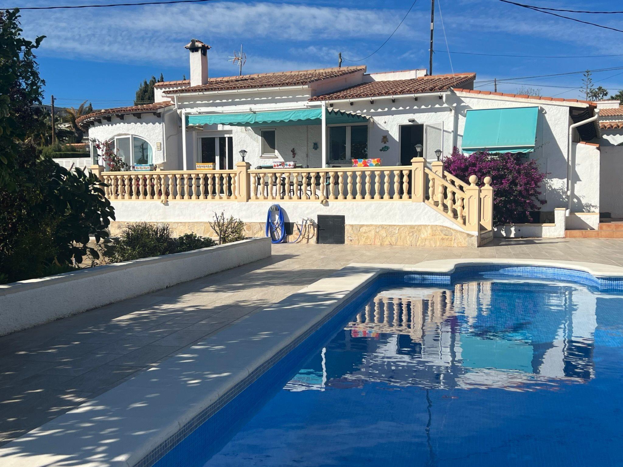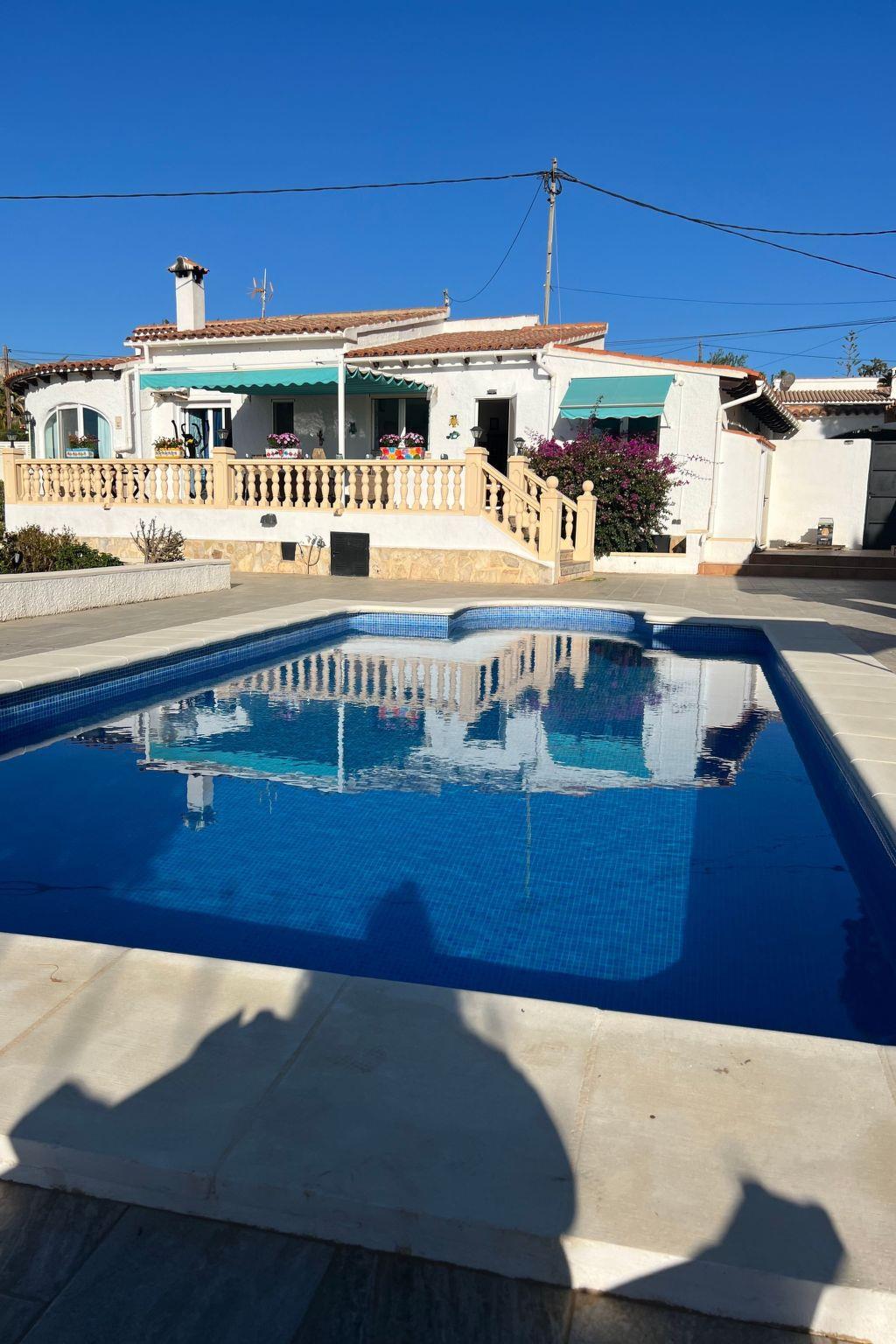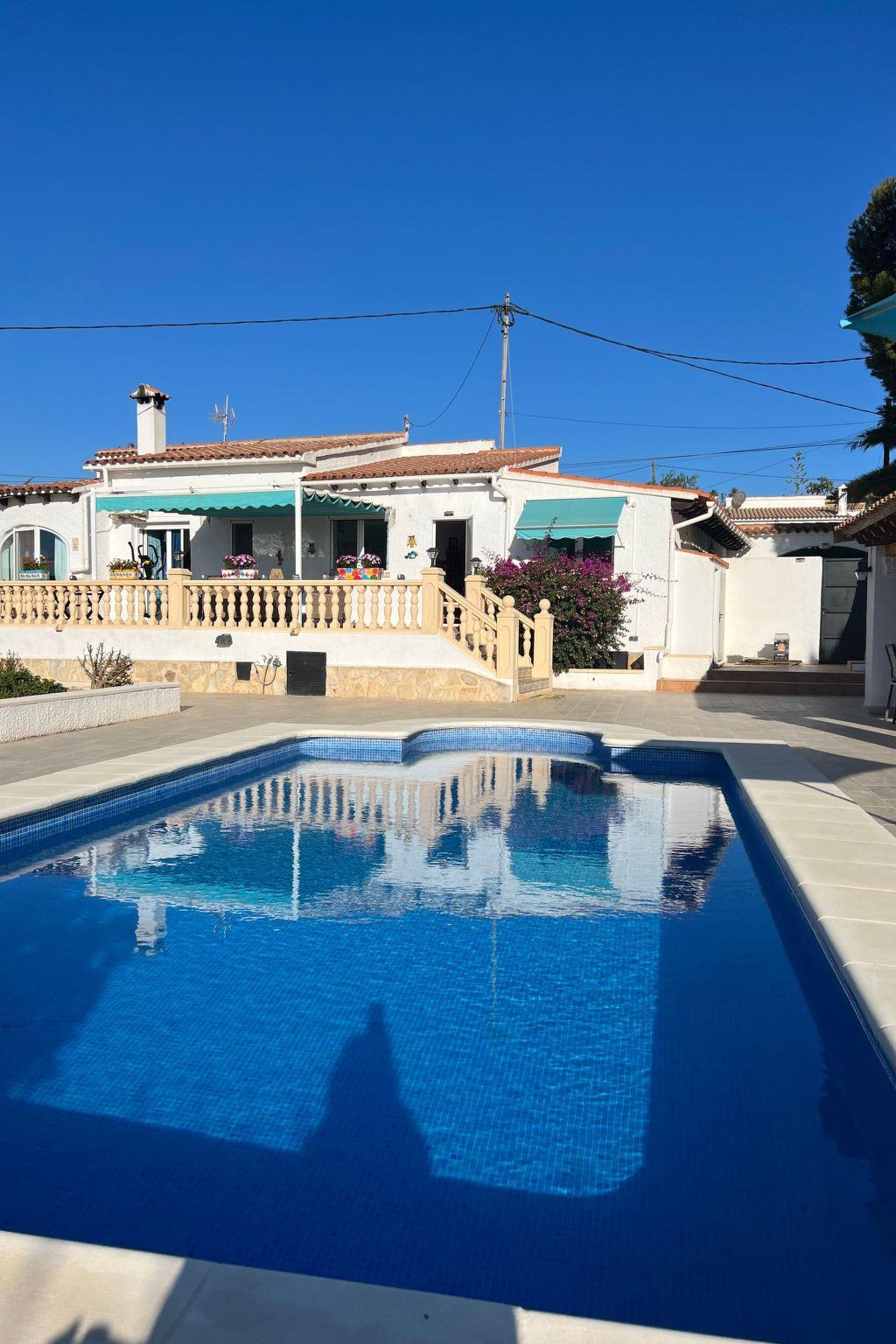 Relax and enjoy a wonderful and exceptional villa with a large private pool area. Our detached house is located in the quiet, tranquil Ortembach urbanisation, which is very centrally located. It is a leisurely 10 minute walk to the nearest shops, bars and restaurants. There is a small supermarket in the immediate vicinity. The beautiful old town of the town is about 2 kilometres away, the nearest large sandy beach can be reached on foot in about 15 minutes.our house is extremely spacious, colourful and originally furnished. It offers space for a maximum of 8 people to spend an unforgettable holiday and enjoy 300 days of sunshine a year.the villa is on one level and has a living space of approx. 140 sqm: four bedrooms, three bathrooms, exceptionally large kitchen with dishwasher, washing machine, freezer, microwave, large living room with fireplace, satellite TV, WIFI, dining room, large terrace with sun protection.Our villa is completely fenced, the large property is equipped with a gate, parking spaces for 2 cars are available, as well as sun loungers and parasols, enjoy the peace and quiet on our sun terrace or at the spacious pool area, harvest fresh fruit in our beautiful approx. 400 square metre Mediterranean garden. You can refresh yourself to your heart's content in the large 4x8 metre pool, which you can reach via a staircase leading directly into the water. Even when fully occupied, our outdoor area offers you the opportunity to retreat to one of the sun loungers and find your own sunbathing spot at any time, and you can prepare a wonderful paella in our very well-equipped kitchen or grill something delicious on the barbecue. In the evening, the garden and pool become a beautifully lit feast for the eyes and you can end the day romantically with a good vino.In addition to the all-day sun terrace, there is a covered seating and dining area so that you can spend the day outside around the clock.We have equipped our villa as our second home and is ideal for families with children. In addition to a travel cot, we are happy to provide you with a high chair and children's toys so that your little ones can also feel at home.Calpe offers numerous attractions and entertainment options, water sports, climbing, hiking, nice shops, nice beach bars, supermarkets including Lidl and Aldi, original fish restaurants at the harbour, horse-drawn carriage rides, discos, there is something for everyone.But the surrounding area also has a lot to offer: golfers and cyclists will get their money's worth here, hikers will find exceptional hiking trails in the nearby mountains, in January/February you can enjoy the almond blossom in the Jalon valley, Aqualandia (water park with numerous slides), Mundomar (marine and exotic animal park), Terra Mitica (amusement park) are great fun for young and old. Take a trip to the Jalon Valley (wine-growing region), where there is a very original market on Saturdays, visit the Algar waterfalls, which are a real treat, especially in the height of summer, or the Canelobre caves. Guadelest, an old mountain village, is also worth a visit.