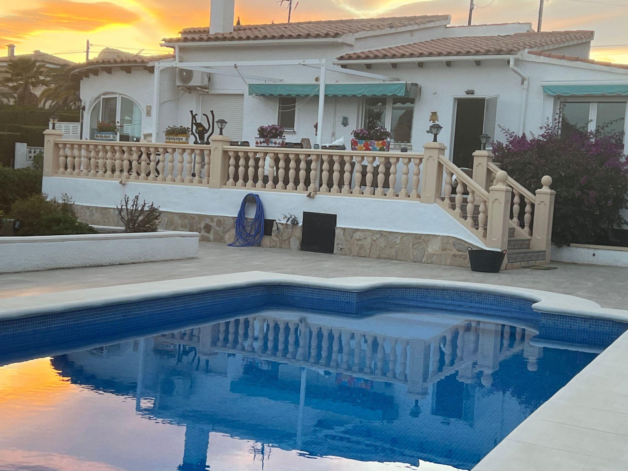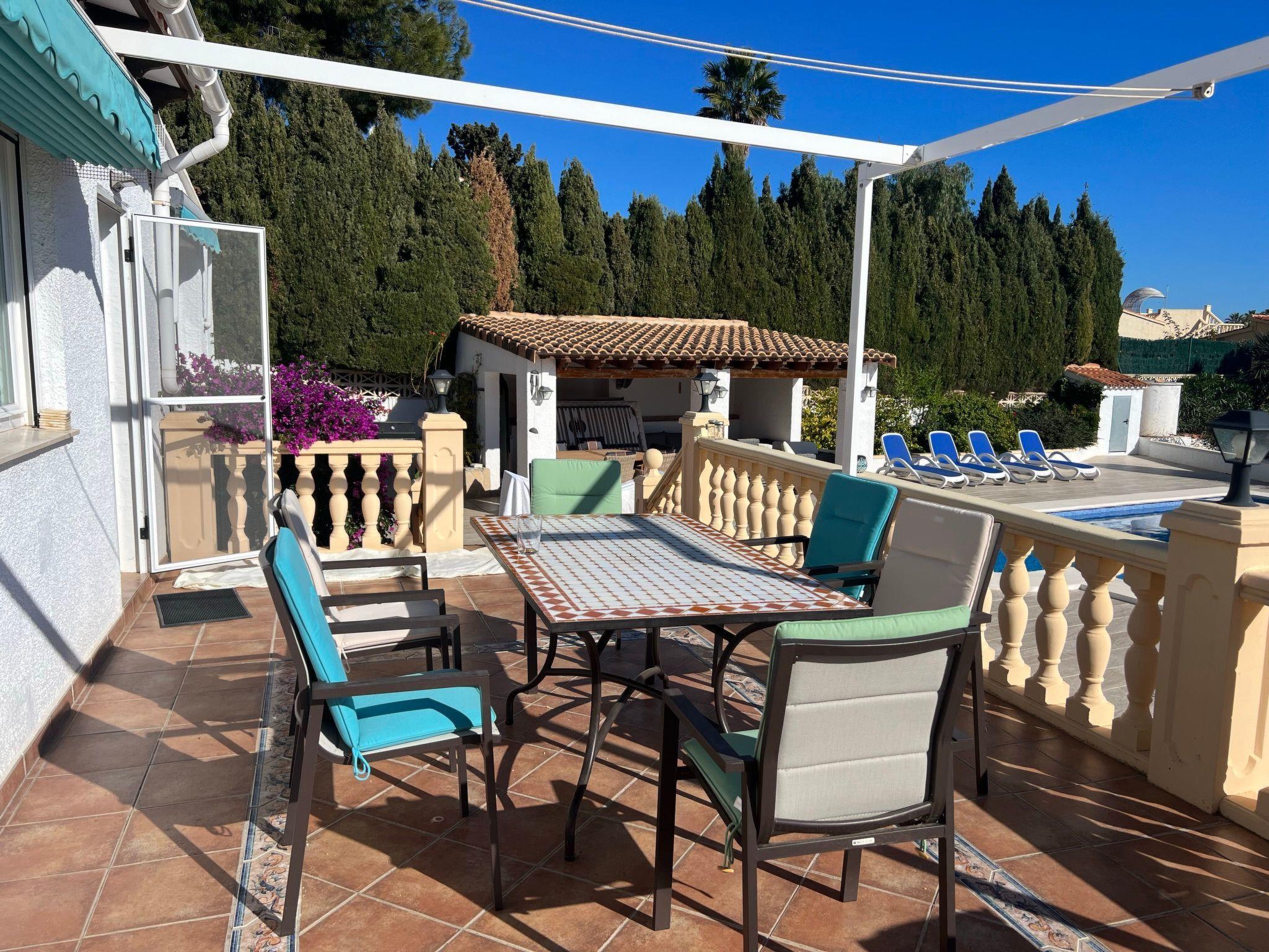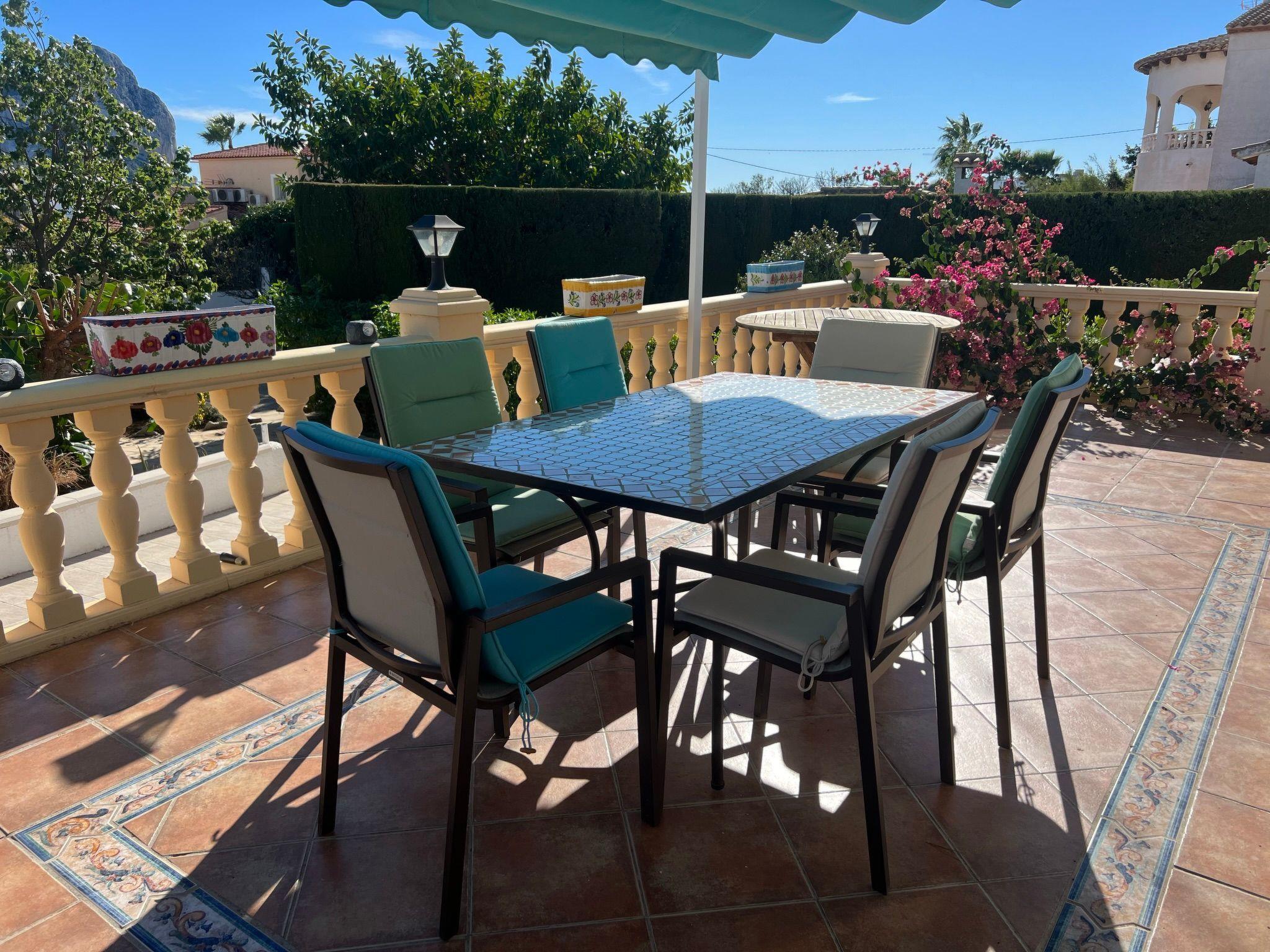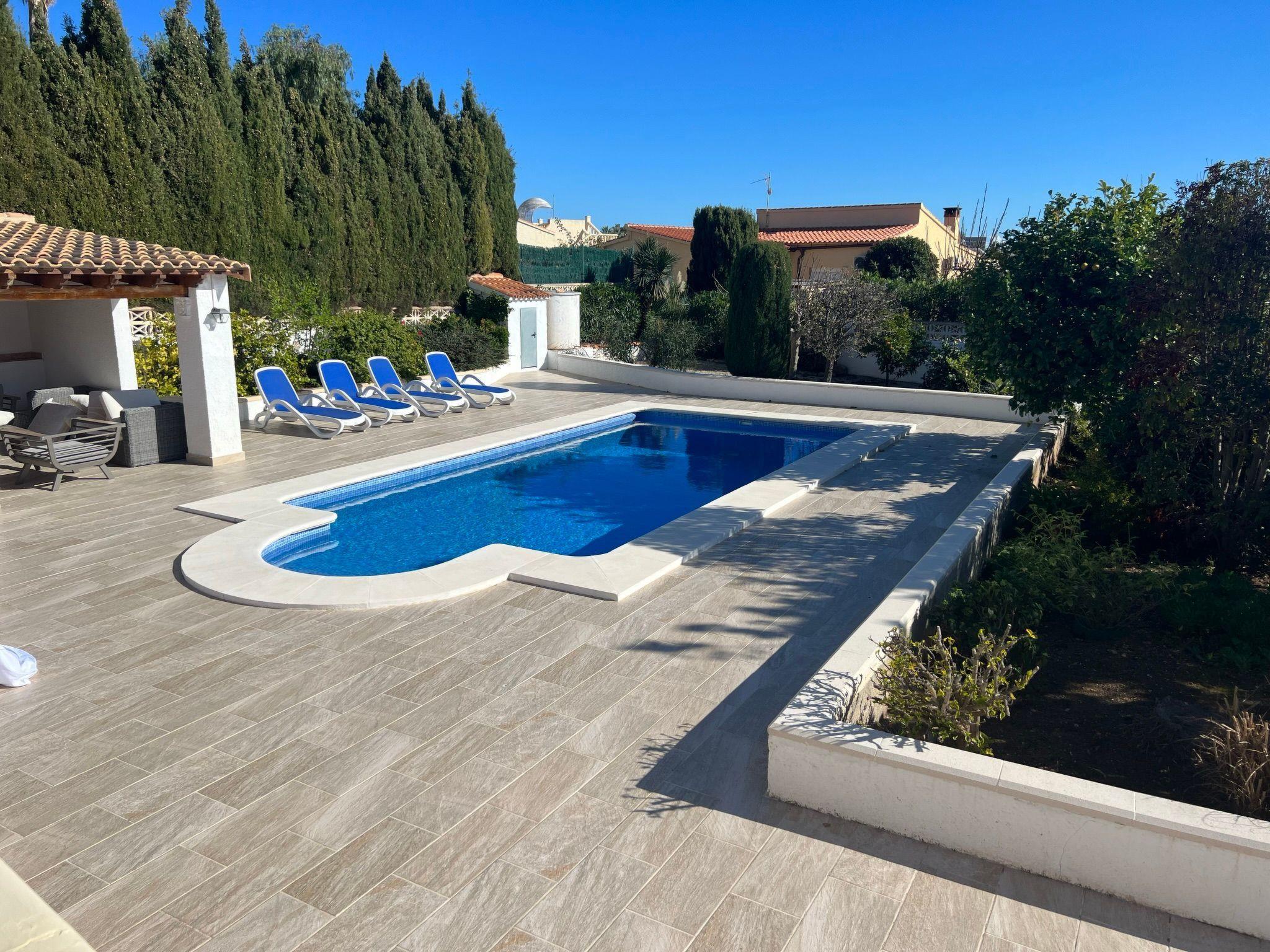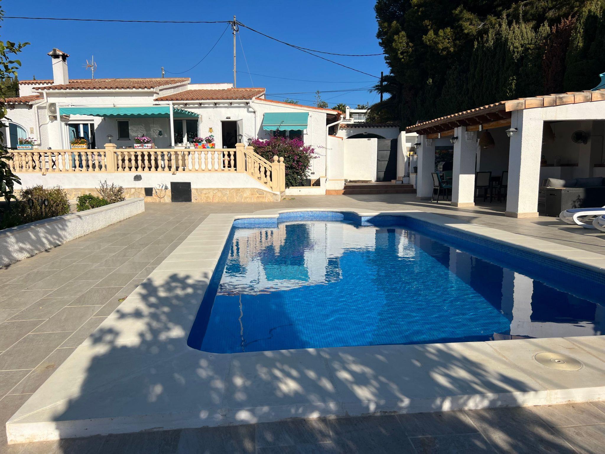 Relax and enjoy a wonderful and exceptional villa with a large private pool area. Our detached house is located in the quiet, tranquil Ortembach urbanisation, which is very centrally located. It is a leisurely 10 minute walk to the nearest shops, bars and restaurants. There is a small supermarket in the immediate vicinity. The beautiful old town of the town is about 2 kilometres away, the nearest large sandy beach can be reached on foot in about 15 minutes.our house is extremely spacious, colourful and originally furnished. It offers space for a maximum of 8 people to spend an unforgettable holiday and enjoy 300 days of sunshine a year.the villa is on one level and has a living space of approx. 140 sqm: four bedrooms, three bathrooms, exceptionally large kitchen with dishwasher, washing machine, freezer, microwave, large living room with fireplace, satellite TV, WIFI, dining room, large terrace with sun protection.Our villa is completely fenced, the large property is equipped with a gate, parking spaces for 2 cars are available, as well as sun loungers and parasols, enjoy the peace and quiet on our sun terrace or at the spacious pool area, harvest fresh fruit in our beautiful approx. 400 square metre Mediterranean garden. You can refresh yourself to your heart's content in the large 4x8 metre pool, which you can reach via a staircase leading directly into the water. Even when fully occupied, our outdoor area offers you the opportunity to retreat to one of the sun loungers and find your own sunbathing spot at any time, and you can prepare a wonderful paella in our very well-equipped kitchen or grill something delicious on the barbecue. In the evening, the garden and pool become a beautifully lit feast for the eyes and you can end the day romantically with a good vino.In addition to the all-day sun terrace, there is a covered seating and dining area so that you can spend the day outside around the clock.We have equipped our villa as our second home and is ideal for families with children. In addition to a travel cot, we are happy to provide you with a high chair and children's toys so that your little ones can also feel at home.Calpe offers numerous attractions and entertainment options, water sports, climbing, hiking, nice shops, nice beach bars, supermarkets including Lidl and Aldi, original fish restaurants at the harbour, horse-drawn carriage rides, discos, there is something for everyone.But the surrounding area also has a lot to offer: golfers and cyclists will get their money's worth here, hikers will find exceptional hiking trails in the nearby mountains, in January/February you can enjoy the almond blossom in the Jalon valley, Aqualandia (water park with numerous slides), Mundomar (marine and exotic animal park), Terra Mitica (amusement park) are great fun for young and old. Take a trip to the Jalon Valley (wine-growing region), where there is a very original market on Saturdays, visit the Algar waterfalls, which are a real treat, especially in the height of summer, or the Canelobre caves. Guadelest, an old mountain village, is also worth a visit.
