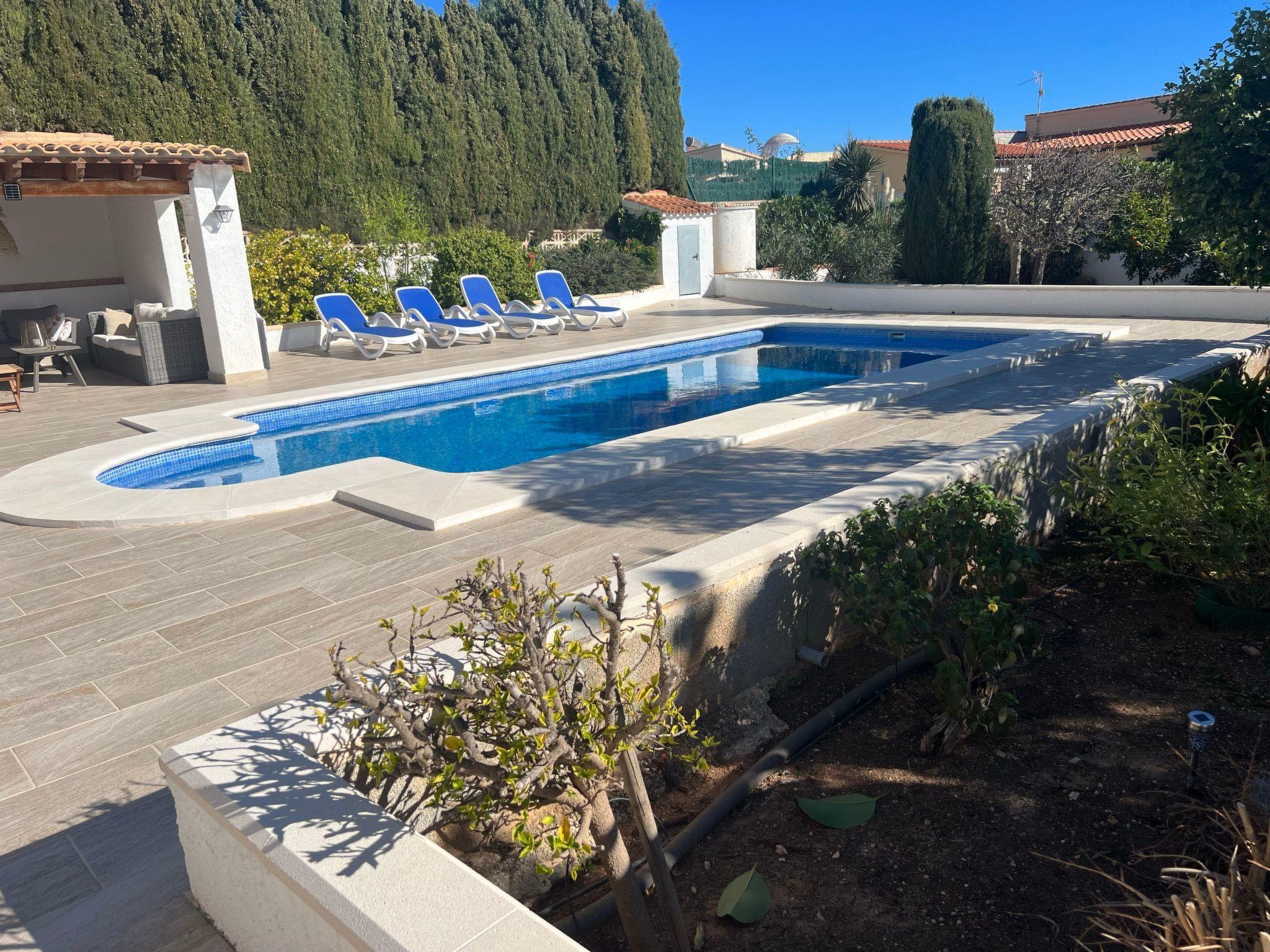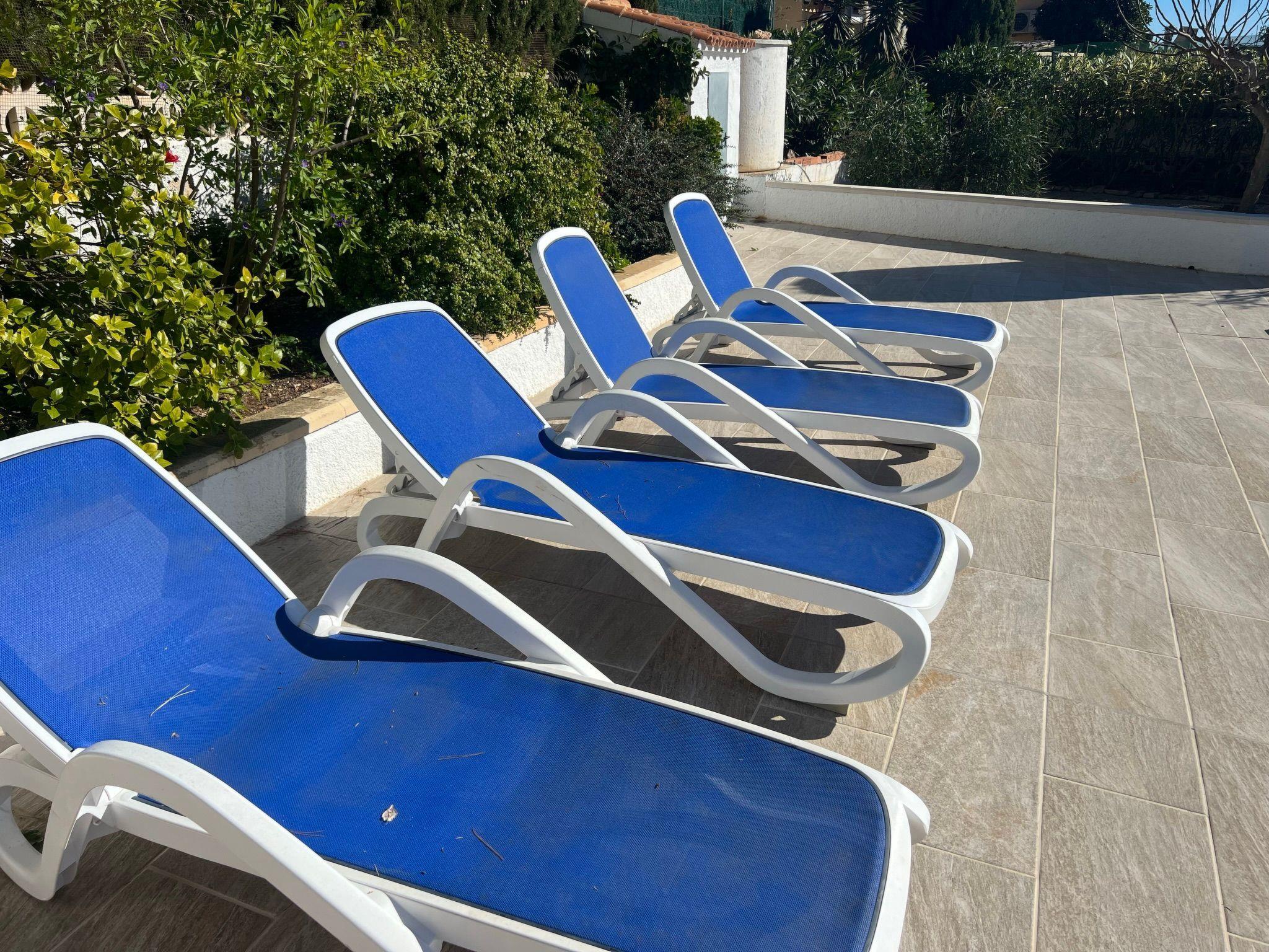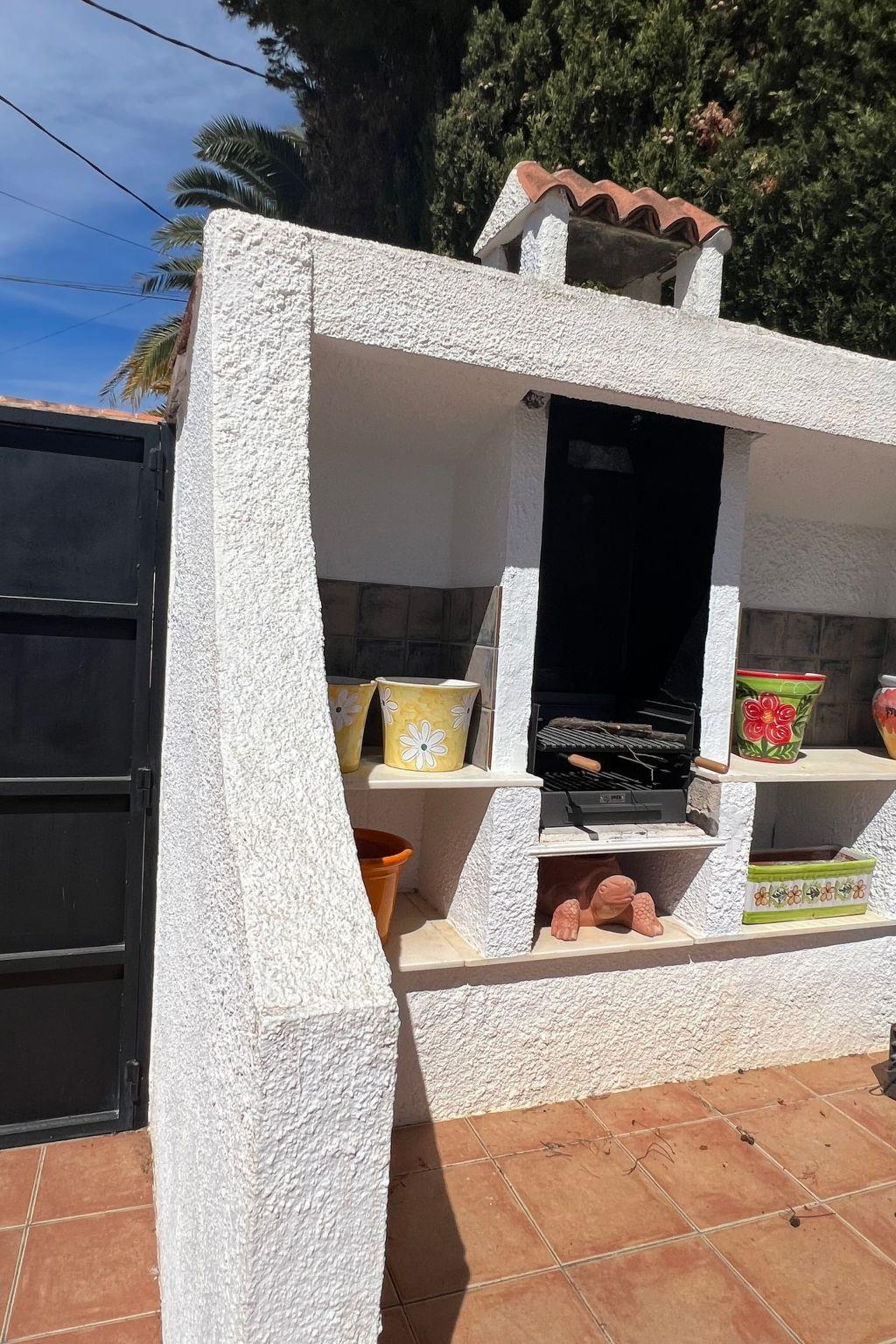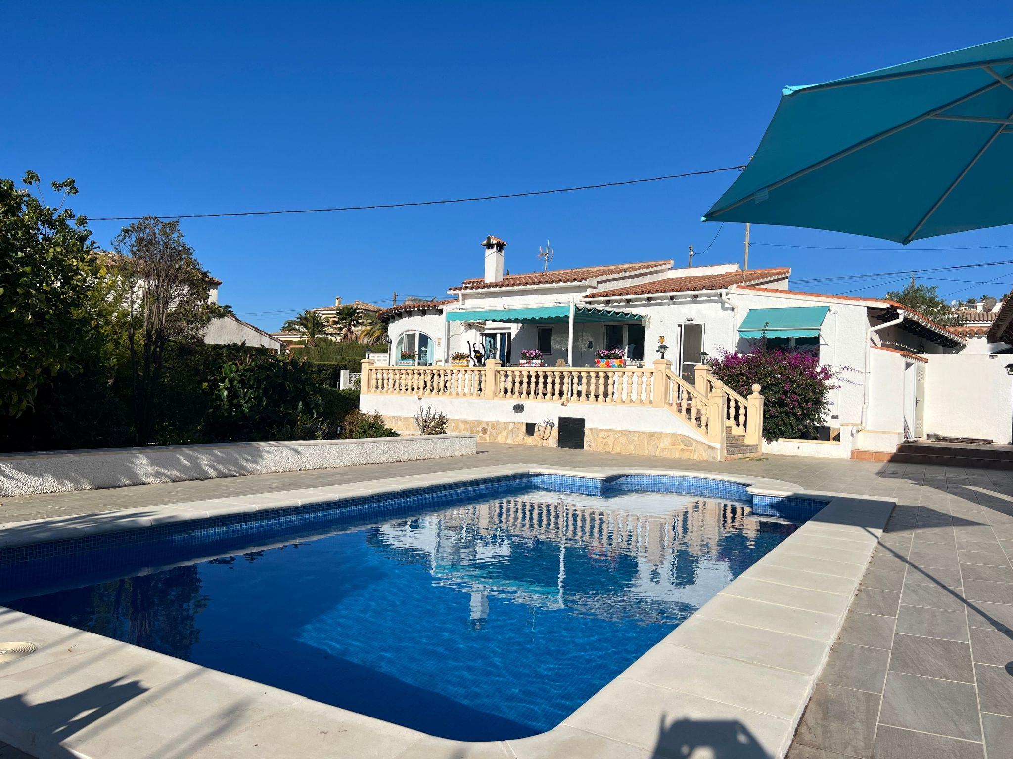 Relax and enjoy a wonderful and exceptional villa with a large private pool area. Our detached house is located in the quiet, tranquil Ortembach urbanisation, which is very centrally located. It is a leisurely 10 minute walk to the nearest shops, bars and restaurants. There is a small supermarket in the immediate vicinity. The beautiful old town of the town is about 2 kilometres away, the nearest large sandy beach can be reached on foot in about 15 minutes.our house is extremely spacious, colourful and originally furnished. It offers space for a maximum of 8 people to spend an unforgettable holiday and enjoy 300 days of sunshine a year.the villa is on one level and has a living space of approx. 140 sqm: four bedrooms, three bathrooms, exceptionally large kitchen with dishwasher, washing machine, freezer, microwave, large living room with fireplace, satellite TV, WIFI, dining room, large terrace with sun protection.Our villa is completely fenced, the large property is equipped with a gate, parking spaces for 2 cars are available, as well as sun loungers and parasols, enjoy the peace and quiet on our sun terrace or at the spacious pool area, harvest fresh fruit in our beautiful approx. 400 square metre Mediterranean garden. You can refresh yourself to your heart's content in the large 4x8 metre pool, which you can reach via a staircase leading directly into the water. Even when fully occupied, our outdoor area offers you the opportunity to retreat to one of the sun loungers and find your own sunbathing spot at any time, and you can prepare a wonderful paella in our very well-equipped kitchen or grill something delicious on the barbecue. In the evening, the garden and pool become a beautifully lit feast for the eyes and you can end the day romantically with a good vino.In addition to the all-day sun terrace, there is a covered seating and dining area so that you can spend the day outside around the clock.We have equipped our villa as our second home and is ideal for families with children. In addition to a travel cot, we are happy to provide you with a high chair and children's toys so that your little ones can also feel at home.Calpe offers numerous attractions and entertainment options, water sports, climbing, hiking, nice shops, nice beach bars, supermarkets including Lidl and Aldi, original fish restaurants at the harbour, horse-drawn carriage rides, discos, there is something for everyone.But the surrounding area also has a lot to offer: golfers and cyclists will get their money's worth here, hikers will find exceptional hiking trails in the nearby mountains, in January/February you can enjoy the almond blossom in the Jalon valley, Aqualandia (water park with numerous slides), Mundomar (marine and exotic animal park), Terra Mitica (amusement park) are great fun for young and old. Take a trip to the Jalon Valley (wine-growing region), where there is a very original market on Saturdays, visit the Algar waterfalls, which are a real treat, especially in the height of summer, or the Canelobre caves. Guadelest, an old mountain village, is also worth a visit.