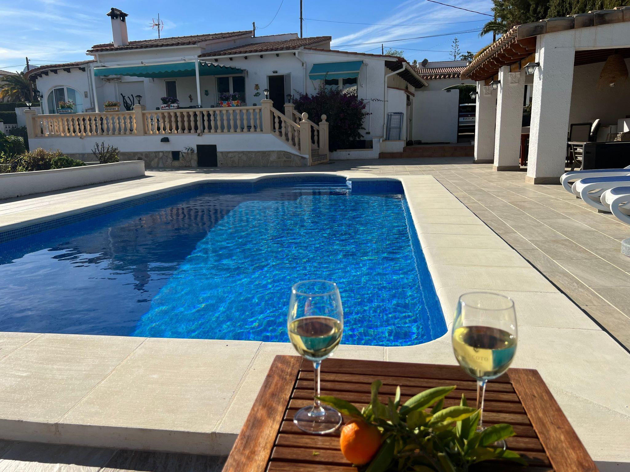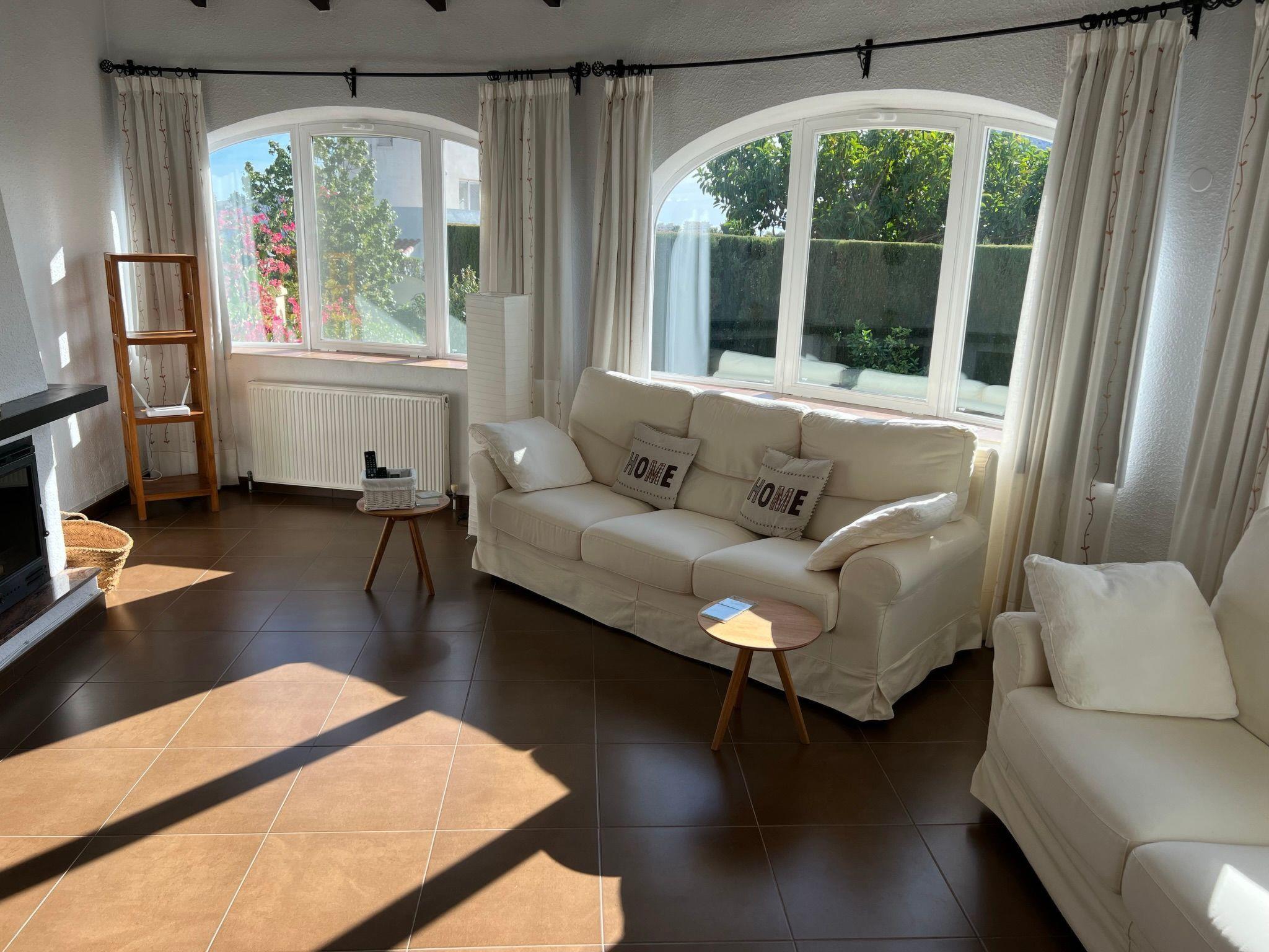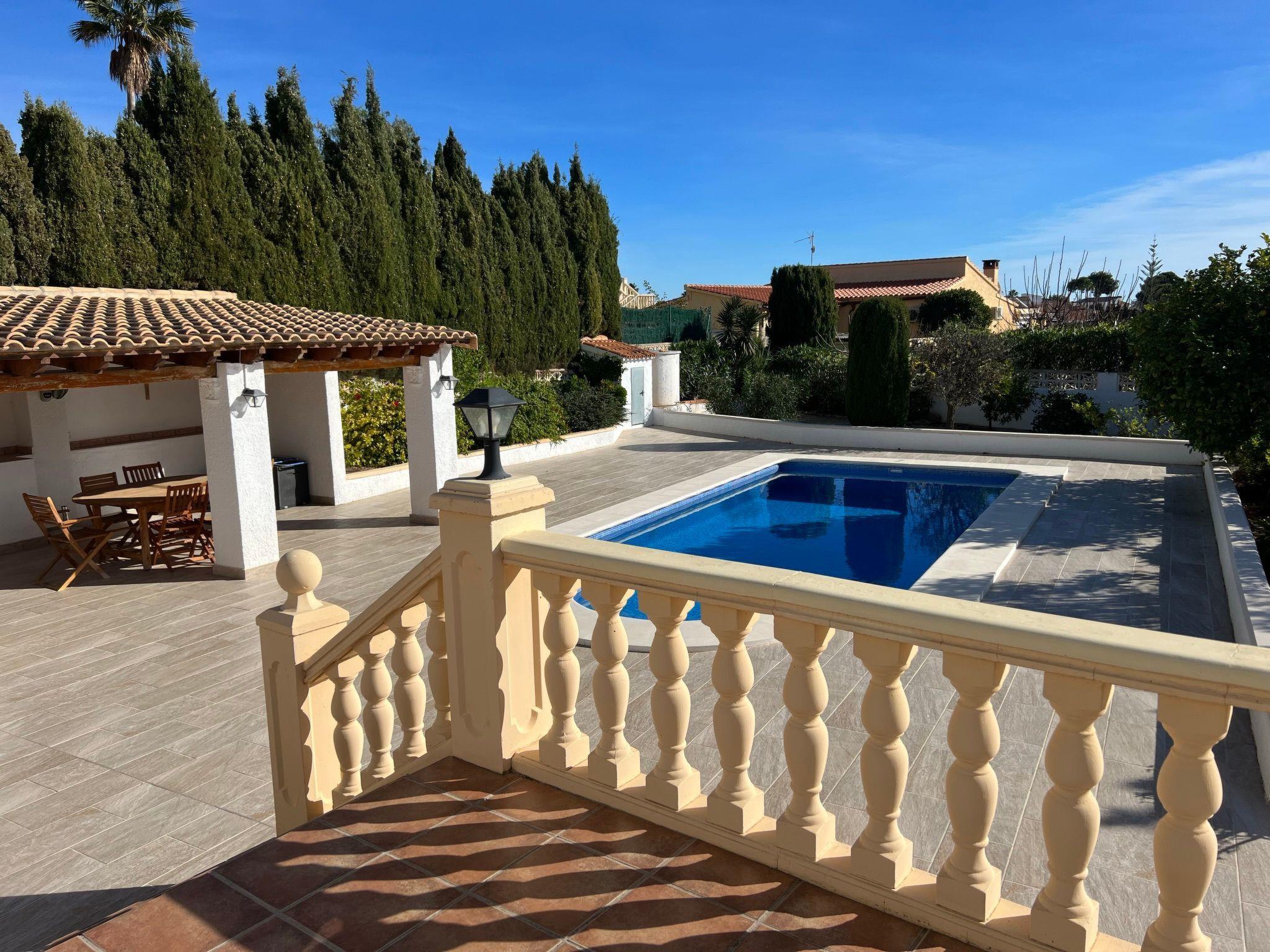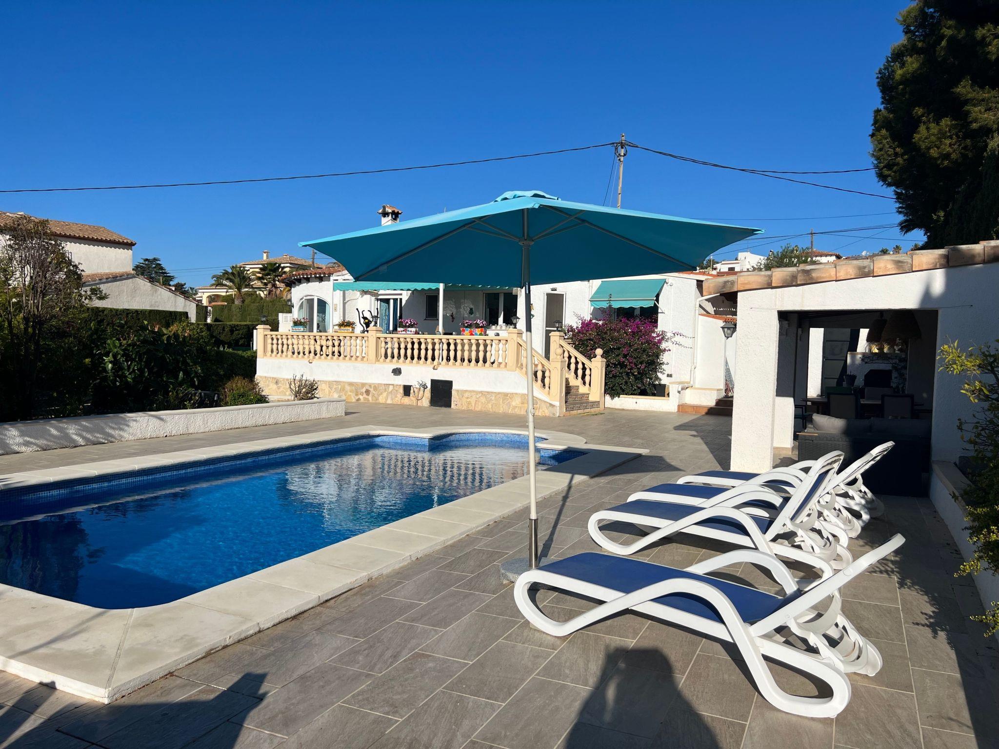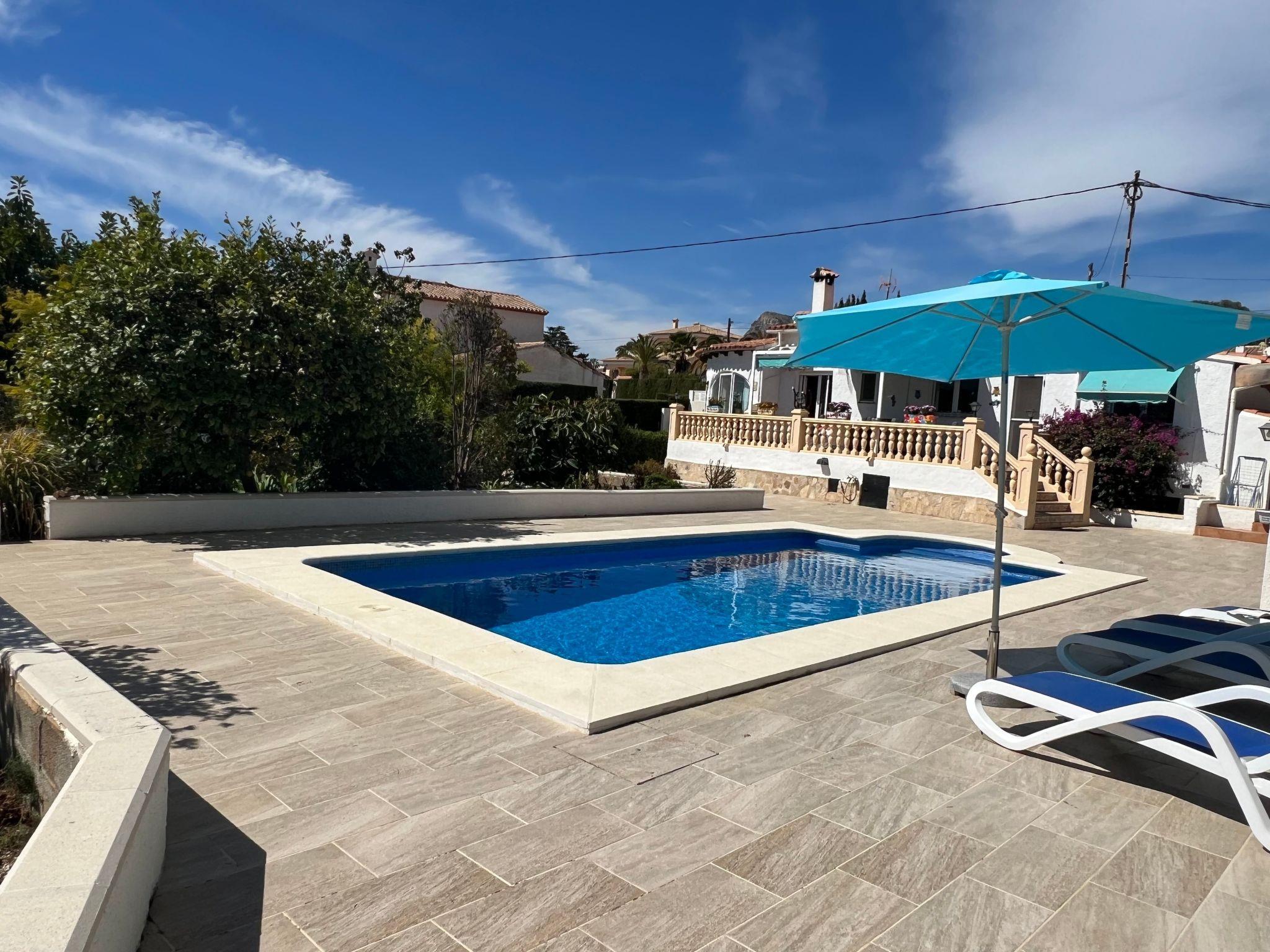 Relax and enjoy a wonderful and exceptional villa with a large private pool area. Our detached house is located in the quiet, tranquil Ortembach urbanisation, which is very centrally located. It is a leisurely 10 minute walk to the nearest shops, bars and restaurants. There is a small supermarket in the immediate vicinity. The beautiful old town of the town is about 2 kilometres away, the nearest large sandy beach can be reached on foot in about 15 minutes.our house is extremely spacious, colourful and originally furnished. It offers space for a maximum of 8 people to spend an unforgettable holiday and enjoy 300 days of sunshine a year.the villa is on one level and has a living space of approx. 140 sqm: four bedrooms, three bathrooms, exceptionally large kitchen with dishwasher, washing machine, freezer, microwave, large living room with fireplace, satellite TV, WIFI, dining room, large terrace with sun protection.Our villa is completely fenced, the large property is equipped with a gate, parking spaces for 2 cars are available, as well as sun loungers and parasols, enjoy the peace and quiet on our sun terrace or at the spacious pool area, harvest fresh fruit in our beautiful approx. 400 square metre Mediterranean garden. You can refresh yourself to your heart's content in the large 4x8 metre pool, which you can reach via a staircase leading directly into the water. Even when fully occupied, our outdoor area offers you the opportunity to retreat to one of the sun loungers and find your own sunbathing spot at any time, and you can prepare a wonderful paella in our very well-equipped kitchen or grill something delicious on the barbecue. In the evening, the garden and pool become a beautifully lit feast for the eyes and you can end the day romantically with a good vino.In addition to the all-day sun terrace, there is a covered seating and dining area so that you can spend the day outside around the clock.We have equipped our villa as our second home and is ideal for families with children. In addition to a travel cot, we are happy to provide you with a high chair and children's toys so that your little ones can also feel at home.Calpe offers numerous attractions and entertainment options, water sports, climbing, hiking, nice shops, nice beach bars, supermarkets including Lidl and Aldi, original fish restaurants at the harbour, horse-drawn carriage rides, discos, there is something for everyone.But the surrounding area also has a lot to offer: golfers and cyclists will get their money's worth here, hikers will find exceptional hiking trails in the nearby mountains, in January/February you can enjoy the almond blossom in the Jalon valley, Aqualandia (water park with numerous slides), Mundomar (marine and exotic animal park), Terra Mitica (amusement park) are great fun for young and old. Take a trip to the Jalon Valley (wine-growing region), where there is a very original market on Saturdays, visit the Algar waterfalls, which are a real treat, especially in the height of summer, or the Canelobre caves. Guadelest, an old mountain village, is also worth a visit.
