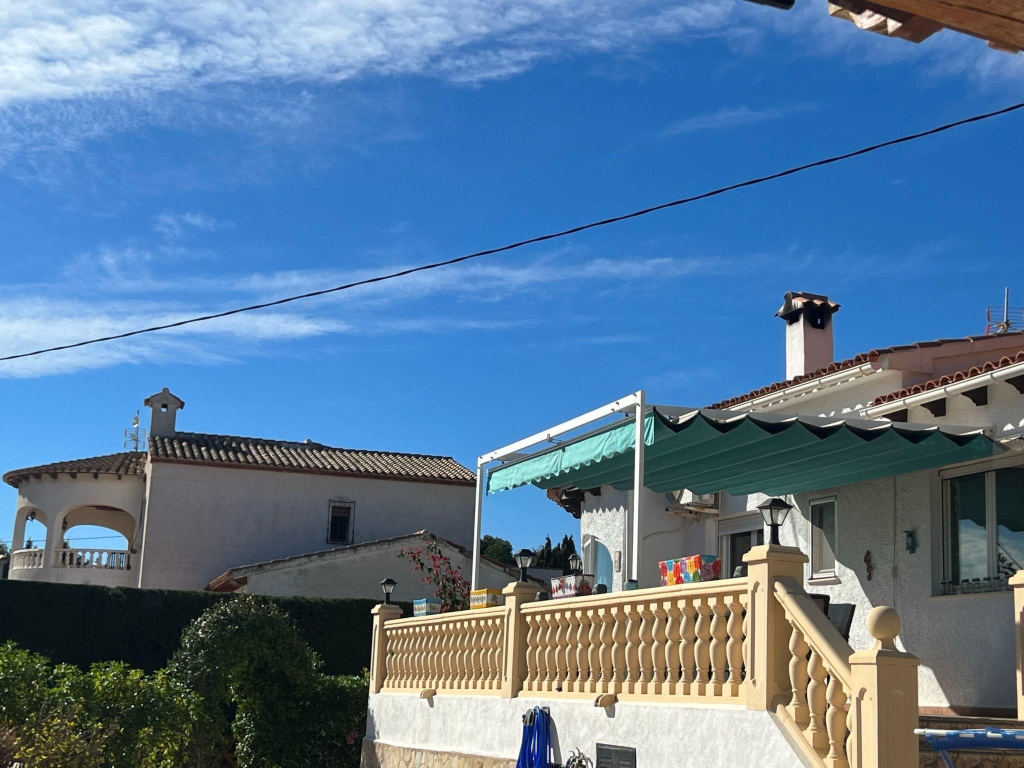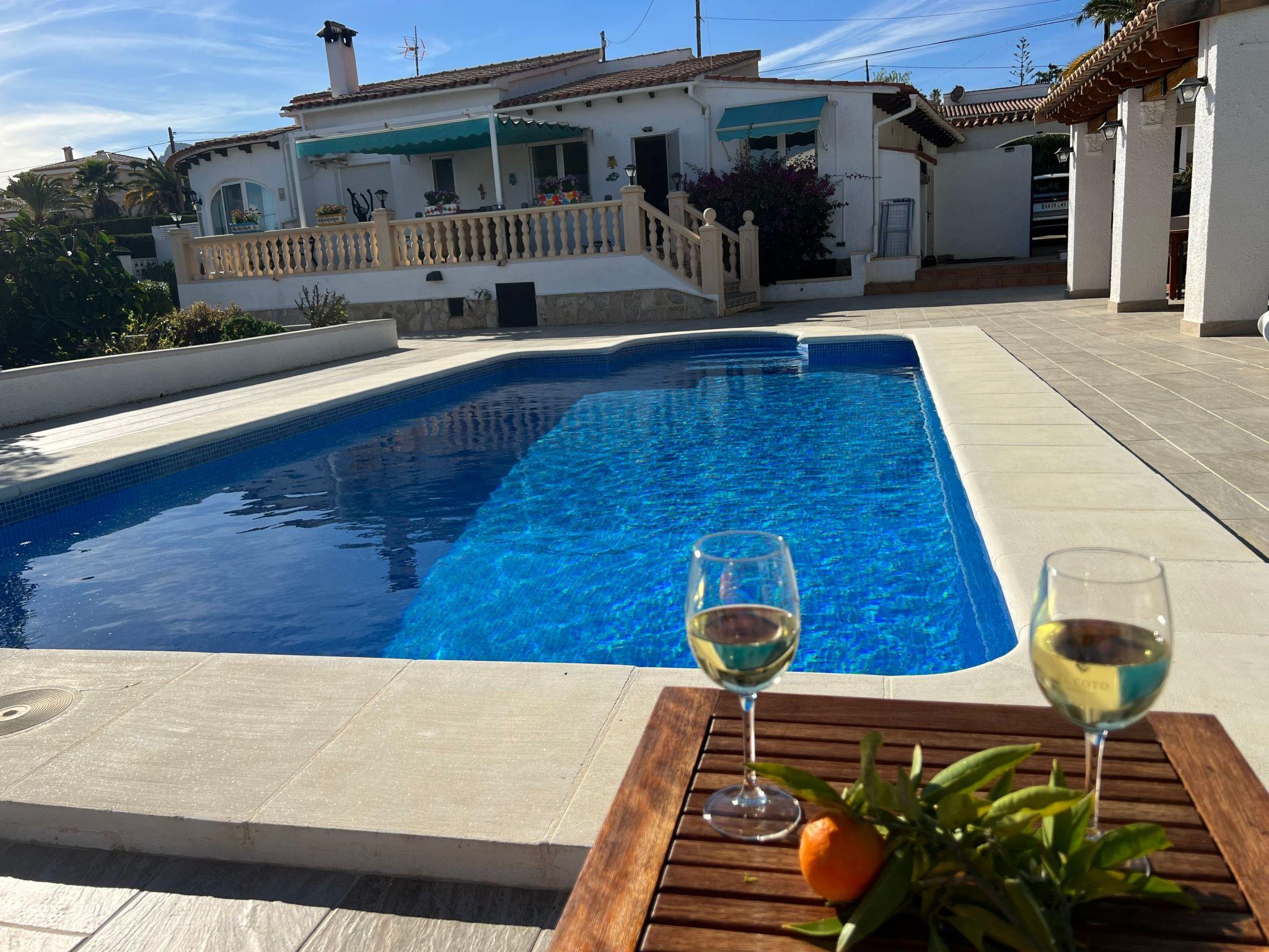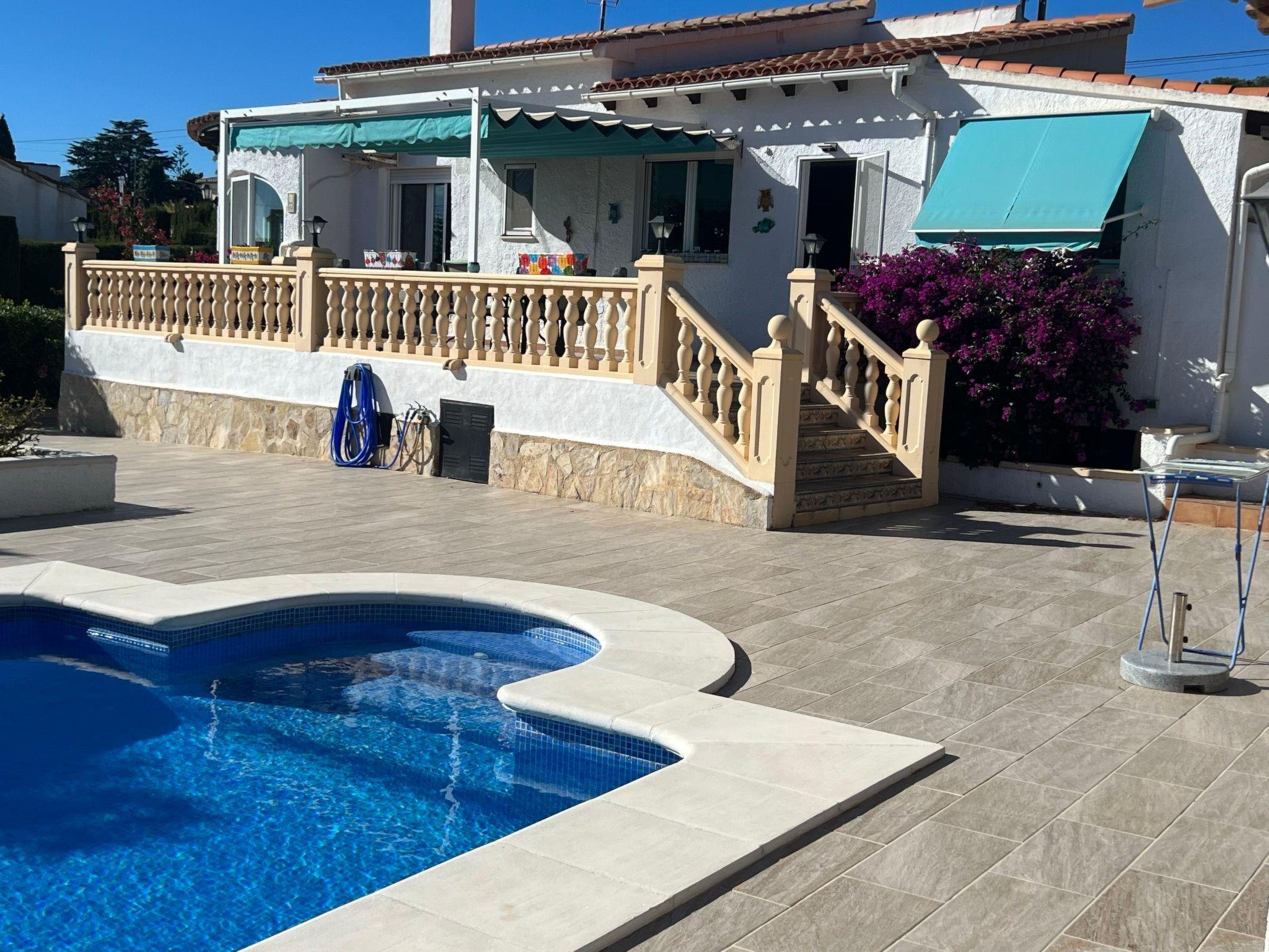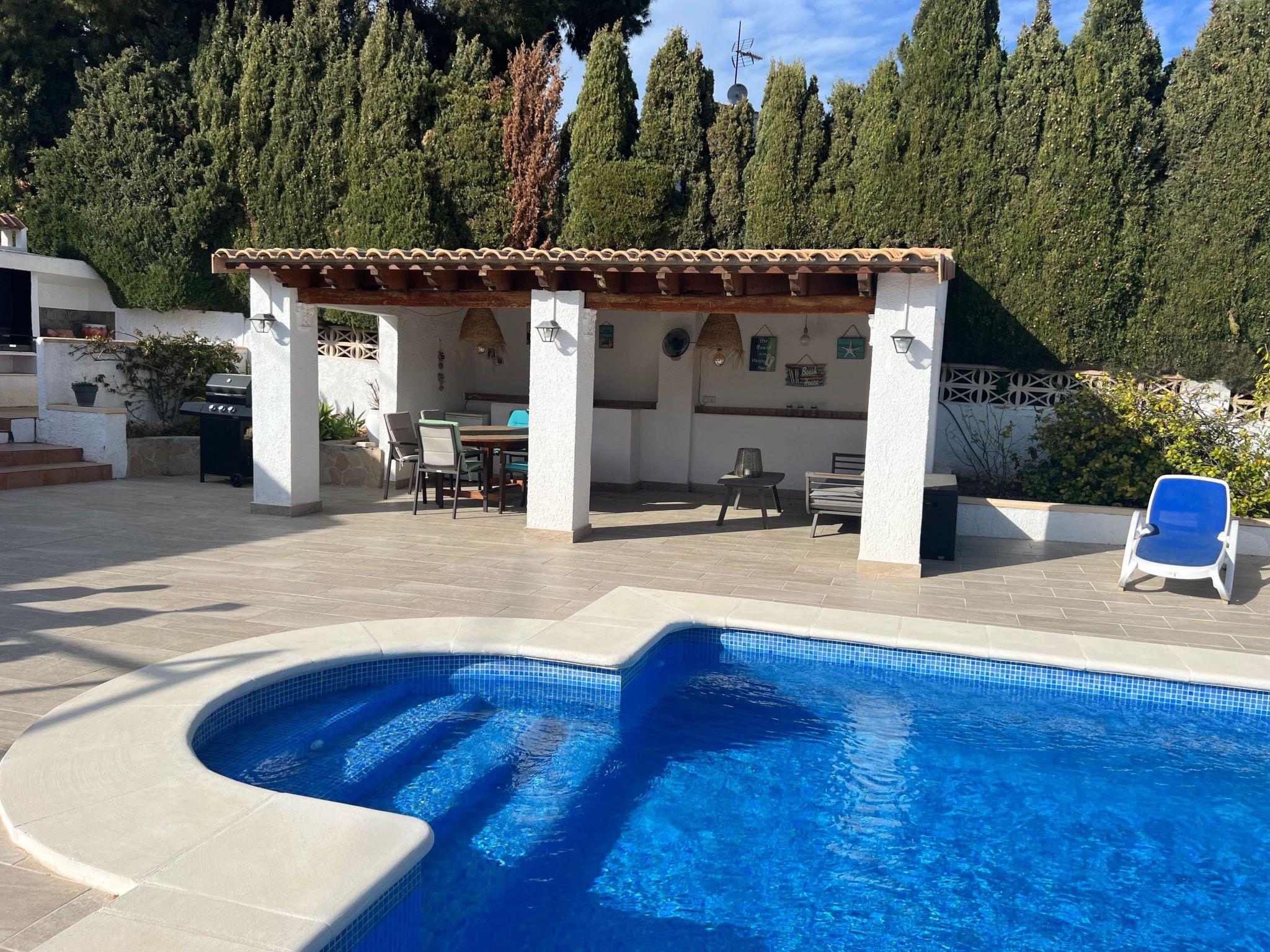 Relax and enjoy a wonderful and exceptional villa with a large private pool area. Our detached house is located in the quiet, tranquil Ortembach urbanisation, which is very centrally located. It is a leisurely 10 minute walk to the nearest shops, bars and restaurants. There is a small supermarket in the immediate vicinity. The beautiful old town of the town is about 2 kilometres away, the nearest large sandy beach can be reached on foot in about 15 minutes.our house is extremely spacious, colourful and originally furnished. It offers space for a maximum of 8 people to spend an unforgettable holiday and enjoy 300 days of sunshine a year.the villa is on one level and has a living space of approx. 140 sqm: four bedrooms, three bathrooms, exceptionally large kitchen with dishwasher, washing machine, freezer, microwave, large living room with fireplace, satellite TV, WIFI, dining room, large terrace with sun protection.Our villa is completely fenced, the large property is equipped with a gate, parking spaces for 2 cars are available, as well as sun loungers and parasols, enjoy the peace and quiet on our sun terrace or at the spacious pool area, harvest fresh fruit in our beautiful approx. 400 square metre Mediterranean garden. You can refresh yourself to your heart's content in the large 4x8 metre pool, which you can reach via a staircase leading directly into the water. Even when fully occupied, our outdoor area offers you the opportunity to retreat to one of the sun loungers and find your own sunbathing spot at any time, and you can prepare a wonderful paella in our very well-equipped kitchen or grill something delicious on the barbecue. In the evening, the garden and pool become a beautifully lit feast for the eyes and you can end the day romantically with a good vino.In addition to the all-day sun terrace, there is a covered seating and dining area so that you can spend the day outside around the clock.We have equipped our villa as our second home and is ideal for families with children. In addition to a travel cot, we are happy to provide you with a high chair and children's toys so that your little ones can also feel at home.Calpe offers numerous attractions and entertainment options, water sports, climbing, hiking, nice shops, nice beach bars, supermarkets including Lidl and Aldi, original fish restaurants at the harbour, horse-drawn carriage rides, discos, there is something for everyone.But the surrounding area also has a lot to offer: golfers and cyclists will get their money's worth here, hikers will find exceptional hiking trails in the nearby mountains, in January/February you can enjoy the almond blossom in the Jalon valley, Aqualandia (water park with numerous slides), Mundomar (marine and exotic animal park), Terra Mitica (amusement park) are great fun for young and old. Take a trip to the Jalon Valley (wine-growing region), where there is a very original market on Saturdays, visit the Algar waterfalls, which are a real treat, especially in the height of summer, or the Canelobre caves. Guadelest, an old mountain village, is also worth a visit.