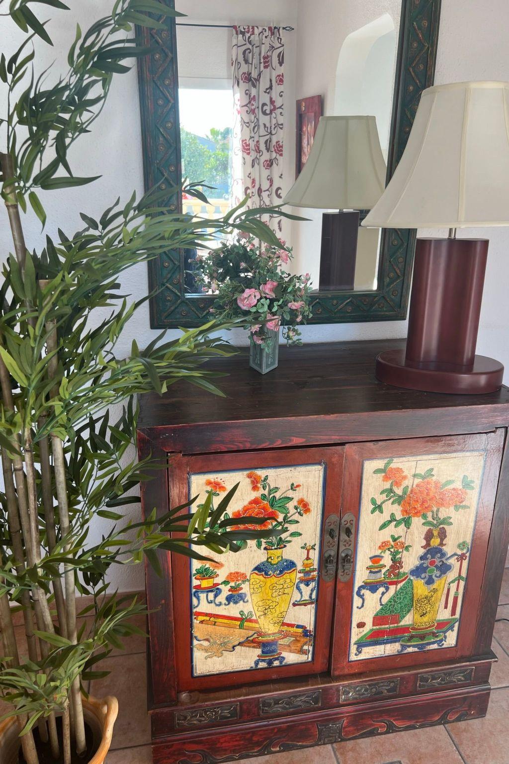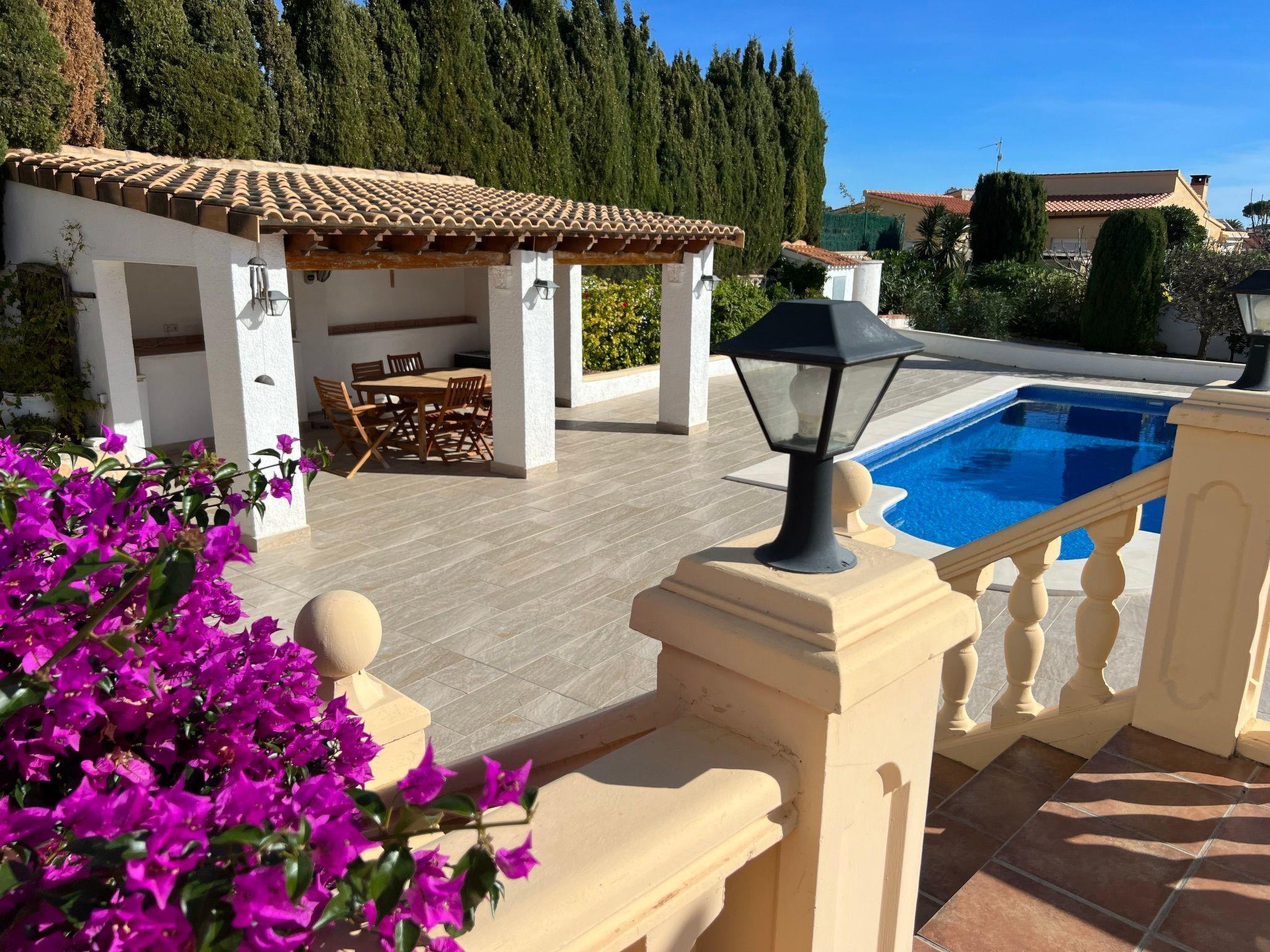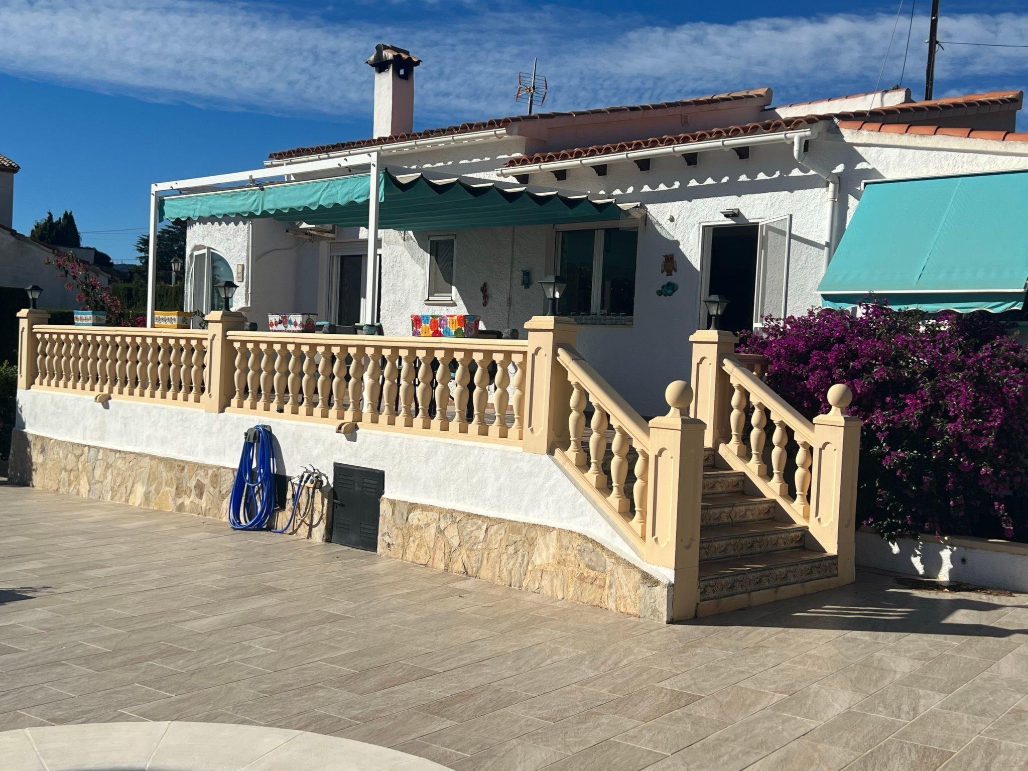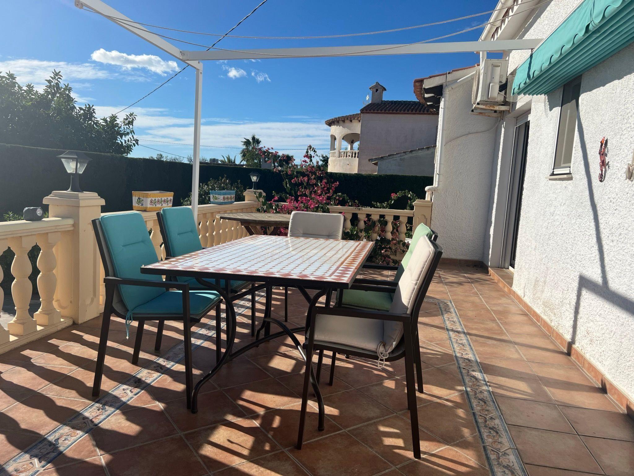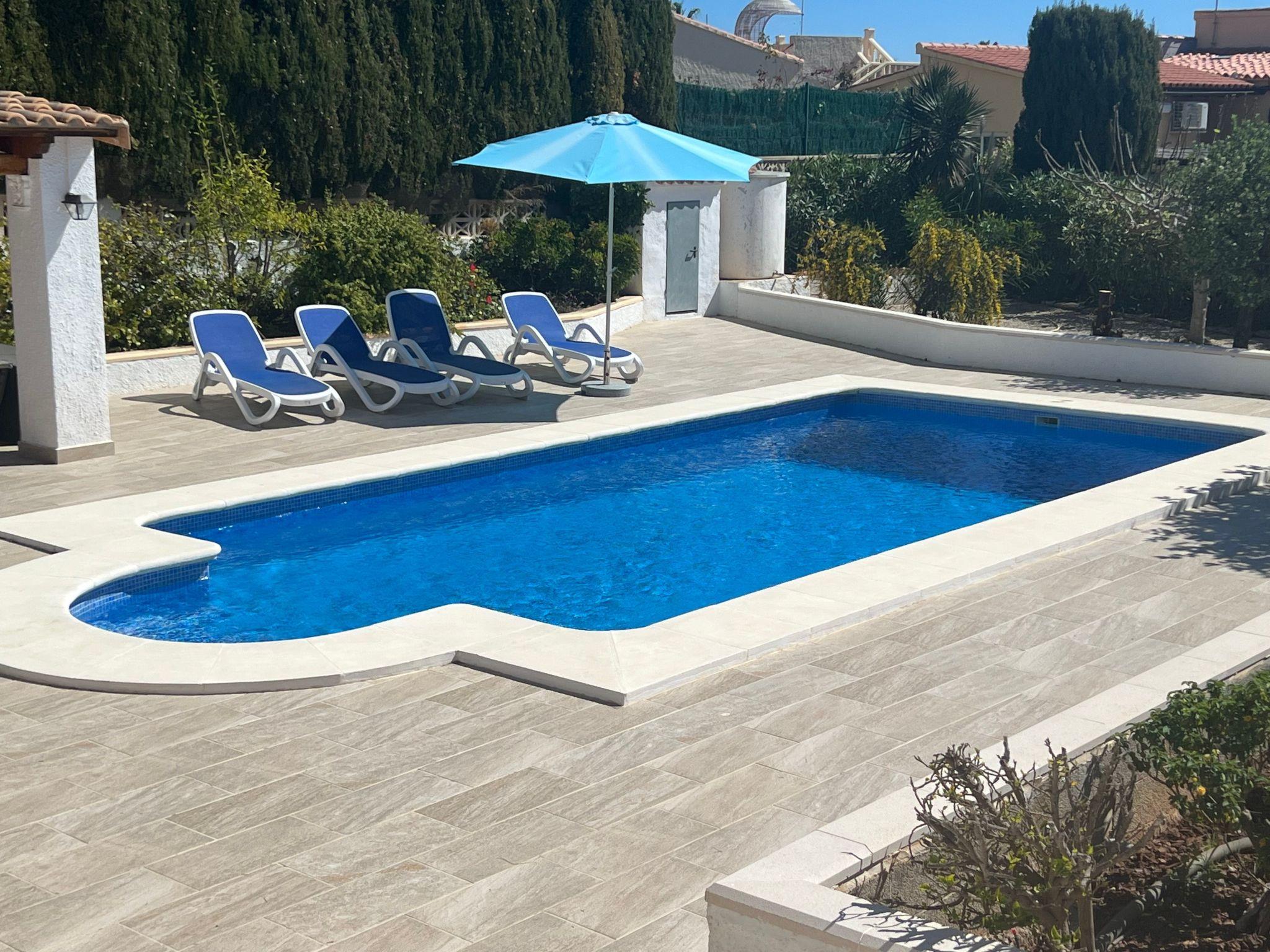 Relax and enjoy a wonderful and exceptional villa with a large private pool area. Our detached house is located in the quiet, tranquil Ortembach urbanisation, which is very centrally located. It is a leisurely 10 minute walk to the nearest shops, bars and restaurants. There is a small supermarket in the immediate vicinity. The beautiful old town of the town is about 2 kilometres away, the nearest large sandy beach can be reached on foot in about 15 minutes.our house is extremely spacious, colourful and originally furnished. It offers space for a maximum of 8 people to spend an unforgettable holiday and enjoy 300 days of sunshine a year.the villa is on one level and has a living space of approx. 140 sqm: four bedrooms, three bathrooms, exceptionally large kitchen with dishwasher, washing machine, freezer, microwave, large living room with fireplace, satellite TV, WIFI, dining room, large terrace with sun protection.Our villa is completely fenced, the large property is equipped with a gate, parking spaces for 2 cars are available, as well as sun loungers and parasols, enjoy the peace and quiet on our sun terrace or at the spacious pool area, harvest fresh fruit in our beautiful approx. 400 square metre Mediterranean garden. You can refresh yourself to your heart's content in the large 4x8 metre pool, which you can reach via a staircase leading directly into the water. Even when fully occupied, our outdoor area offers you the opportunity to retreat to one of the sun loungers and find your own sunbathing spot at any time, and you can prepare a wonderful paella in our very well-equipped kitchen or grill something delicious on the barbecue. In the evening, the garden and pool become a beautifully lit feast for the eyes and you can end the day romantically with a good vino.In addition to the all-day sun terrace, there is a covered seating and dining area so that you can spend the day outside around the clock.We have equipped our villa as our second home and is ideal for families with children. In addition to a travel cot, we are happy to provide you with a high chair and children's toys so that your little ones can also feel at home.Calpe offers numerous attractions and entertainment options, water sports, climbing, hiking, nice shops, nice beach bars, supermarkets including Lidl and Aldi, original fish restaurants at the harbour, horse-drawn carriage rides, discos, there is something for everyone.But the surrounding area also has a lot to offer: golfers and cyclists will get their money's worth here, hikers will find exceptional hiking trails in the nearby mountains, in January/February you can enjoy the almond blossom in the Jalon valley, Aqualandia (water park with numerous slides), Mundomar (marine and exotic animal park), Terra Mitica (amusement park) are great fun for young and old. Take a trip to the Jalon Valley (wine-growing region), where there is a very original market on Saturdays, visit the Algar waterfalls, which are a real treat, especially in the height of summer, or the Canelobre caves. Guadelest, an old mountain village, is also worth a visit.