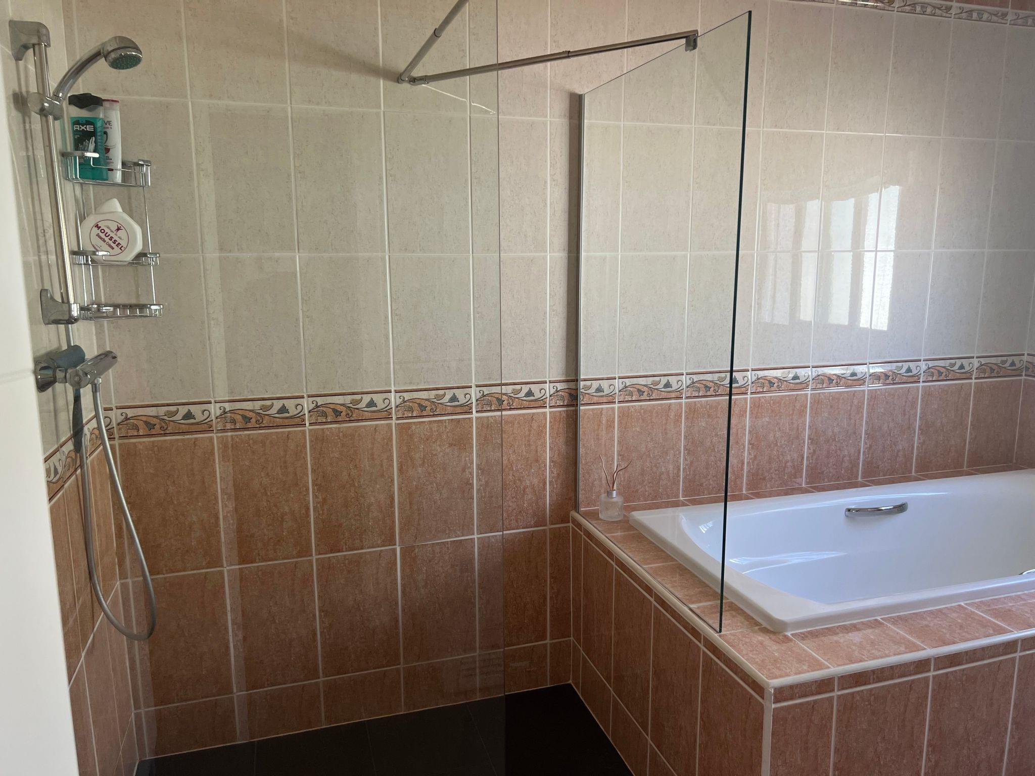 The bungalow is approximately 140 square metres in size and is divided as follows: Sunny, light-flooded living room with fireplace, heating and air conditioning, TV. 2 bedrooms each with a double bed (160cm x 200cm), 2 bedrooms each with a double bed 180 x 200 cm). 3 of the 4 bedrooms are equipped with air conditioning. 3 daylight bathrooms, 2 with shower cubicle and 1 with shower cubicle and bathtub. Chic, modern, spacious kitchen with fridge-freezer, dishwasher, oven, microwave and gas hob. Dining room, washing machine and tumble dryer.