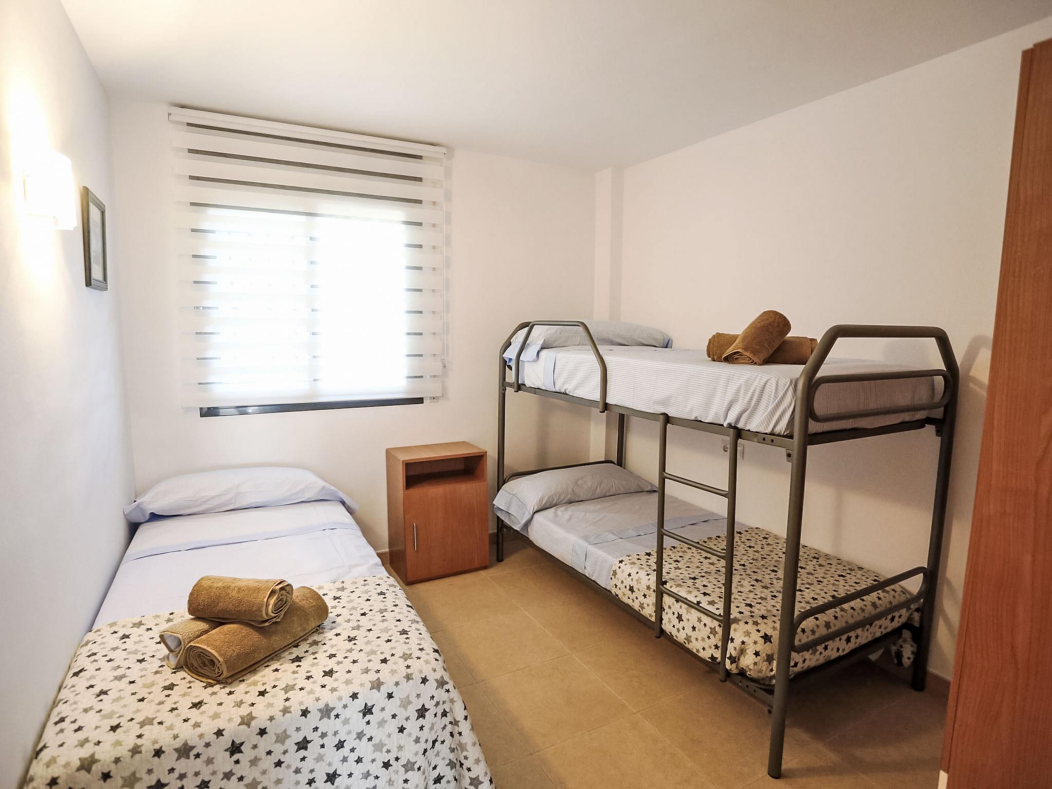 "Mar Cambrils", 3-room apartment 56 m2 on 3rd floor. Comfortable and cosy furnishings: living/dining room with digital TV. Exit to the balcony, to the terrace. 1 room with 1 french bed and bath/bidet/WC. 1 room with 3 beds. Kitchen (oven, dishwasher, 4 ceramic glass hob hotplates, microwave, electric coffee machine, Capsules for coffee machine (Nespresso)). Shower/WC. Air-conditioning. No heating option. Small balcony, large terrace. Terrace furniture, barbecue, deck chairs (2). Of the sea. Facilities: washing machine. Internet (WiFi, free). Parking space n 26. Please note: suitable for families. Non-smokers only. HUTT-012622 // Reg. Nr.: ESFCTU00004303100038963000000000000000000HUTT-0126223