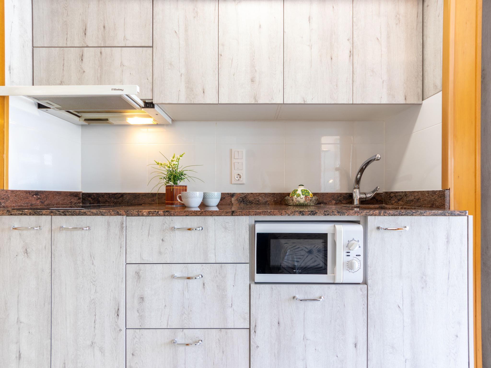 "International", 1-room studio 34 m2 on 3rd floor. Practical and beautiful furnishings: living/sleeping room with 2 beds (90 cm, length 190 cm), 1 sofabed (135 cm, length 190 cm), digital TV. Exit to the terrace. Open kitchen (2 ceramic glass hob hotplates, toaster, microwave, electric coffee machine). Shower/WC. No heating option. Terrace. Terrace furniture. View of the sea. Facilities: washing machine, iron, hair dryer. HUTT-049467 // Reg. Nr.: ESFCTU00004303100014638700000000000000000HUTT-0494674