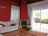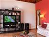 Das Wohnzimmer ist in einem warmen Rot-Ton gehalten und hat ebenfalls ein palmerisches, von innen sichtbares Holzgiebeldach. Eine Sitzecke mit bequemen Sofas lädt zu gemütlichen Lese- oder TV-Abenden ein oder Sie schauen einfach den Flammen im offenen Kamin zu, der an kühlen Abenden wohlige Wärme spendet.