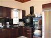 Betritt man die Villa durch den Haupteingang, gelangt man in die separate, moderne Küche mit Essbereich für 6 Personen. Die Fronten der Küche sind in einem dunklen, edlen Nussbaumton gehalten, die Arbeitsflächen sind aus schwarzen Marmor.