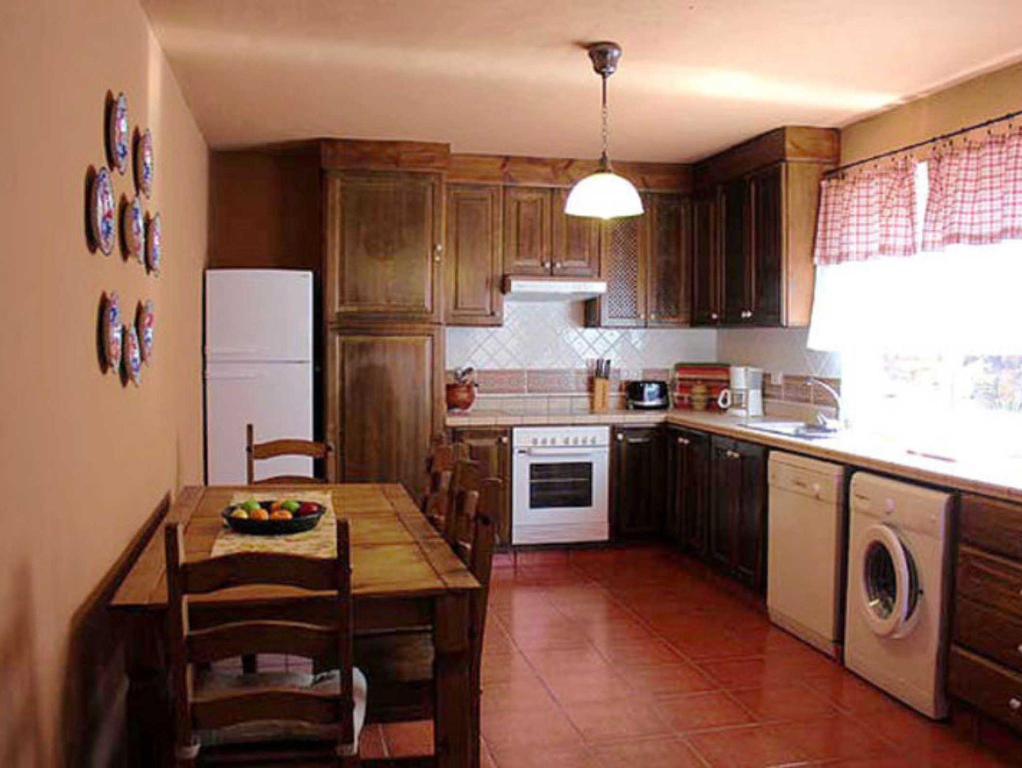 Die halboffene Küche ist sehr gut ausgestattet und verfügt neben einem Cerankochfeld über einen Backofen, eine große Kühl/Gefrierkombi und eine Geschirrspülmaschine. Ein großer Esstisch aus Holz bietet ausreichend Platz für 4-6 Personen.