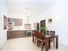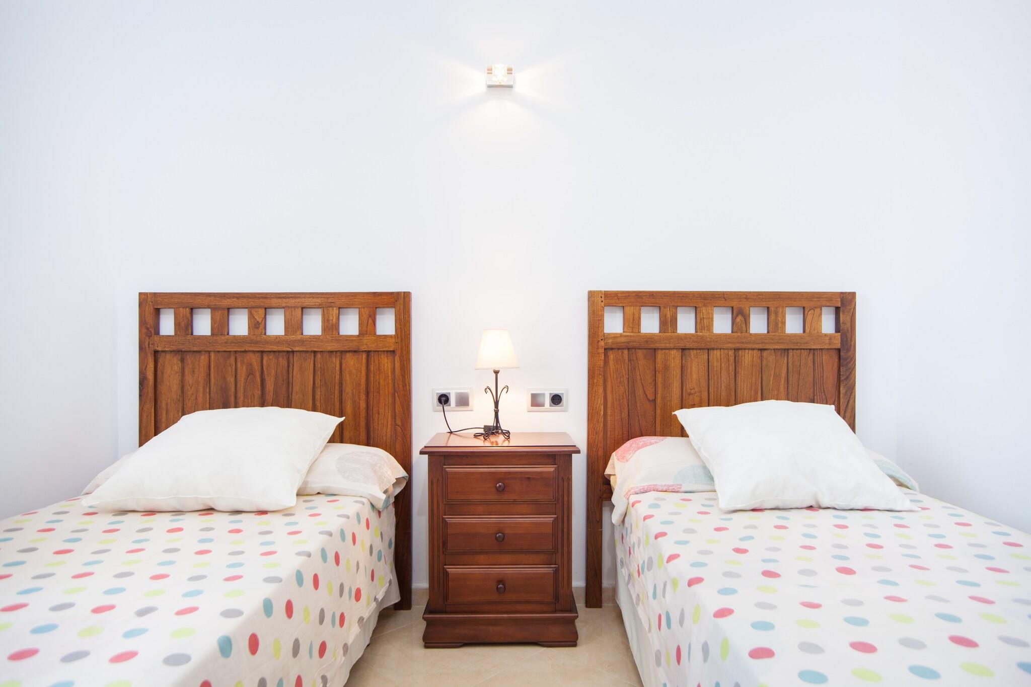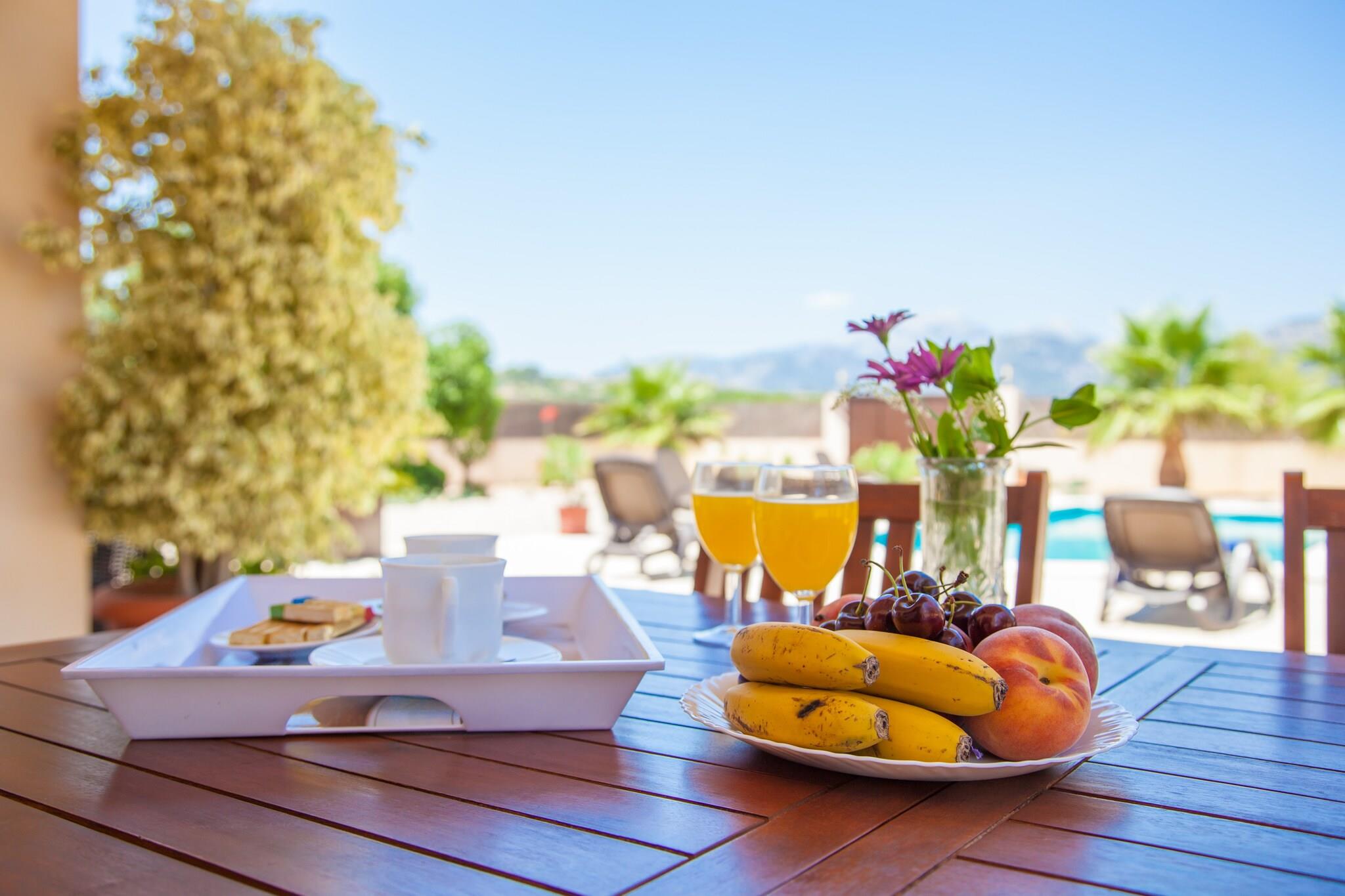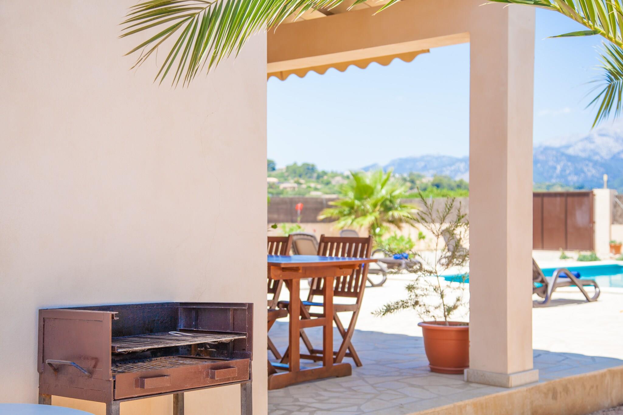 Forfriskende udendørs flugt Træd ind i det indbydende ydre af denne moderne villa, hvor en privat klorpool venter for at forfriske dig under den mallorcanske sol. Seks liggestole er det perfekte sted at slappe af, mens den rummelige veranda og grillområdet sørger for afslappet morgenmad eller aftensmad. Den omkringliggende grushave og forskellige beplantninger tilføjer et moderne touch, og den fuldt indhegnede grund sikrer privatlivets fred uden direkte naboer i nærheden. Komfortabelt indendørs ophold Indvendigt er villaen elegant designet til afslapning og bekvemmelighed. Stuen, der er udstyret med en sofa, satellit-tv og direkte adgang til verandaen, flyder problemfrit ind i spisekøkkenet med en vitro-komfur, elektrisk ovn og opvaskemaskine. Et vaskerum omfatter vaskemaskine, strygejern og strygebræt. De tre soveværelser - et dobbeltværelse og to med hver to enkeltsenge - suppleres af aircondition overalt. Badeværelserne har et hydromassagebadekar og en bruser. Praktisk beliggenhed og spisning Den charmerende landsby Sa Pobla ligger kun 2,5 km væk, og den byder på supermarkeder, butikker og restauranter. Søndag er der et travlt marked med frisk frugt og grøntsager. Villaen ligger en kort køretur til Alcúdia-bugten, hvor fine sandstrande som Playa de Muro og Port d’Alcúdia venter. Friluftsentusiaster kan nyde vandre- eller cykelture i Campanet, Pollença og den nærliggende Sanctuari of Lluc. Lokale spisemuligheder, herunder Celler Can Cotà, fremviser traditionelle mallorcanske retter, hvilket sikrer en komplet ø-oplevelse.