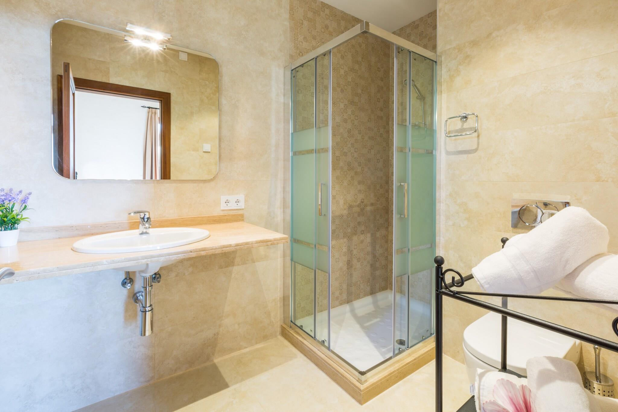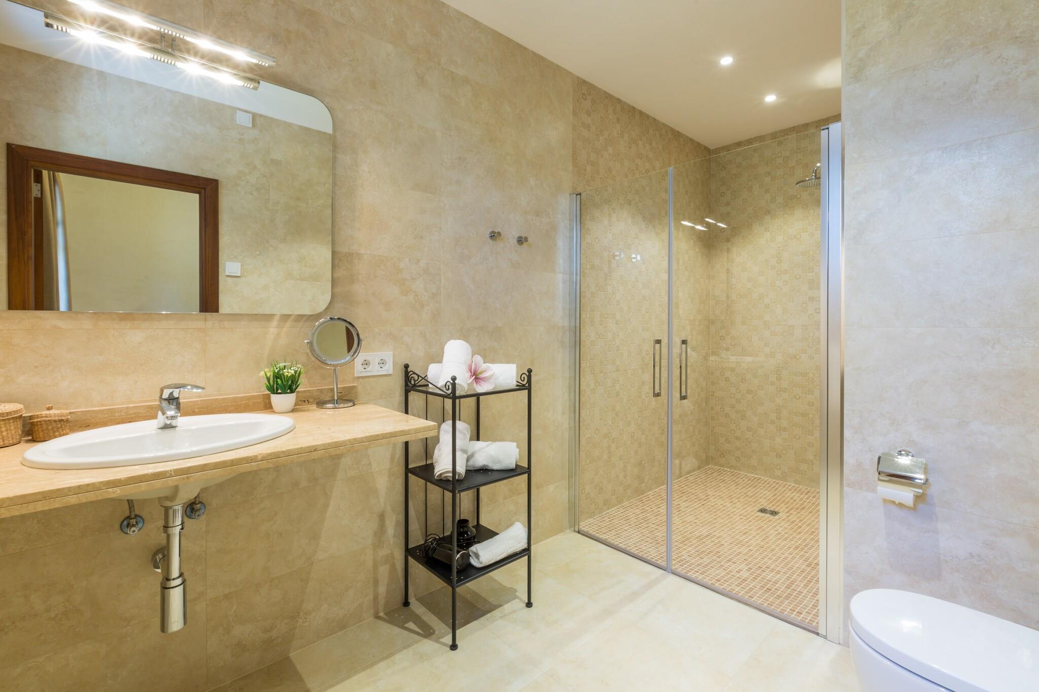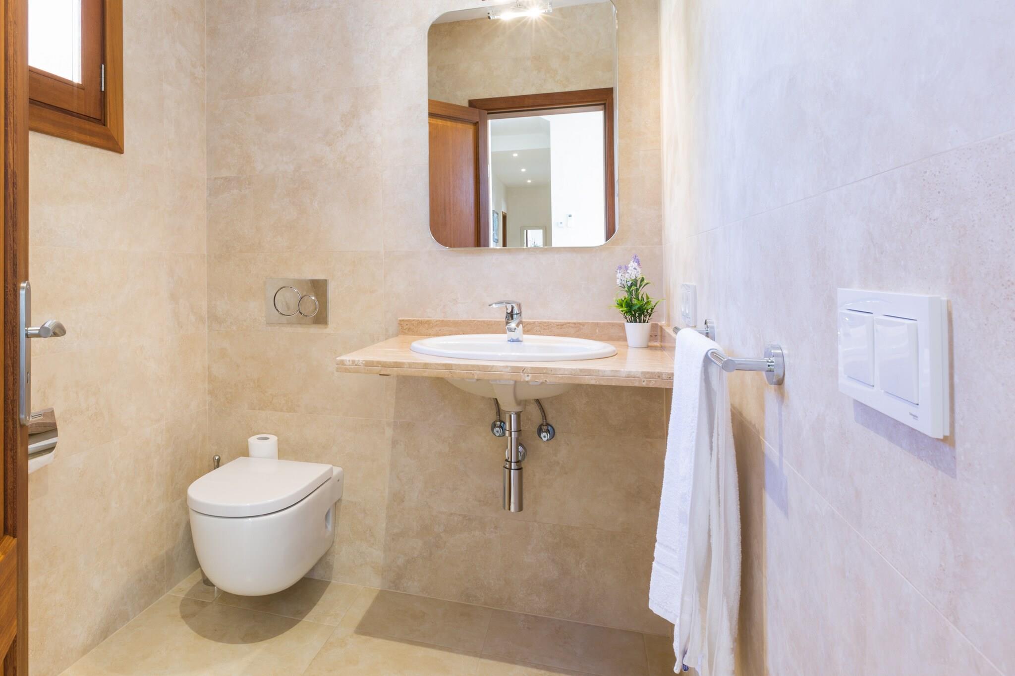 De buitenkant is erg mooi, het heeft grote terrassen en bomen, een gemeubileerd terras op de 1e verdieping, een chloorzwembad van 10 x 5 m met een diepte variërend van 0,4 tot 1,85 m, tien ligstoelen, een volledig uitgeruste veranda en een barbecue voor kookliefhebbers. Het huis heeft een oppervlakte van 420 m2, verdeeld over 2 verdiepingen, en beschikt over vijf slaapkamers gelegen op de 1e verdieping, allen met twee eenpersoonsbedden, een en-suite badkamer met douche en airconditioning. Er is beschikbaarheid voor twee wiegjes en twee kinderstoelen. Naast de en-suite badkamers beschikt de woning over twee toiletten, één op de begane grond en één op de 1e verdieping. De woonkamer is erg gezellig en heeft een grote bank, twee fauteuils, een kleine tafel, TV-Sat en airconditioning. De keuken, onafhankelijk en met vitro, beschikt over alle benodigde keukengerei om zonder enig probleem te koken; Er staat ook een tafel met stoelen. Er is een wasmachine, een strijkijzer en een strijkplank. Het huis ligt op slechts 6 km van Campos, waar u alles kunt vinden wat u nodig heeft tijdens uw vakantie: supermarkten, medisch centrum, apotheek, bars, restaurants, winkels, enz. Binnen 15 minuten met de auto bereikt u het witte zandstrand van Es Trenc, een natuurlijk juweel van de Balearen. En in de omgeving vindt u nog veel meer stranden en baaien met kristalhelder water. De stad Palma ligt op 30 minuten rijden, waar u rondleidingen kunt maken, culturele wandelingen kunt maken of kunt gaan winkelen. In Palma zijn er verschillende waterparken zoals WesternPark, Aqualand etc. Ook kunt u een bezoek brengen aan La Catedral of het Palma Aquarium. Vloerverwarming door het hele huis. In oktober en april betaal je apart, van november t/m maart is het bij de prijs inbegrepen. Aangepast voor mensen met beperkte mobiliteit. Snelle internetverbinding via 600Mb symmetrische glasvezel (FTTH). Daarnaast wordt er een computer- en communicatieondersteuningsdienst aangeboden, evenals de verhuur van een projector, multifunctionele printer, pc of laptop, connectiviteit ook via netwerkkabel, enz. tegen een meerprijs. Voor eventuele extra kosten kunt u contact opnemen met de adverteerder. Wij accepteren geen huisdieren. Het vieren van evenementen is niet toegestaan. Er is buiten parkeergelegenheid voor 5 auto's. Afstanden Strand: 17 km - Es Trenc Luchthaven: 38,1 km - Son Sant Joan Golfbaan: 26,4 km - Son Antem Stad: 6 km - Velden Treinstation: 32 km - Manacor Bushalte: 6 km - Carrer Nicolau Oliver Fullana, Campos Veerboot: 48,6 km - Haven van Palma Ziekenhuis: 33,1 km - Manacor-ziekenhuis Toeristenvergunning: ETV/4775 Bij de ingang moet u de Ecotasa (toeristenbelasting van de Balearen) contant betalen. Het bedrag varieert tussen EURO 0,55 / per nacht per persoon in het laagseizoen en EURO 2,2 / per nacht per persoon in het hoogseizoen. Vanaf de negende dag wordt het met de helft verminderd. Personen onder de 16 jaar uitgesloten. Bij de ingang dient u de borg rechtstreeks aan de eigenaar te betalen. Vloerverwarming (oktober - april): 15 EUR/nacht (optioneel)