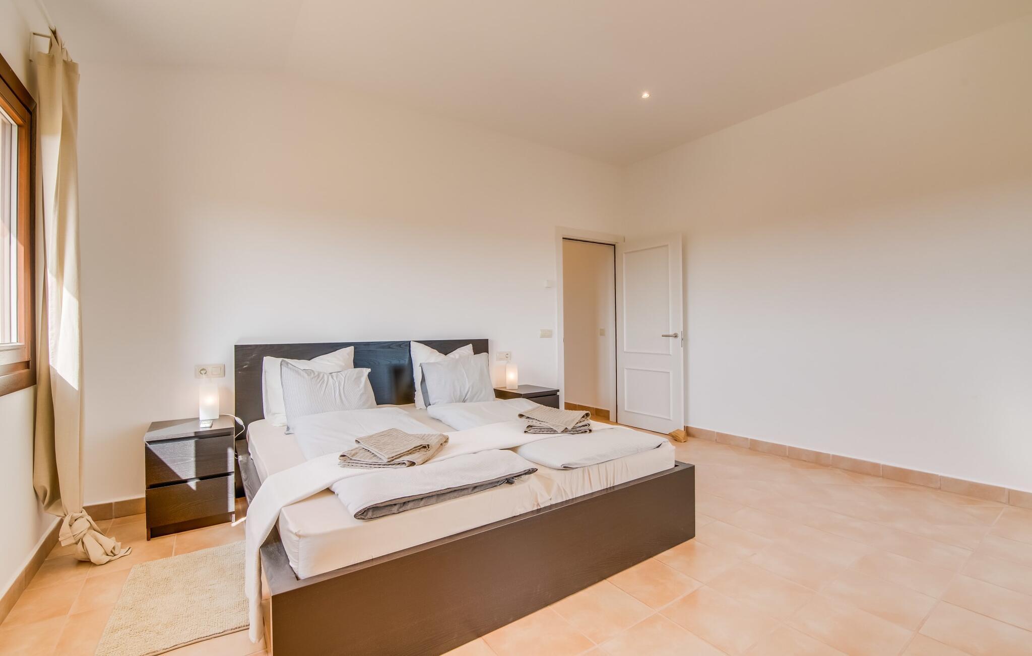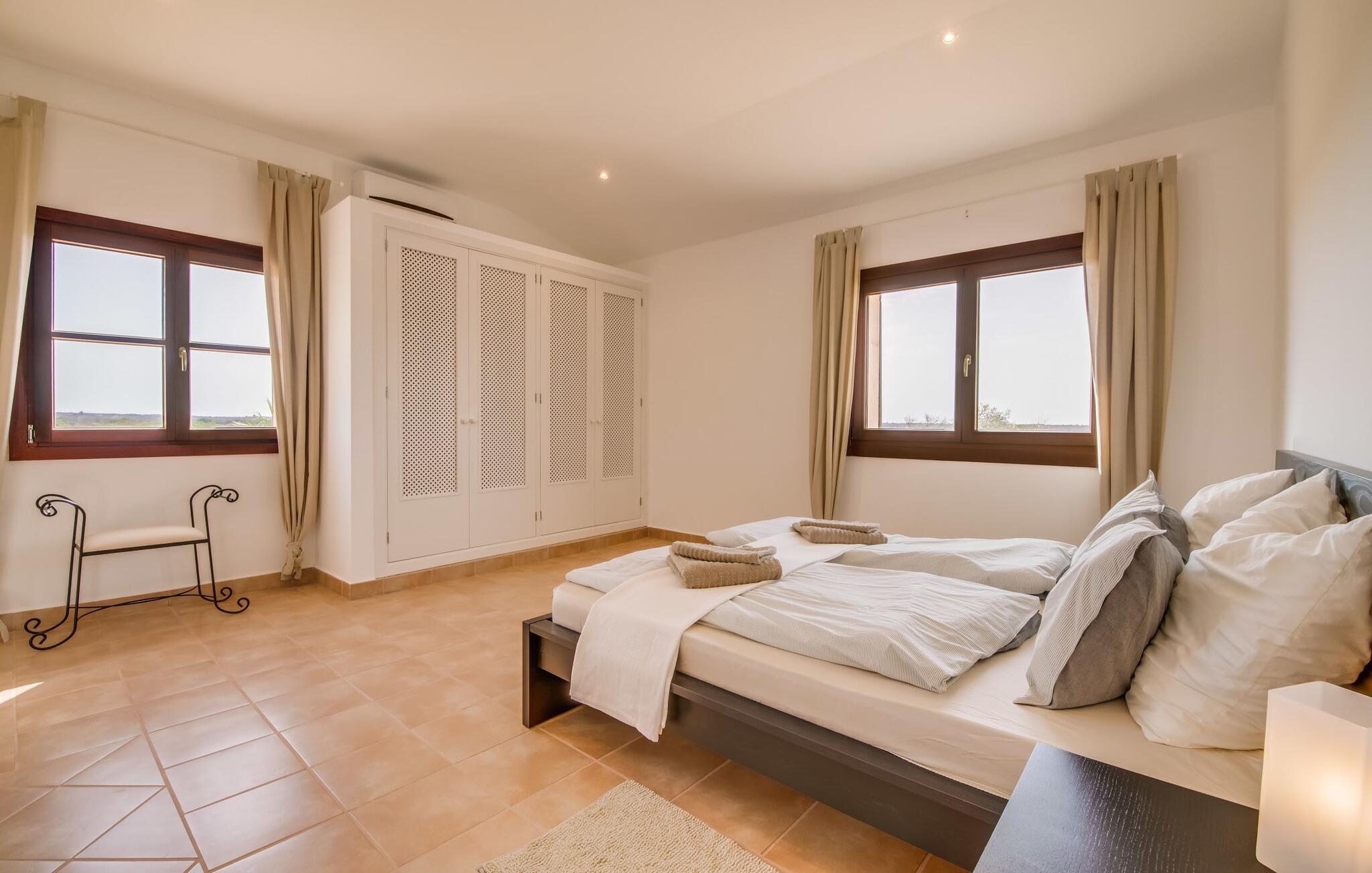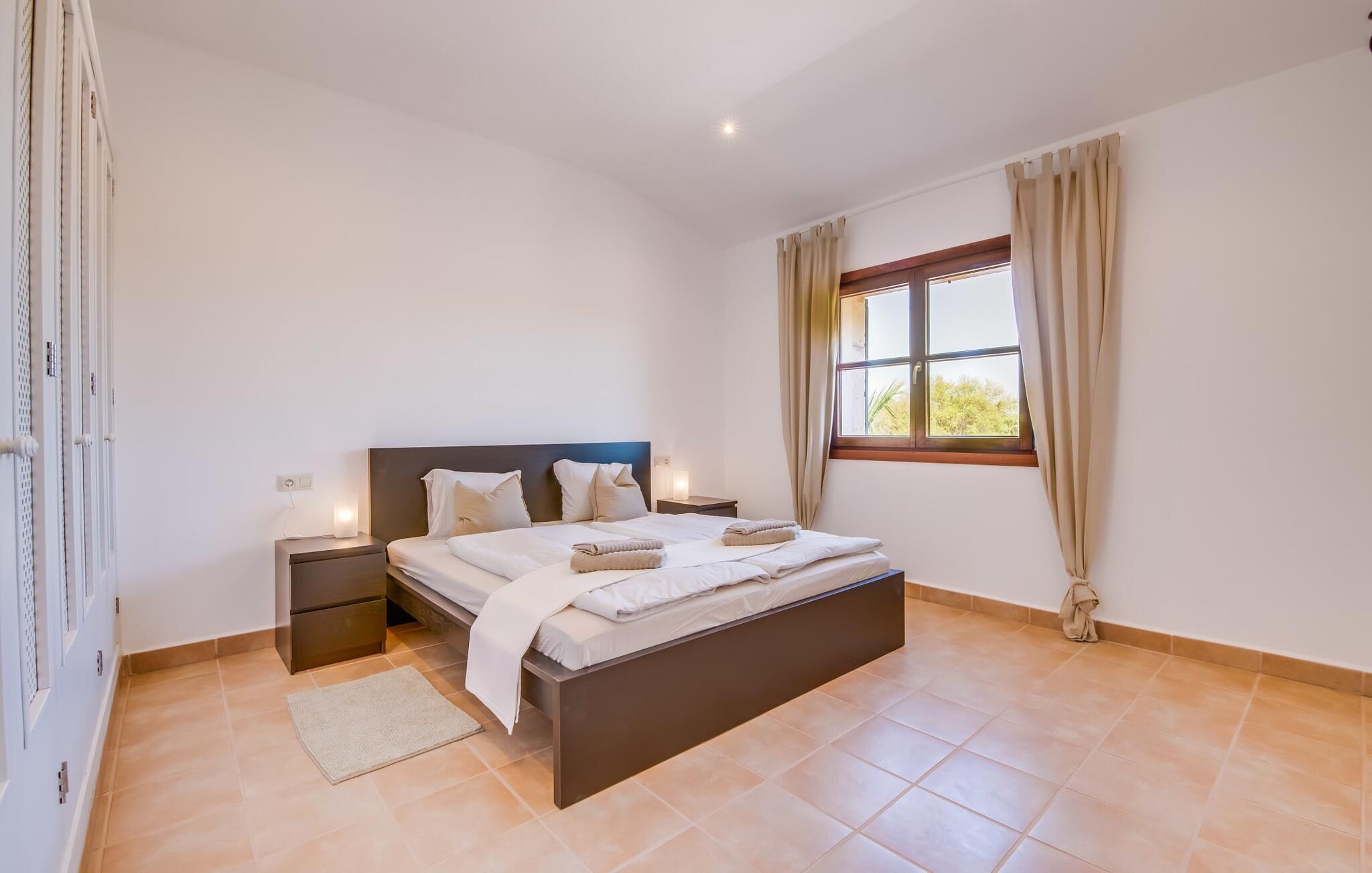 Et lille paradis i det sydlige Mallorca, "Can 66 Palmeras" er et topvalg til den ultimative sommerferie. Det fantastiske udeområde er rummeligt, velholdt og udstyret med forskellige chill-out-zoner, så alle har deres eget personlige rum til at slappe af. Omgivet af en græsplæne terrasse og 66 palmer. Et iøjnefaldende træk er den storslåede pool, der let skråner mod bagsiden og suppleres af et privat sandområde. Naturlige parasoller giver skygge og blander sig problemfrit ind i landskabet. Ved siden af poolen tilbyder et overdækket udekøkken med stengrill og siddeområde de perfekte rammer for rolige mallorcanske aftener under stjernerne. Den to-etagers naturstensvilla er indrettet i typisk middelhavsstil, og villaens hjerte er stue og spiseplads med rustik lædersofa, lænestole og et iøjnefaldende træstammebord. Det moderne køkken, som er forbundet med stuen, er fuldt udstyret til selvforplejning, og en varmende pejs giver ekstra hygge. Villaen har fire lyse soveværelser, hvoraf to har eget badeværelse. Den stilfulde finca "Can 66 Palmeras" ligger i den mangfoldige sydlige del af øen, ca. 3 km nordvest for Santanyí. Ud over supermarkeder til hverdagens behov er der også et farverigt ugentligt marked i byen samt adskillige restauranter og barer. Strandelskere kan nemt køre på 10 minutter til det smukke Cala Santanyí eller lidt længere til en af de smukke naturlige strande i naturreservatet Parc natural de Mondragó. Den fortryllende Es Trenc-strand ligger omkring 20 minutter væk i bil.