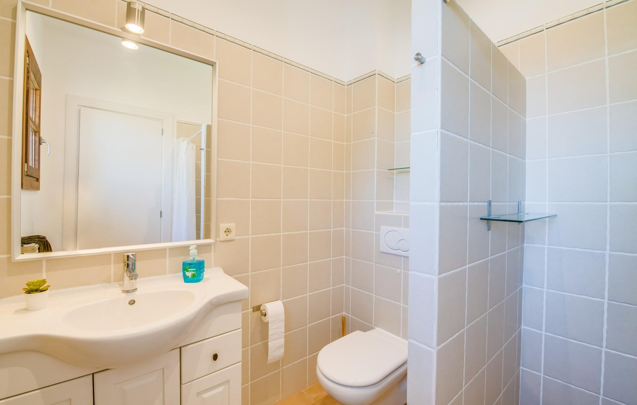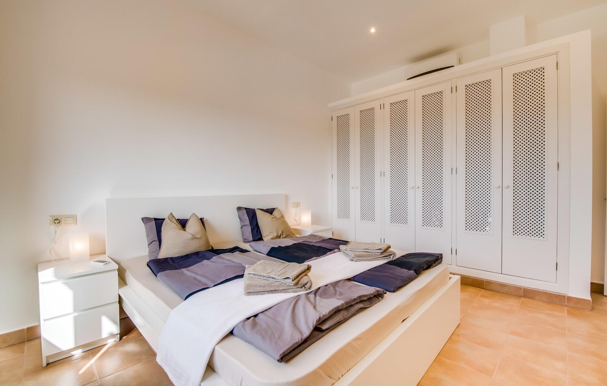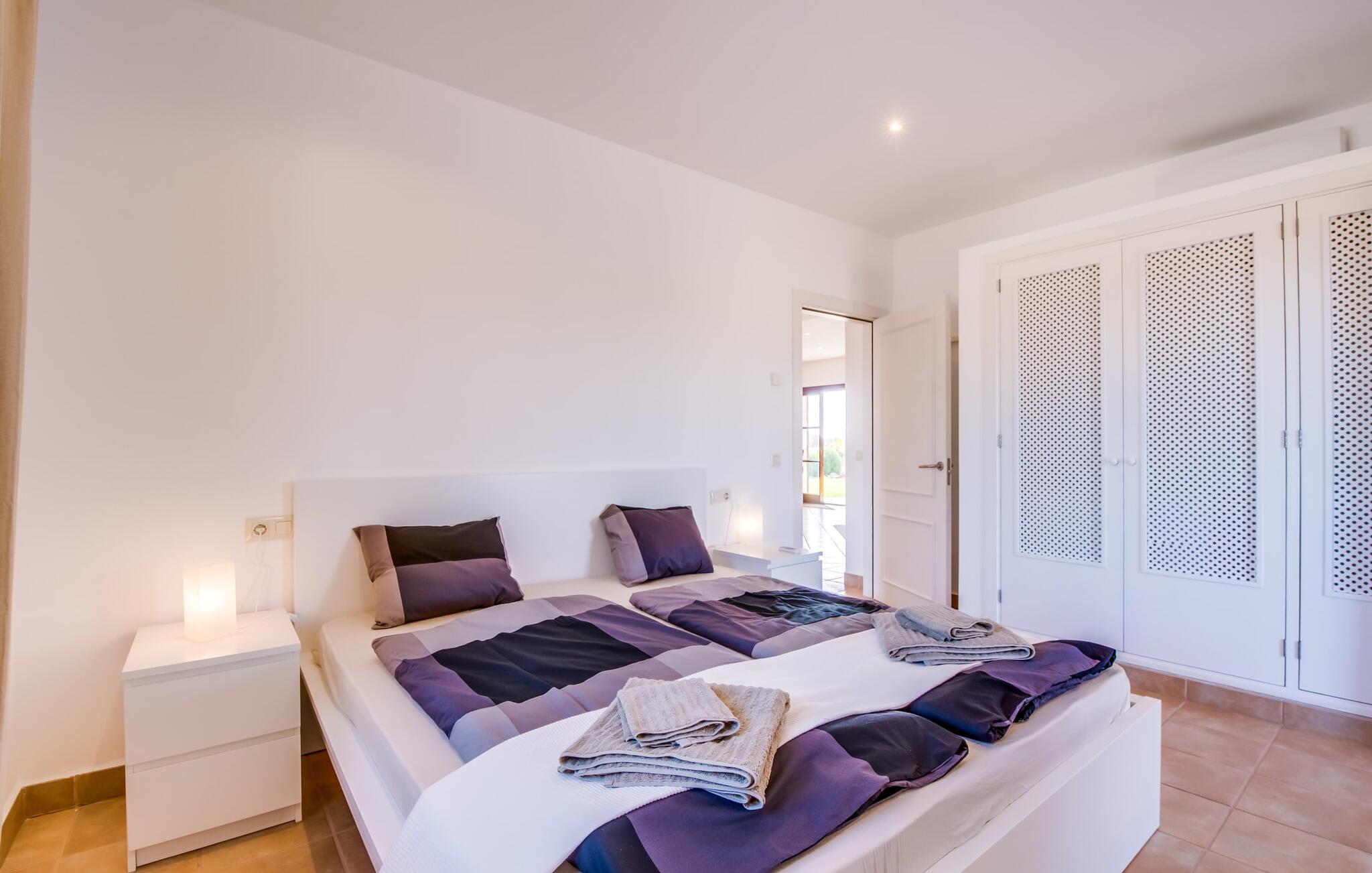 Et lille paradis i det sydlige Mallorca, "Can 66 Palmeras" er et topvalg til den ultimative sommerferie. Det fantastiske udeområde er rummeligt, velholdt og udstyret med forskellige chill-out-zoner, så alle har deres eget personlige rum til at slappe af. Omgivet af en græsplæne terrasse og 66 palmer. Et iøjnefaldende træk er den storslåede pool, der let skråner mod bagsiden og suppleres af et privat sandområde. Naturlige parasoller giver skygge og blander sig problemfrit ind i landskabet. Ved siden af poolen tilbyder et overdækket udekøkken med stengrill og siddeområde de perfekte rammer for rolige mallorcanske aftener under stjernerne. Den to-etagers naturstensvilla er indrettet i typisk middelhavsstil, og villaens hjerte er stue og spiseplads med rustik lædersofa, lænestole og et iøjnefaldende træstammebord. Det moderne køkken, som er forbundet med stuen, er fuldt udstyret til selvforplejning, og en varmende pejs giver ekstra hygge. Villaen har fire lyse soveværelser, hvoraf to har eget badeværelse. Den stilfulde finca "Can 66 Palmeras" ligger i den mangfoldige sydlige del af øen, ca. 3 km nordvest for Santanyí. Ud over supermarkeder til hverdagens behov er der også et farverigt ugentligt marked i byen samt adskillige restauranter og barer. Strandelskere kan nemt køre på 10 minutter til det smukke Cala Santanyí eller lidt længere til en af de smukke naturlige strande i naturreservatet Parc natural de Mondragó. Den fortryllende Es Trenc-strand ligger omkring 20 minutter væk i bil.