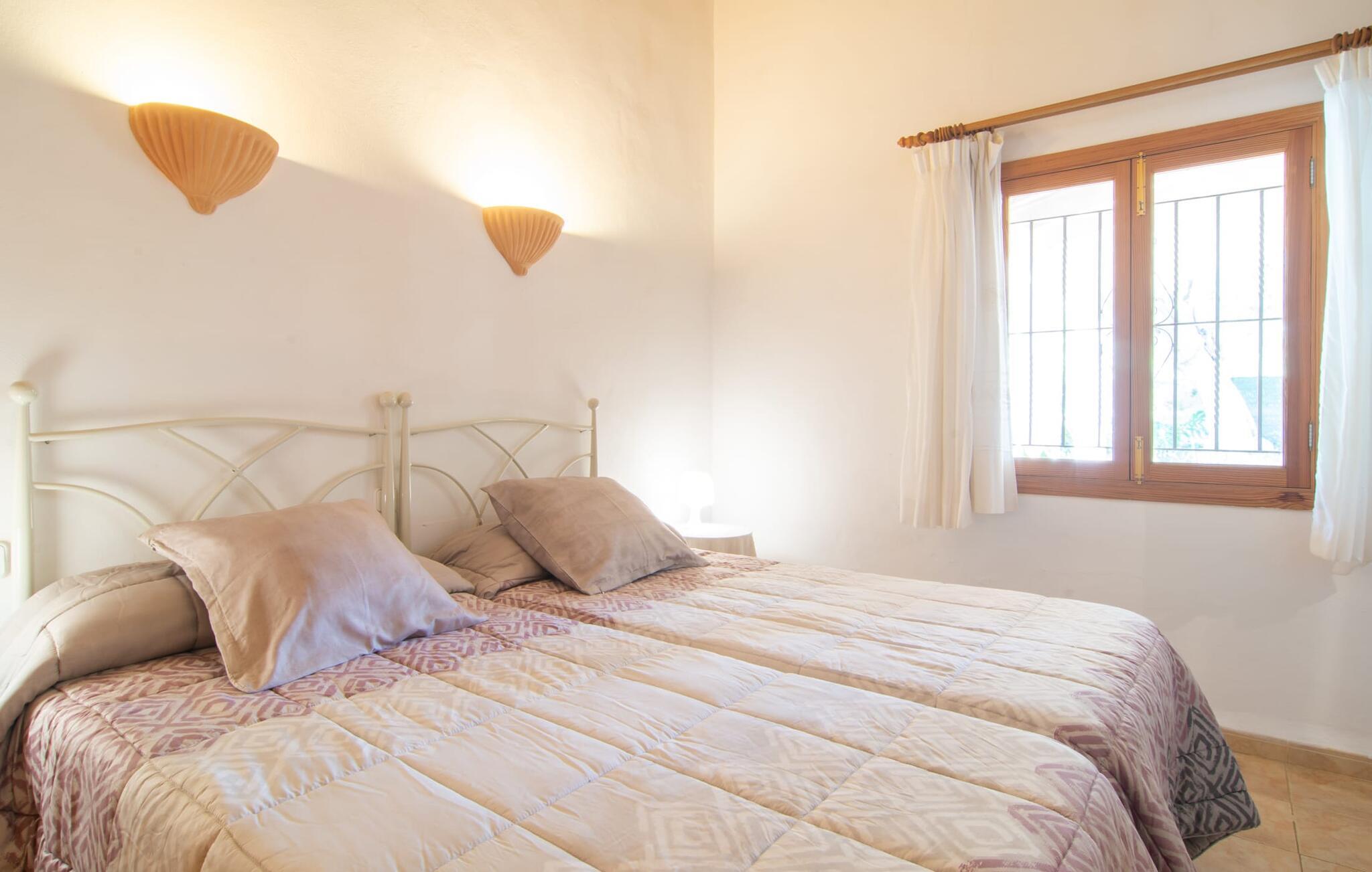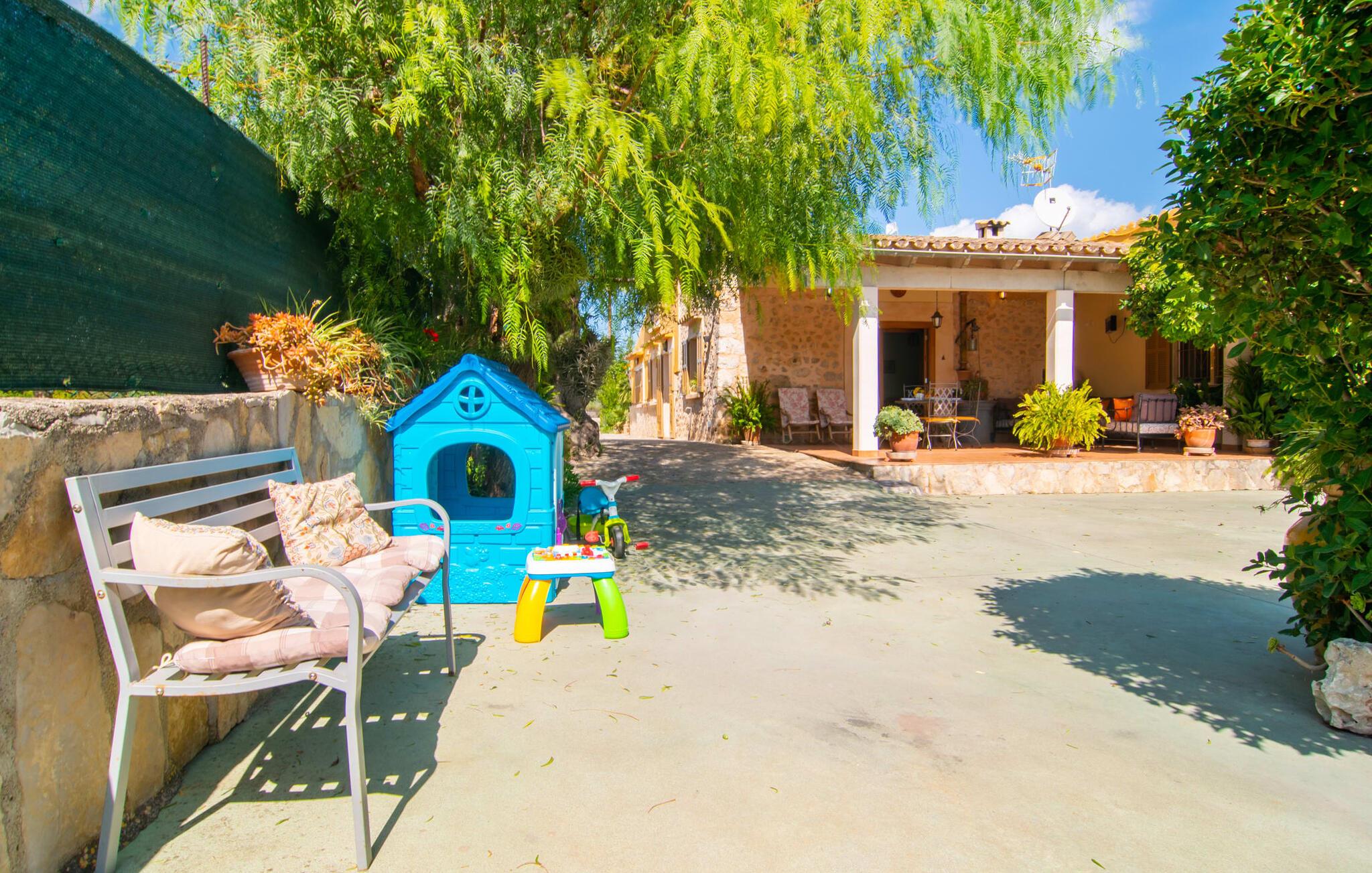 Den yderst familievenlige og prisvenlige villa "Can Aloy" er beliggende i en afsondret landlig beliggenhed. Hvis jeres familie har kæledyr, kan de også ledsage jer til villaen på ferie. Omgivet af knudrede oliventræer og typisk middelhavsvegetation finder I alt, hvad I behøver på ejendommens terrasse: en plan pool med mosaikfliser og bugtende motiver inviterer til en forfriskende svømmetur. Adgang sker via en stige eller en fire meter bred trappe i den laveste del af poolen. Poolen er indlejret i en solterrasse lavet af natursten. Udover 4 liggestole er der et enkelt siddeområde med flere stole. For at det ikke skal blive for varmt om sommeren, kan to parasoller give skygge, hvis det ønskes. Husets terrasse er tilgængelig via et brolagt område. Til venstre finder I murstensgrillen - ideel til en afslappet BBQ, hvis I kan lide at lave mad selv på ferien. På bagsiden af ejendommen har de venlige ejere af huset en køkkenhave og en frugthave. De deler gerne deres friske haveprodukter og giver jer friske, solmodne råvarer. Den anden halvdel af huset tilhører faktisk ejerne og bruges udelukkende af dem, så længe der ikke er gæster i villaen, så de kan nyde deres privatliv her. Vores favoritsted i denne villa er uden tvivl den overdækkede terrasse, hvorfra vi også har adgang til huset. Smukt møbleret med et spisebord og et komfortabelt sofasæt i marokkansk stil med sarte metalstel, kan I nyde et måltid eller en kaffepause her når som helst på dagen og slappe af. I kan læse en bog i de komfortable gyngestole og nyde stemningen med typiske mallorcanske dekorationer som smukke lanterner og et springvand, der ikke længere bruges. Adgang til huset sker via terrassen, med et centralt beliggende åbent køkken med rundt spisebord, et rigtig hyggeligt sted for familien at nyde et måltid sammen. Køkkenområdet er adskilt fra spisepladsen af en amerikansk morgenmadsbar og fire taburetter. Her finder I alt, der vil gøre jeres feriehverdag nemmere - brødrister, elkedel, kaffemaskine, mikroovn, gaskomfur, stort køleskab med fryserum og opvaskemaskine. Her er ingen fancy højglans, men alt passer sammen og er solidt, enkelt og fuldstændig funktionelt. Dette skaber en livlig blanding af stilarter i stuen med en vidunderlig hyggelig og hjemlig atmosfære. Der er også et hyggeligt opholdsområde i stuen foran fjernsynet og 2 afslappede træstole med ternede hynder foran den engang så åbne pejs, hvor en brændeovn nu giver ekstra komfort. De to dobbeltværelser er placeret på denne etage - begge udstyret med matchende nostalgiske sengerammer i hvidt metal. Der er to enkle hvide badeværelser, det ene med badekar med bruser og det andet med bruser. En noget stejl trappe fører os ind under det særligt hyggelige skråtag, hvor der er et hyggeligt 3-sengs værelse. Ideel til jeres børn, der kan lide at have gulvet for sig selv. På grund af tagets højde er dette værelse ikke egnet til små børn, ældre eller bevægelseshæmmede. For børn i skolealderen er det et absolut paradis. Med sin indtagende individualitet og hygge passer denne villa perfekt ind i de autentiske omgivelser i Búger. Selve distriktet bruges delvist af de lokale mallorcanere som køkkenhave og som små gårde med får eller andre husdyr. I er garanteret at nyde jeres ferie her, ved porten til den lille by Búger væk fra masseturismen. Búger ligger kun få minutter væk i bil. I kan nå landsbyen på cykel eller endda til fods. Búger er den mindste by på Mallorca og tilbyder jer stadig alt, hvad I har brug for. Denne søvnige, dejlige landsby har ikke hørt om masseturisme, men dens autenticitet passer ind i den autentiske mallorcanske tradition. Der er en smuk vandresti omkring Búger med grønne dale, stejle kyster og solide klippesider. Villaen "Can Aloy" passer perfekt til denne atmosfære. Det er tæt på hovedvejen - som I kan høre - der strækker sig fra hovedstaden Palma, cirka 40 km væk i den sydvestlige del af øen, til den nordøstlige by Alcúdia og bugten af samme navn. På kun en kort køretur kan I nå mange steder, der er værd at se, samt Alcúdia-bugten med sine fine sandbugter. Vi hos Fincallorca ønsker jer et behageligt og varieret ophold med god tid til at slappe af og nyde den hjemlige atmosfære i den lille fine villa "Can Aloy". Den delikate villa "Can Aloy" ligger i smukke landlige omgivelser, ca. 1 km fra porten til Búger. Her kan I gøre jeres daglige indkøb eller besøge en af barerne eller restauranterne. Det ugentlige marked finder sted i San Pobla om søndagen. De smukke strande i nord, især dem ved Alcúdia-bugten, er nemme og hurtige at nå med lejebil.