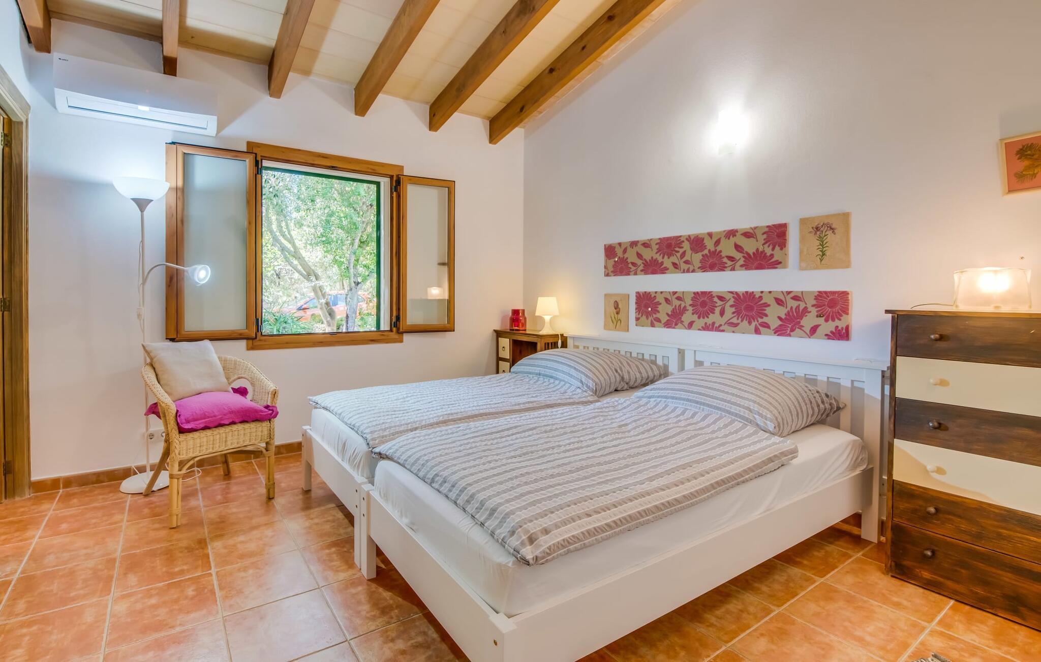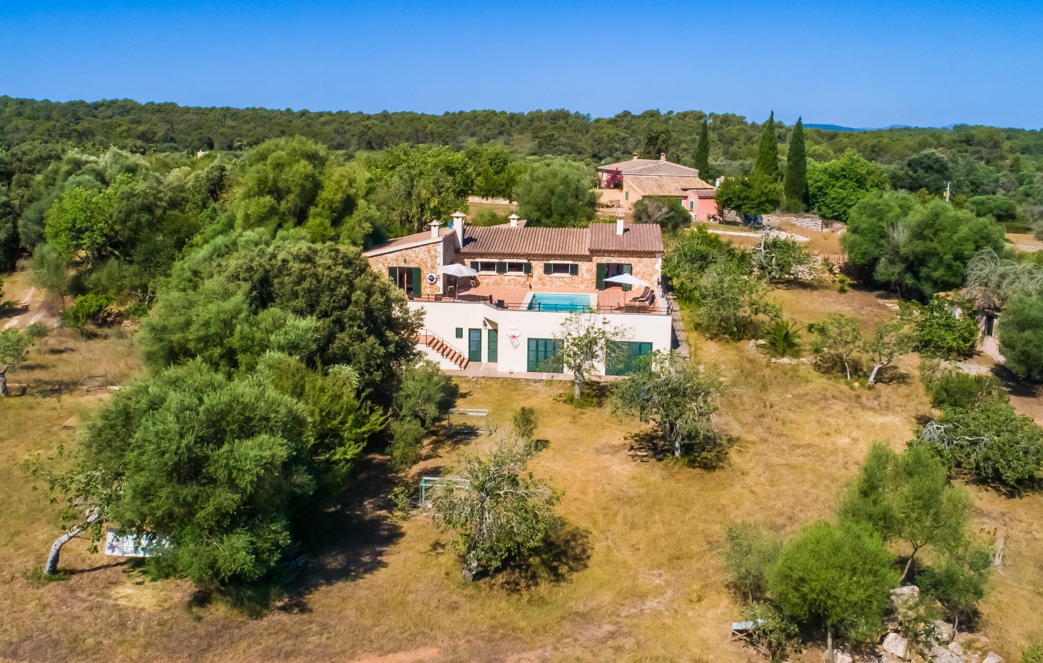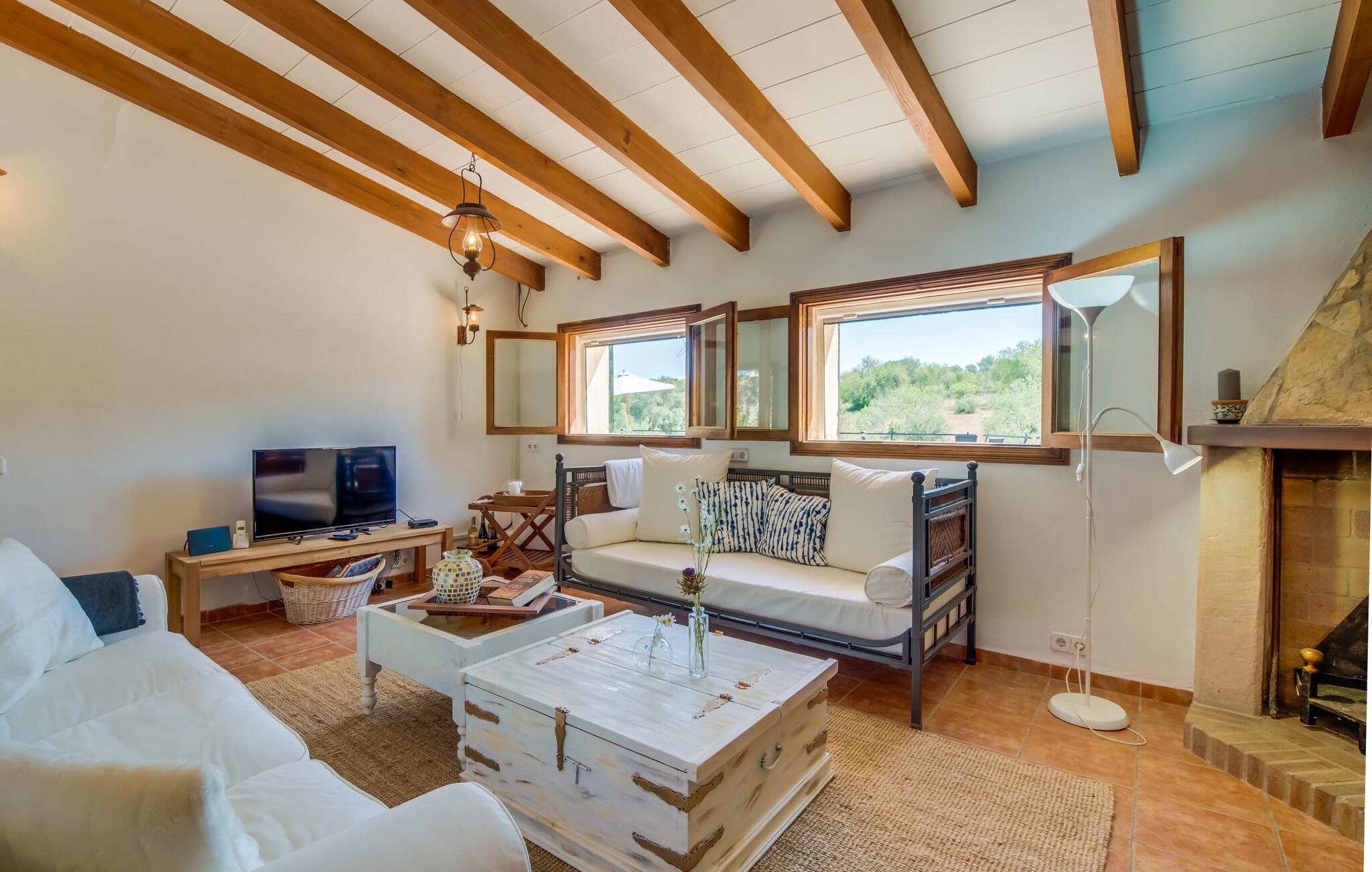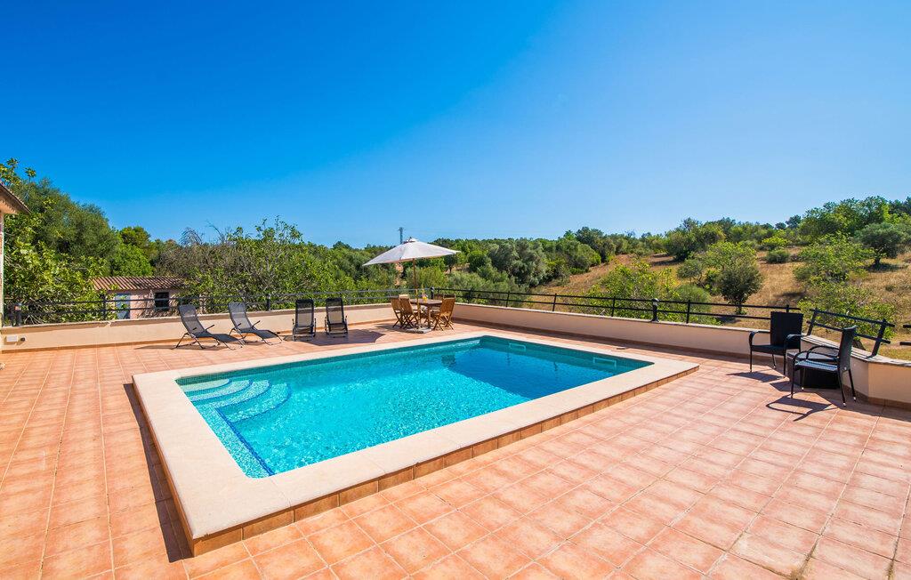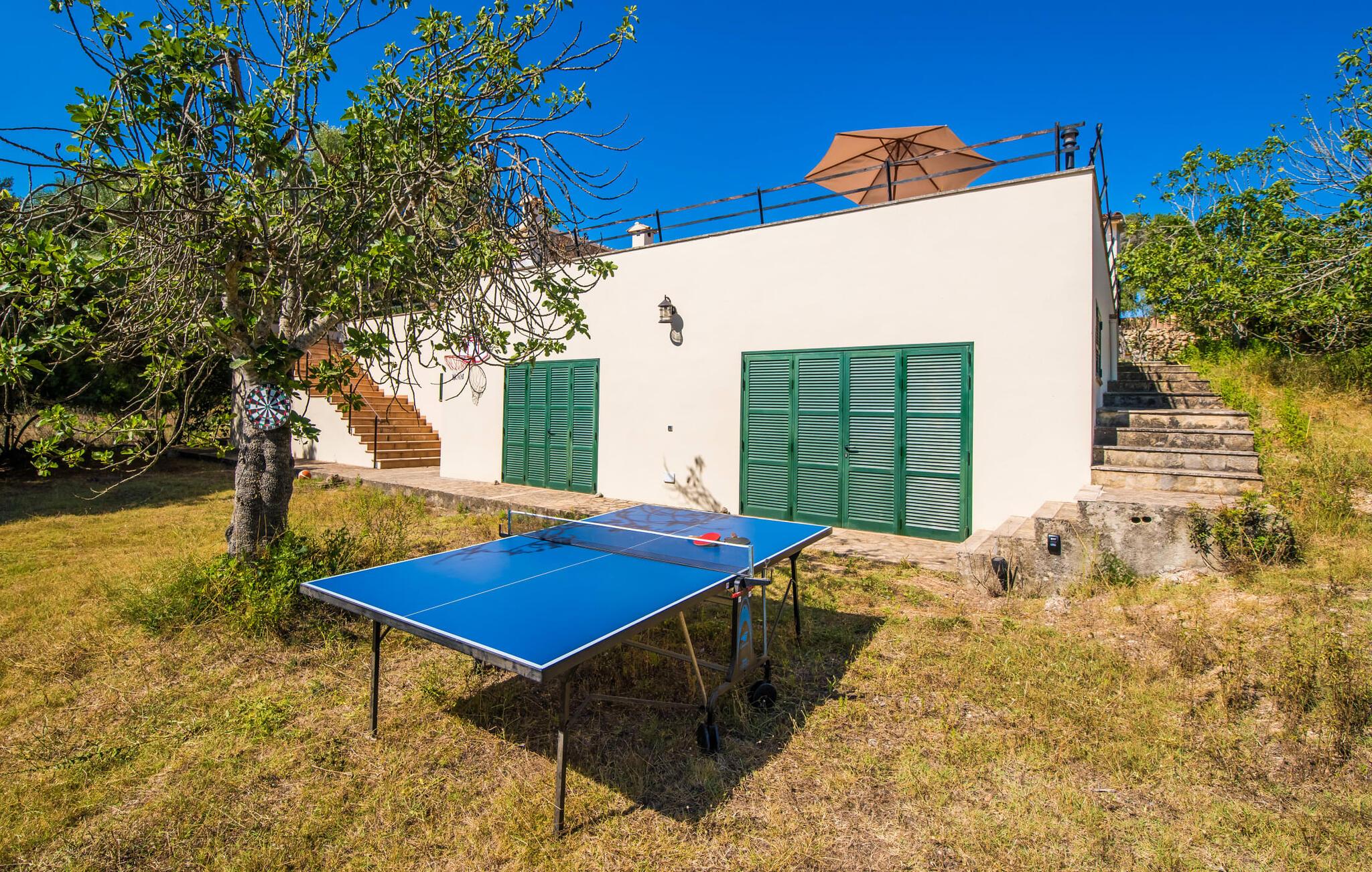 Beliggende på en svag skråning tilbyder feriehuset "Can Baldo" et fortryllende tilflugtssted i hjertet af Mallorca. Det primære opholdsområde har en charmerende naturstensfacade og byder på en betagende udsigt over det omkringliggende landskab med fyrretræer og marker. Den ekspansive poolterrasse er perfekt til at nyde smukke solopgange og private solbadningsøjeblikke. Hyggelige naturstenterrasser på bagsiden inviterer jer til at slappe af i skyggen. Ejendommen har en stor have med fodboldmål, en basketballkurv og et bordtennisbord. Det primære opholdsrum har en lys, åben grundplan med en hyggelig stue med pejs og direkte adgang til terrassen ved poolen. En indbydende spiseplads forbinder en af naturstensterrasserne, mens det lyse køkken har egen spiseplads og adgang til poolen. På dette niveau er der tre soveværelser med dobbeltsenge, hvoraf to har en-suite badeværelser, og et separat badeværelse. Fra haven er der adgang til et fjerde soveværelse med dobbeltseng og håndvask. Huset er udstyret med aircondition og varme, hvilket gør "Can Baldo" ideel til to familier eller venner, der ønsker at tilbringe en afslappende ferie sammen. Denne meget hyggelige bondegård ligger kun 6 km sydøst for den rolige landsby Sencelles. I en vidunderlig rolig beliggenhed er det et ideelt udgangspunkt for at udforske det mangfoldige Mallorca. Sencelles er ideel til daglige indkøb, og det ugentlige marked på Placa Nova med sine friske produkter er også et besøg værd. De fine sandstrande på den sydlige del af øen, herunder Cala Estancia, Platja de Palma og Cuidad Jardin, er omkring 30 minutter væk i bil.