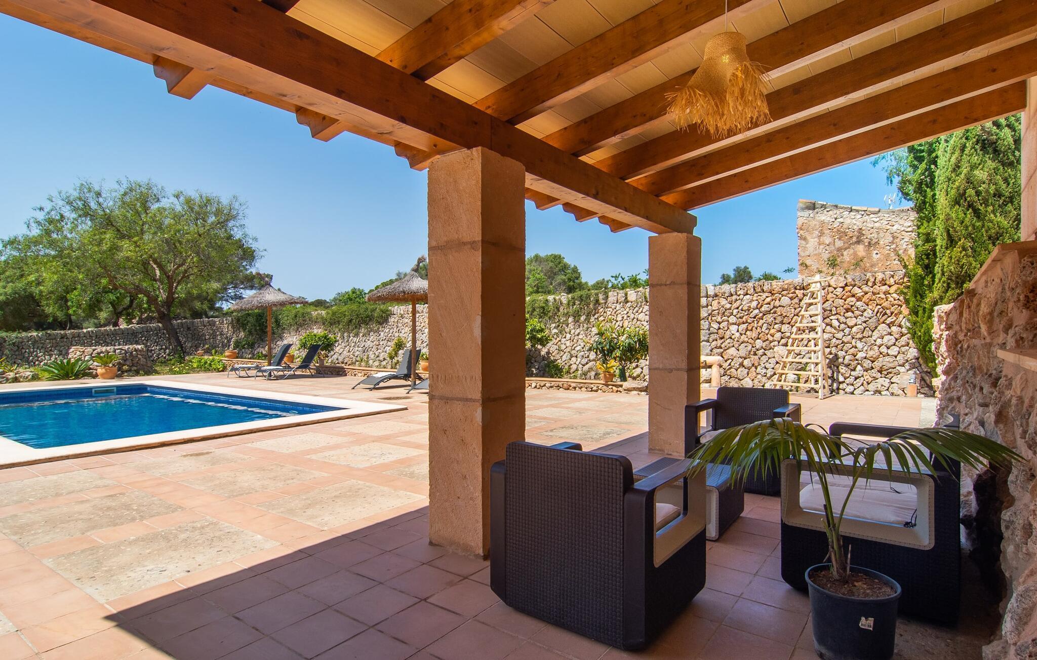 Villaen "Can Ballester" er i en meget rolig beliggenhed og vil være din oase for afslapning! Den rummelige og til dels romantiske ejendom er oversvømmet med træer, masser af grønt og et fantastisk stenlook - her er det bestemt nemt at slukke. Det rummelige udendørsområde giver dig en række muligheder for at dagdrømme og slappe af direkte under den mallorcanske himmel eller i den køligere skygge. De mange forskellige blomster i deres unikke glas giver ekstra blikfang i denne indbydende atmosfære. Der er flere liggestole til rådighed, som du kan slappe af i - og du kan køle af i den udendørs bruser eller poolen. Grundet sit store areal tilbyder ejendommen plads til flere generationers aktiviteter: Mens nogle vil slappe af, kan andre løbe uforstyrret rundt. Glæd dig til en tilfredsstillende ferie med sol, vand, afslapning, sjov og action! Udover den lyseblå flisebelagte swimmingpool har huset forskellige udendørs borde og stole placeret i små nicher, hvilket gør det til det perfekte sted til familiens måltider. Sæt dig i det overdækkede udekøkken med grill og nyd lækkerierne i godt selskab. Som en sidebemærkning er det blå drivhus, du ser i videoen, tomt og ikke længere i brug. "Kom ind og føl dig hjemme!" er, hvad den stilfulde "Can Ballester" synes at råbe til sine gæster. Når du træder ind i huset, finder du dejligt lyse rum, der er udstyret med matchende, komfortable møbler, og hvor du straks vil føle dig hjemme. De rummelige værelser er indrettet i lyse farver og er fordelt på to etager, så der også inde i villaen tilbydes adskillige afslapningsmuligheder. Hver etage har en selvstændig enhed - perfekt til flere familier eller en familie med flere generationer! I det muntre ternede køkken (der matcher klinkegulvet i spisepladsen!) kan I mødes for at hakke grøntsager sammen - og måske opdage et eller to madlavningstricks fra hinanden. Derudover finder du al moderne teknologi indenfor, lige fra fjernsyn (fire tv i huset) til DSL internetadgang til musik- og dvd-systemer. De stilfuldt indrettede dobbeltværelser har alle eget badeværelse, hvor det originale flisetema kombineres med moderne stil. Denne fantastiske villa tilbyder dig alle de muligheder, du kunne ønske dig fra en feriedestination: først slappe af, så drøm, så tag en svømning eller fest med venner. Kunne du tænke dig at arrangere en fest eller et møde for op til 50 personer? I denne villa er alle muligheder åbne for dig! Inden for en radius af 8 km finder du et supermarked og også et ugentligt marked. Desuden ligger den nærmeste strand kun 13 km væk. Du kan gøre noget anderledes hver dag: Vælg mellem stranden, swimmingpoolen, en grill, slappe af ved poolen - eller måske vil du bare læse en god bog. Villaen "Can Ballester" er malerisk beliggende i kommunen Llucmajor. Ejendommen ligger i et fantastisk landskab, og landsbyen Llucmajor ligger kun 7,5 km derfra. Bare vandre rundt i dette smukke miljø og gøre dine daglige indkøb i Llucmajor. På grund af den centrale beliggenhed kan du ikke kun køre til Palma, 20 km væk, og se seværdighederne der, men også besøge en af de mange strande inden for få kilometer. Du har derfor valget mellem poolen ved villaen eller den nærmeste strand "Platja de Sa Rapita", ca. 13 km væk. Dette er et Fincallorca feriehus.
