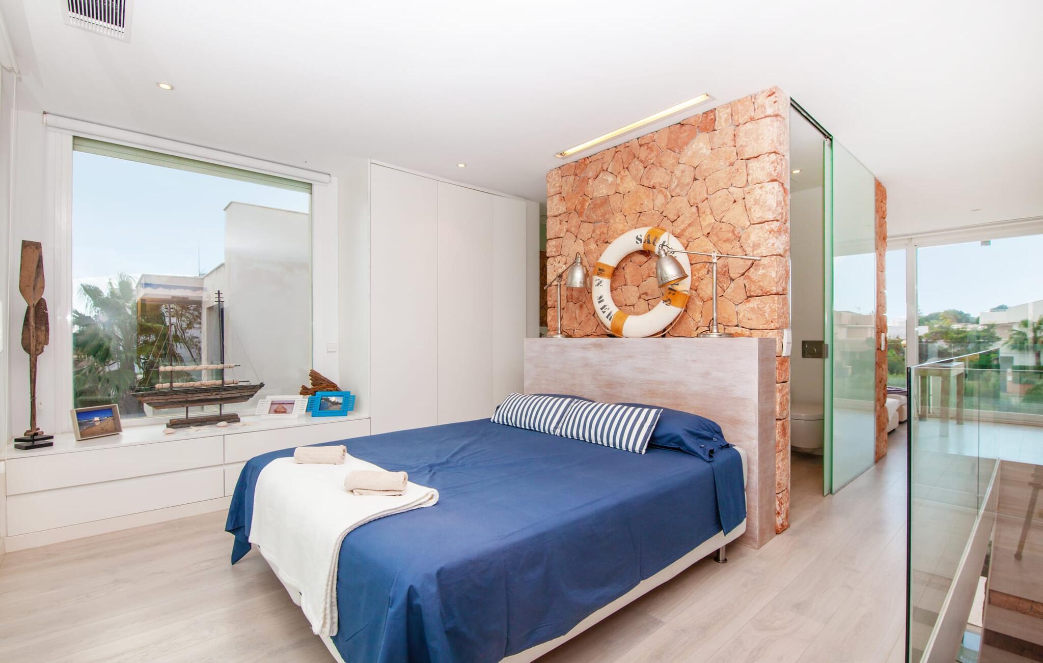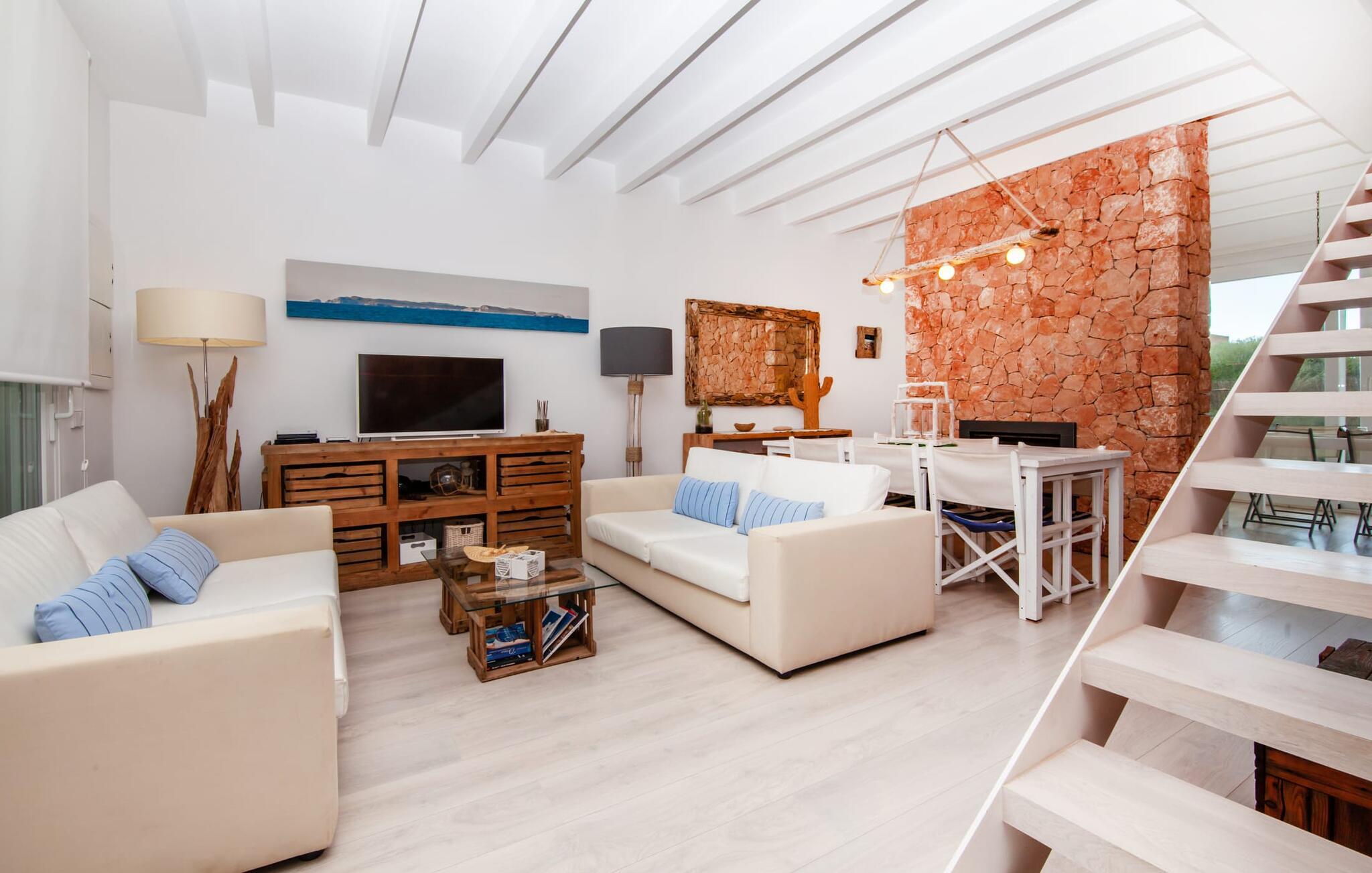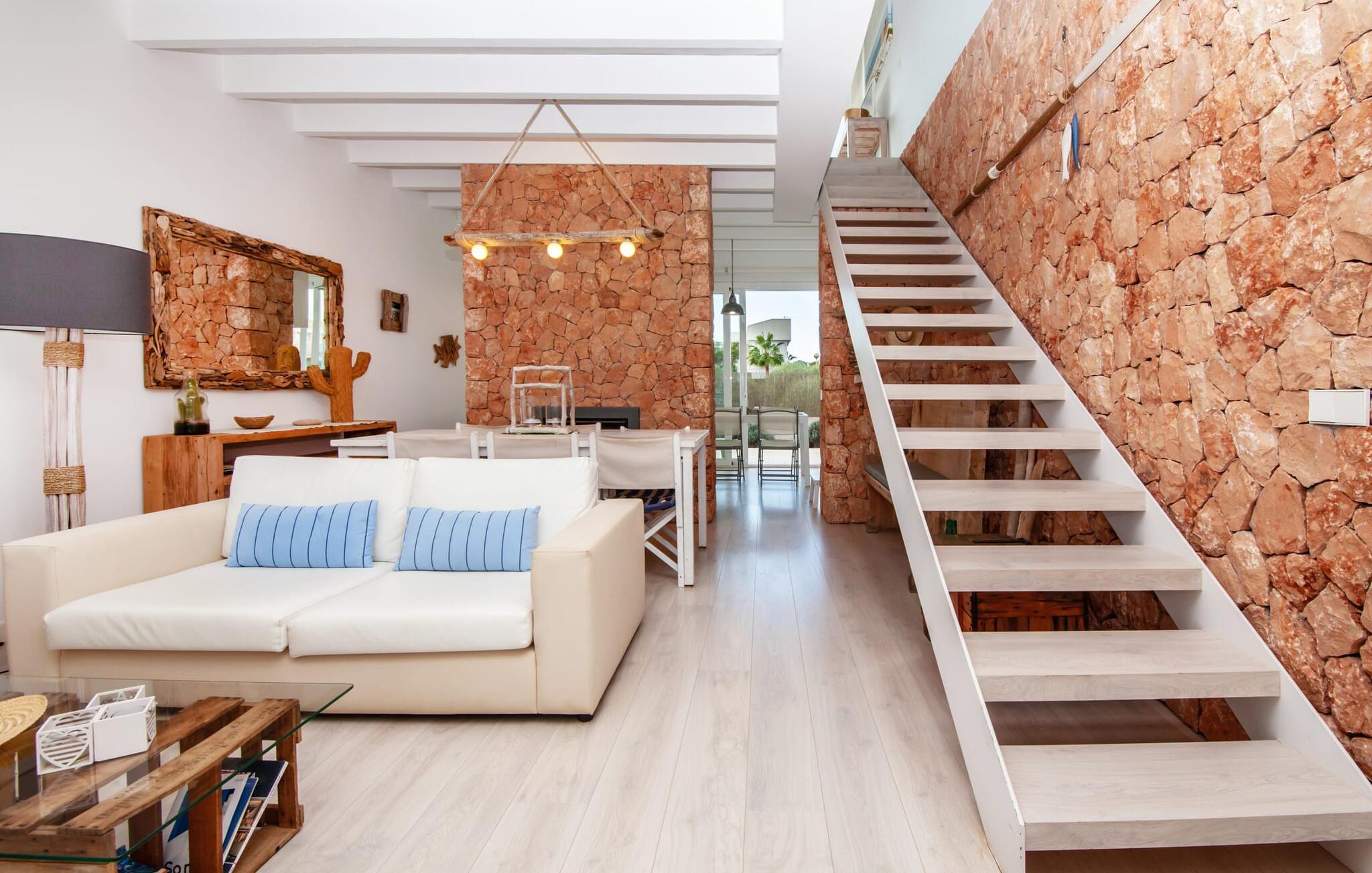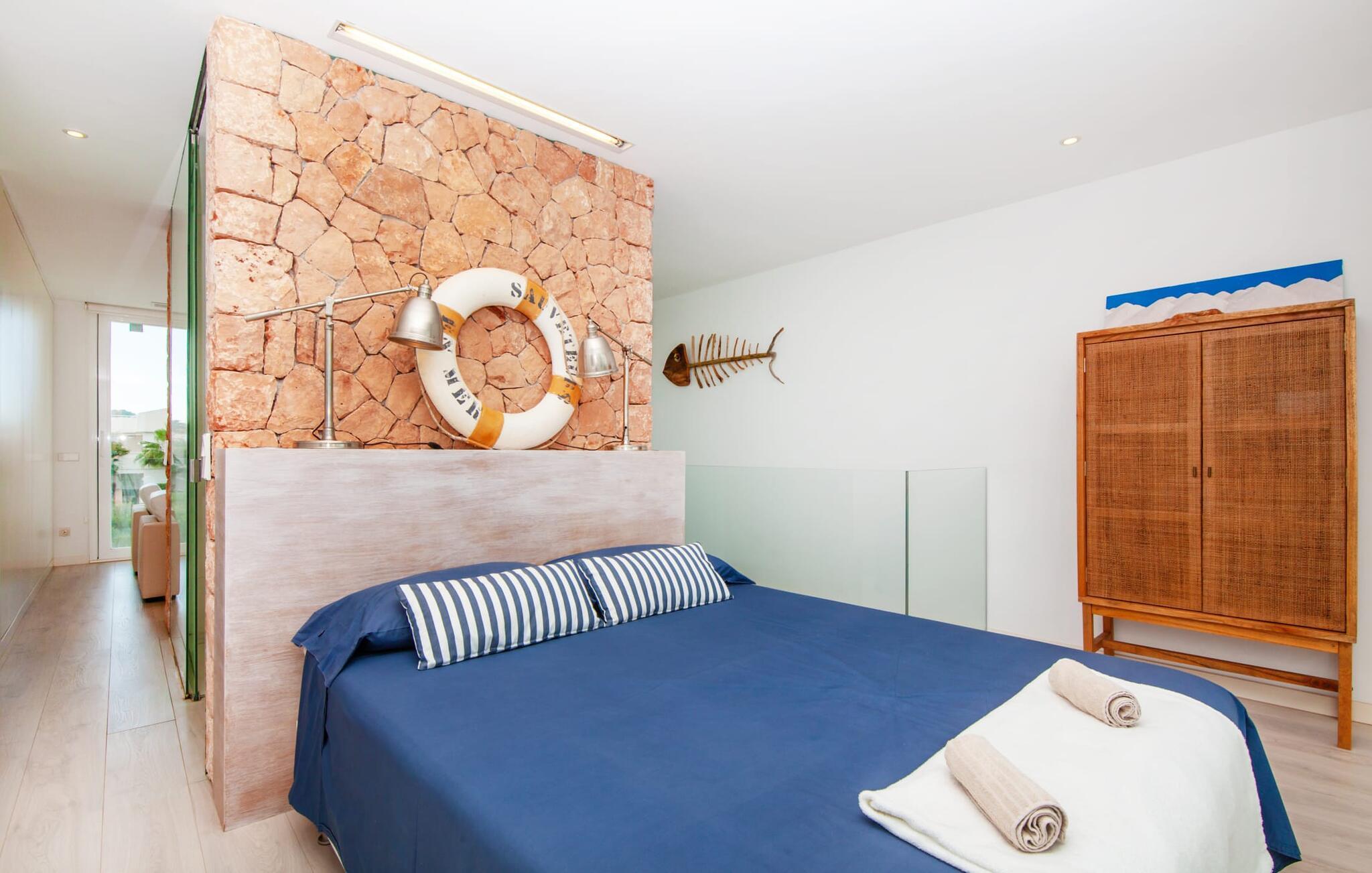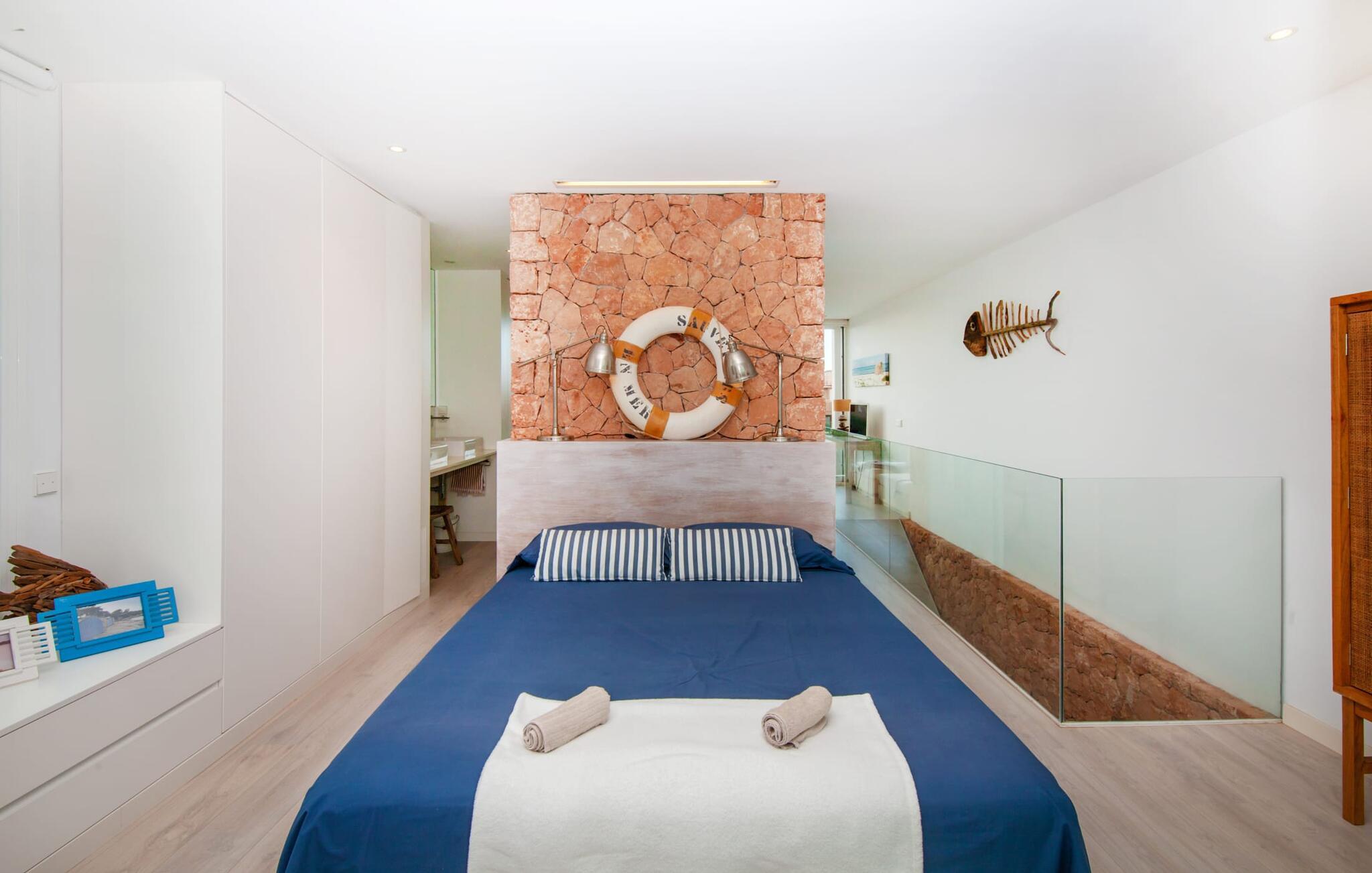 Denne kubeformede bondegård på Mallorca er et vidunderligt sted for ubekymrede ferier ved havet. Den umiddelbart iøjnefaldende tilbygning med naturstensfacade kendetegner det stilrene hjem, som sigter mod at være én ting frem for alt: Individuelt. Plæner og en væg med privatlivsskærme præger udendørsområdet, hvis centrum er den aflange pool. Det lover vidunderlig afkøling på varme dage og er meget let at nå via trapper. Komfortable liggestole fås til alle soldyrkere, som blot kan placeres på jeres yndlingssted, og hvorfra I kan nyde ferielivet i fulde drag. Den let hævede terrasse direkte ved huset har en indbydende chill-out lounge med udsigt til haven og poolen. På den anden side af huset byder en anden veranda på et tilsvarende hyggeligt sted, i dette tilfælde bekvemt placeret direkte foran køkkenet. Et originalt udtænkt og designet interiør byder jer velkommen, når I træder ind i den behageligt lyse villa "Can Bosquerro". Den solide, rødligt glitrende natursten fortsætter her og sætter både effektive og æstetiske accenter i rummenes vidunderlige maritime flair. Stue-spisestue og køkken smelter sammen i en halvåben planløsning, der skaber en flydende overgang mellem brugsområderne. Komfort og funktionalitet er lige vigtige. Alle mulige unikke detaljer forstærker denne individuelle, moderne atmosfære yderligere. To hyggelige soveværelser - et med dobbeltseng og et med køjeseng - samt et brusebad (installeret i det største af de to soveværelser) fuldender stueetagen. Den øverste etage er domineret af et rummeligt soveværelse med opholdsstue og privat badeværelse. Herfra har I udgang til den skønne altan, hvor jeres første kaffe om morgenen med sikkerhed smager lige så lækkert som en solnedgang. Denne villa på Mallorca er et sandt lykketræf for alle, der ønsker at tilbringe deres ferie tæt på stranden, æstetisk og af høj kvalitet. Dette æstetiske feriehus på Mallorca scorer med sin attraktive beliggenhed tæt ved havet - stranden og havnen ligger i gåafstand. Den originalt designede villa ligger desuden bekvemt direkte på en lille stille gade og er derfor ideelt forbundet med forskellige udflugtsmål. Sa Ràpita har en attraktiv infrastruktur med restauranter og indkøbsmuligheder. Nærheden til andre smukke strande, herunder Es Trenc eller Ses Covetes, afrunder beliggenhedsfordelene.